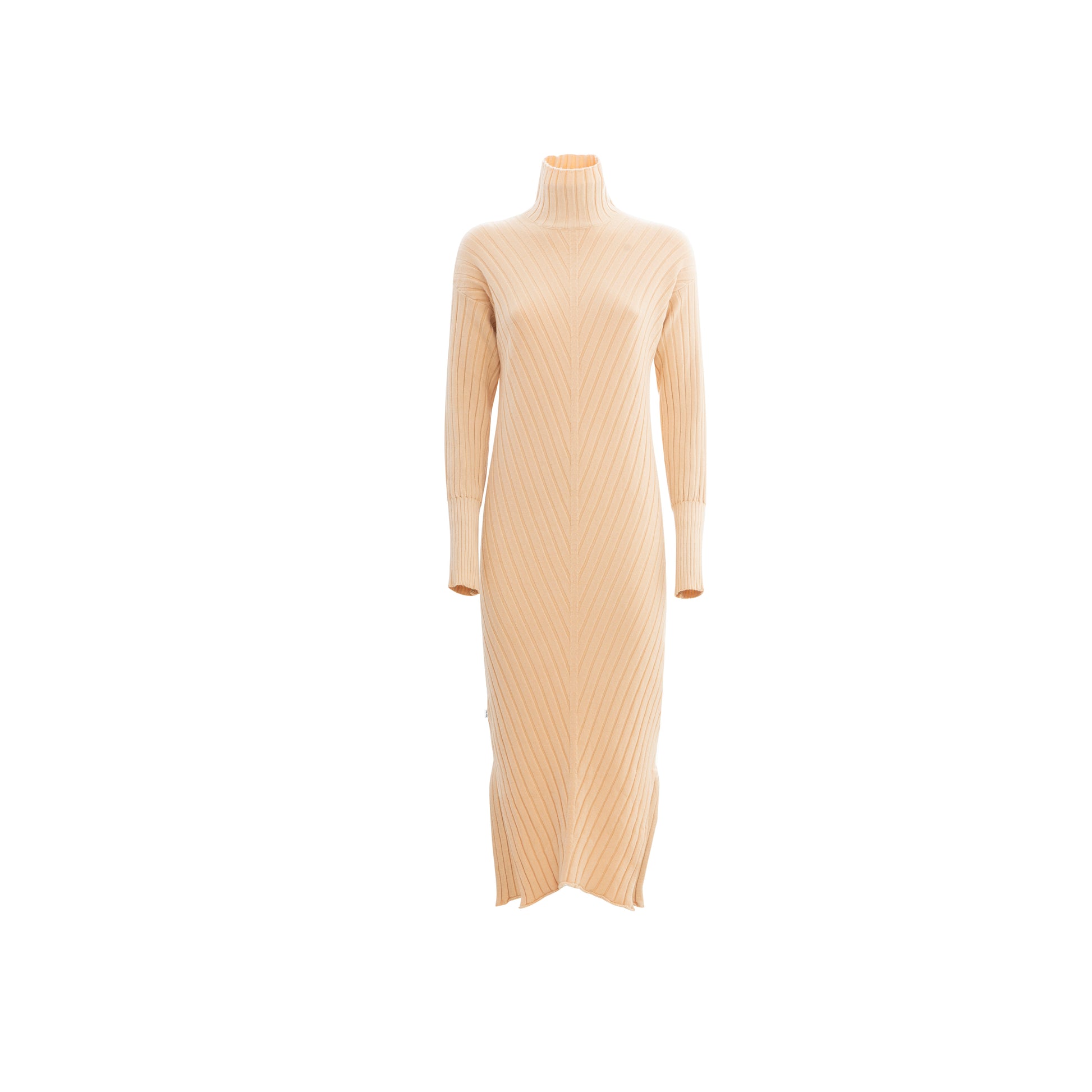Fitted midi length dress in beige, all knitted with high neck