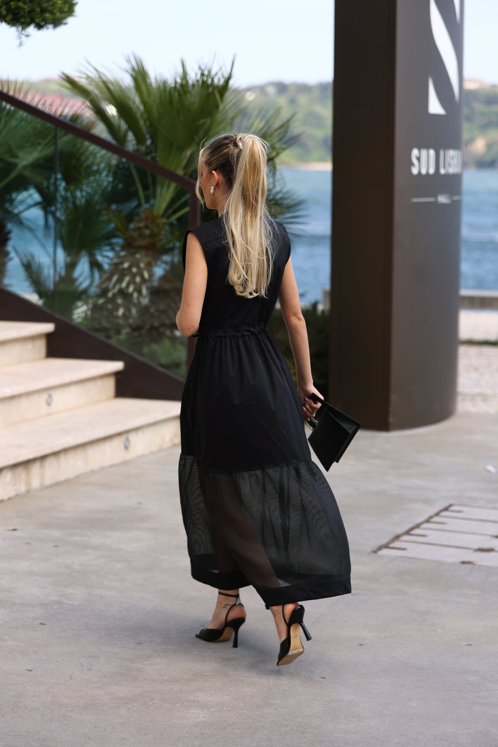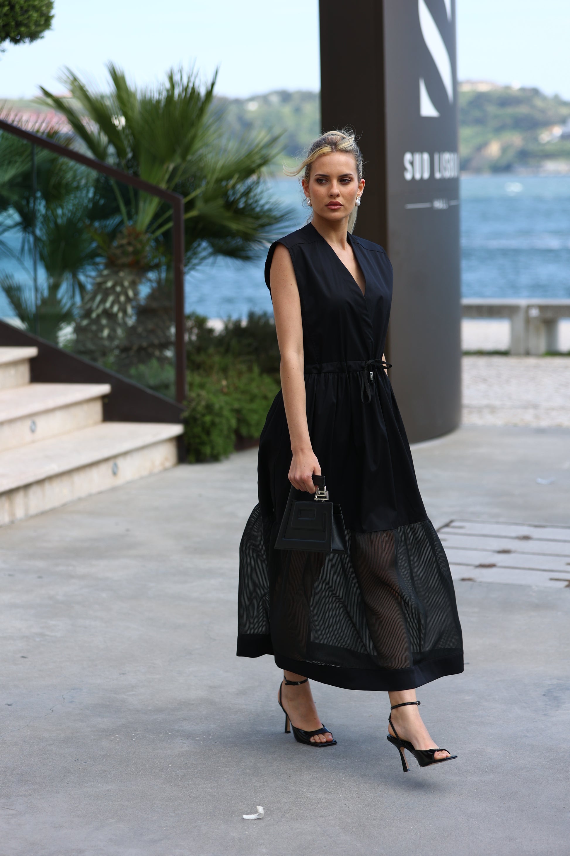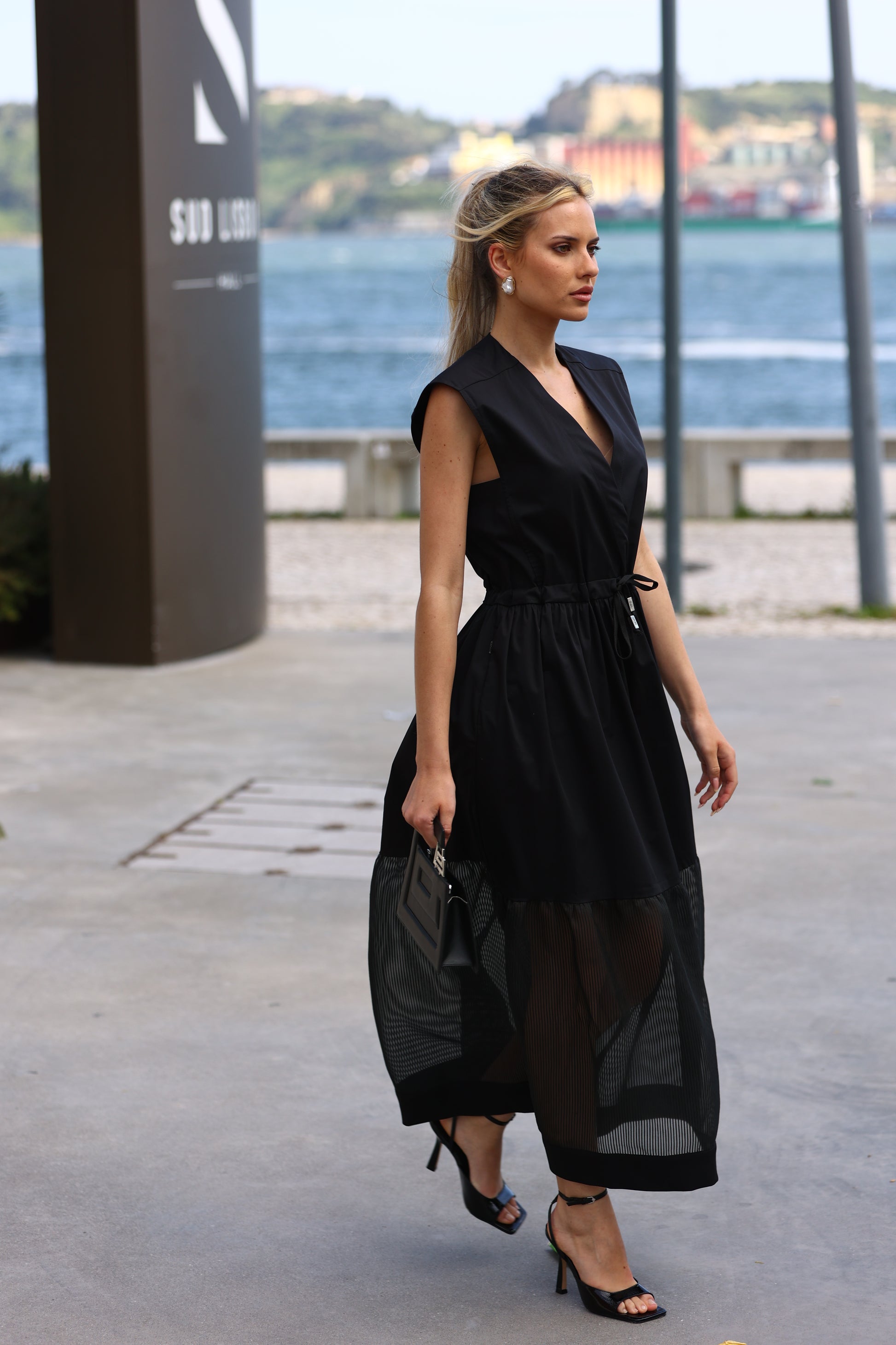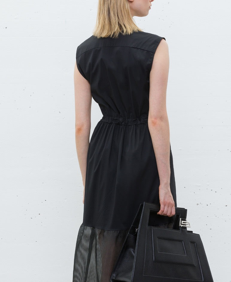 Vestido midi sem mangas com decote em V e modelagem reta, ideal para looks modernos e confortáveis. A peça conta com cintura ajustável por cordão e detalhe em tecido translúcido na parte inferior da saia, criando um efeito sofisticado e contemporâneo. O contraste de texturas dá um toque único à peça.