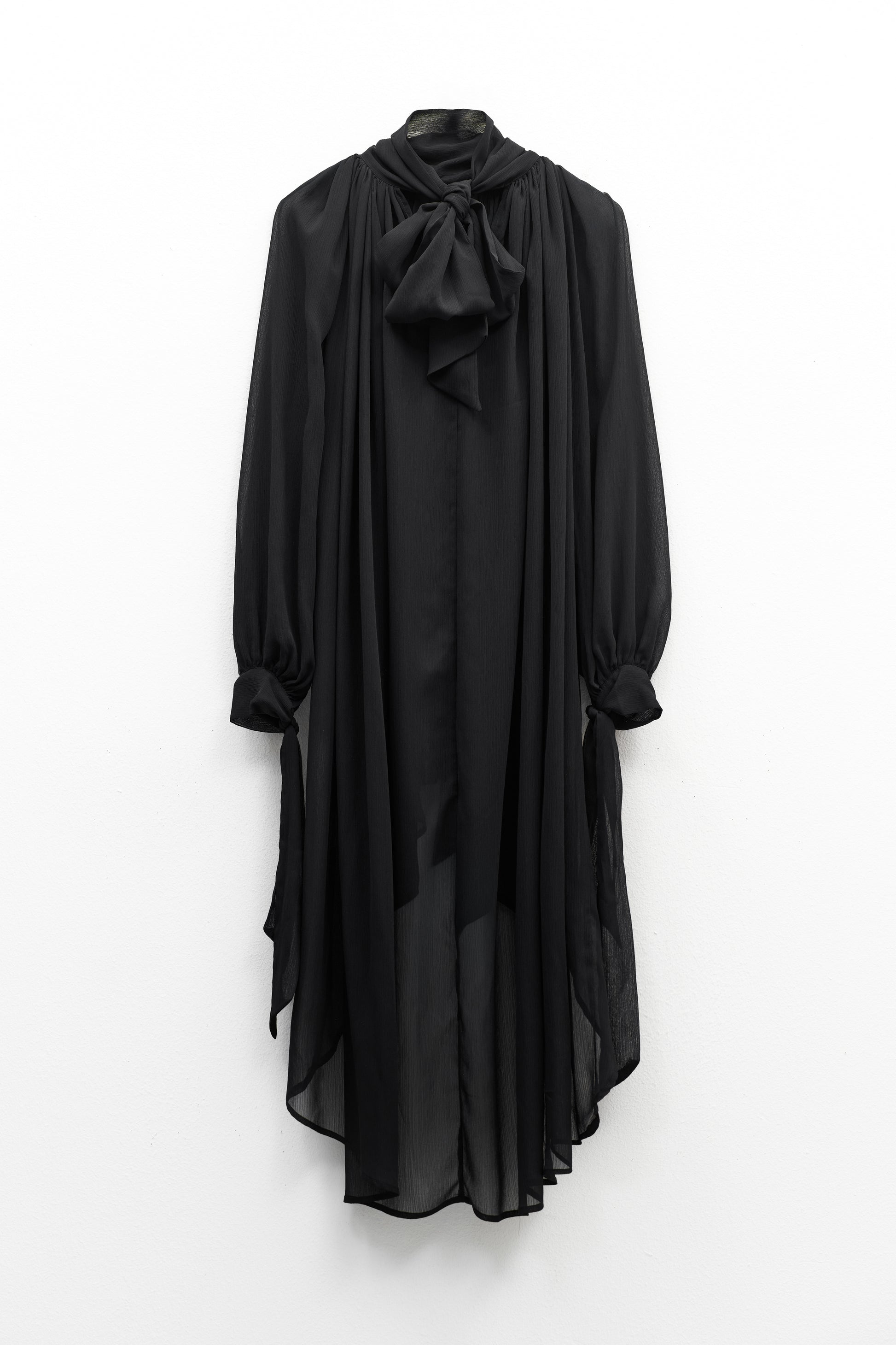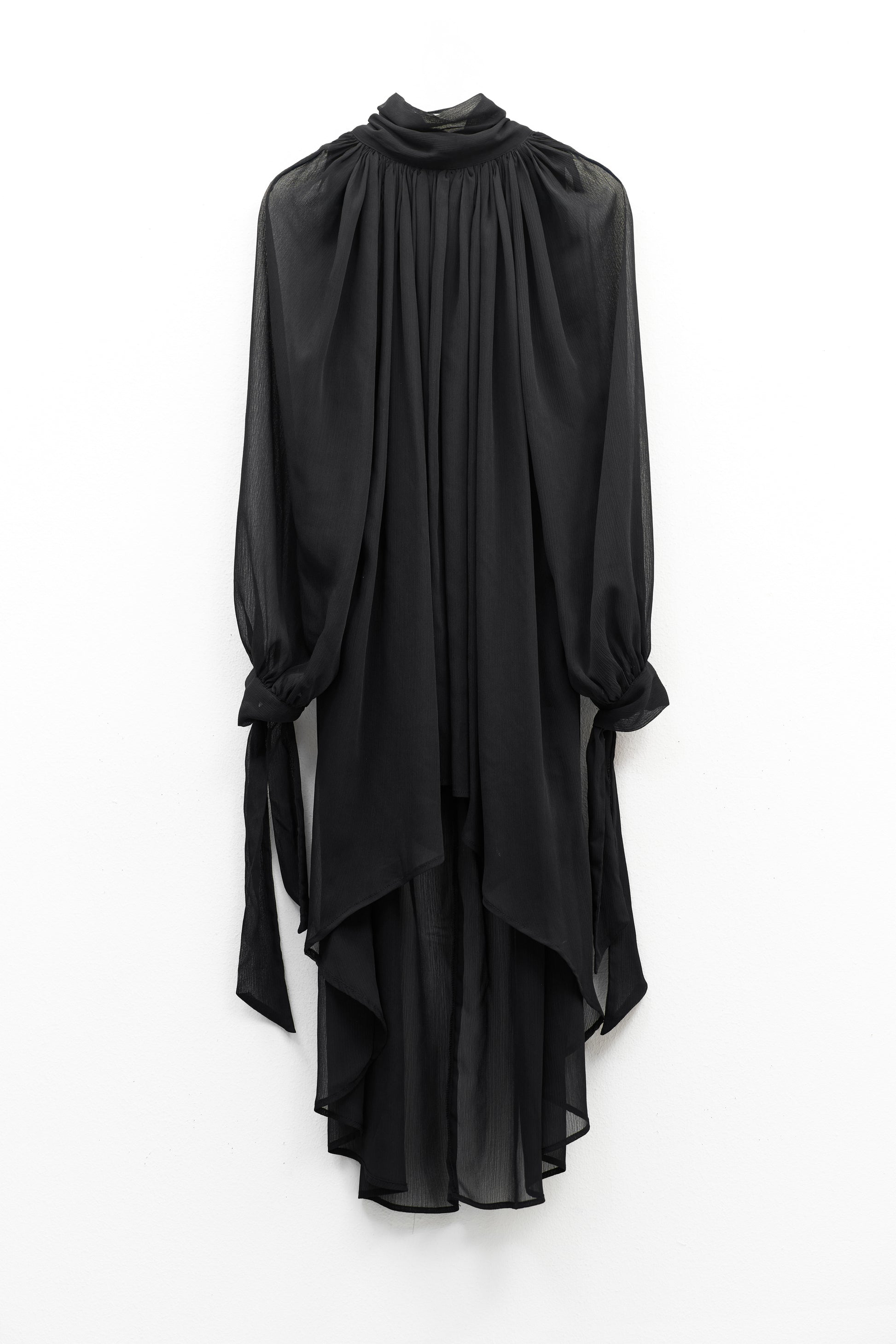 Vestido em chiffon preto ELEH, com corte fluido e assimétrico para um movimento elegante. Mangas longas com laços nos punhos e gola subida drapeada, criando um visual sofisticado e moderno. Perfeito para eventos especiais, jantares e ocasiões que pedem um toque de glamour.