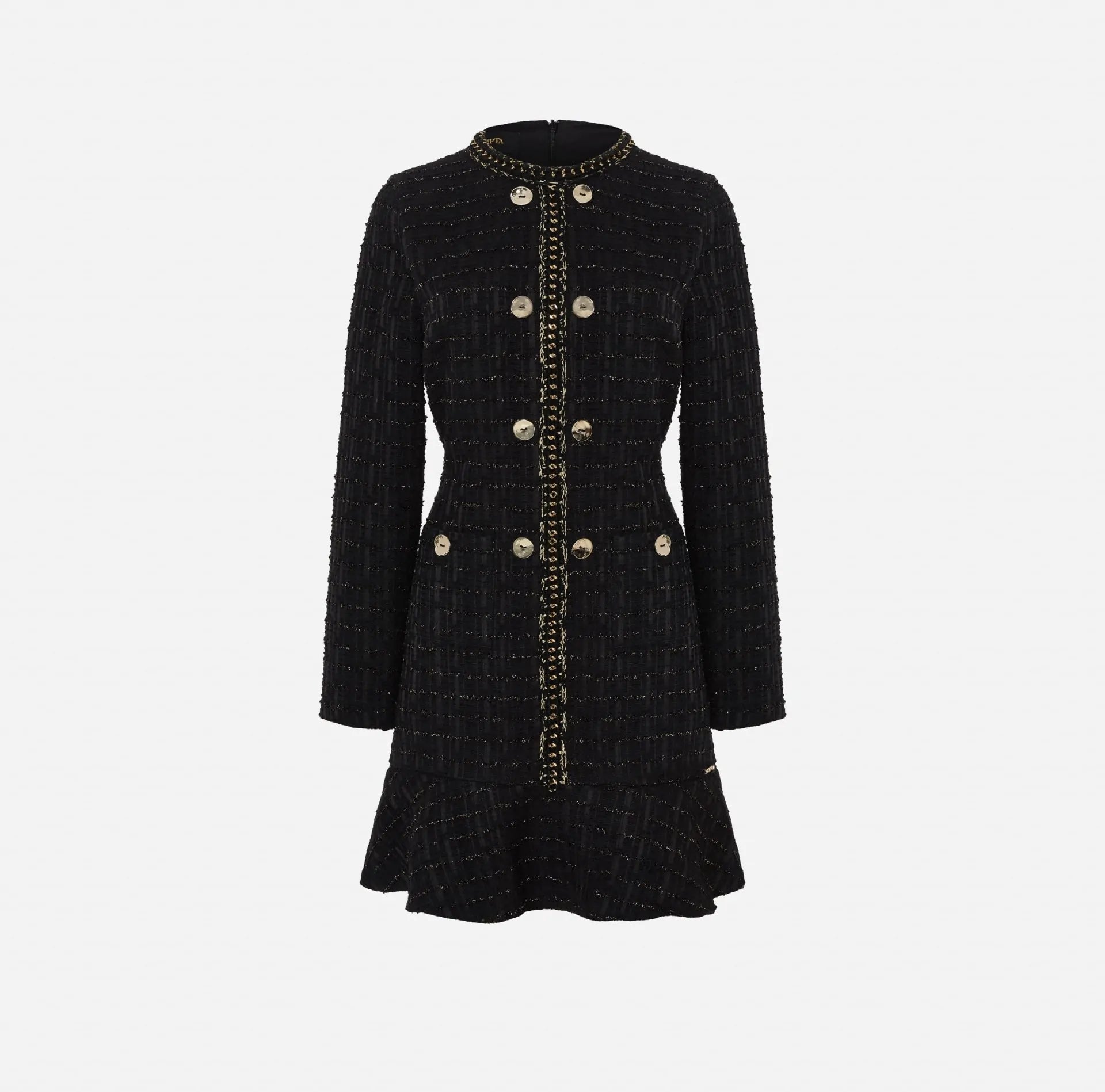 Inspirado na elegância parisiense, este vestido em tweed preto é um clássico reinventado com detalhes luxuosos. O corte estruturado com saia ligeiramente evasé valoriza a silhueta, enquanto os botões dourados e a aplicação de corrente metálica ao longo da frente acrescentam um toque sofisticado e intemporal. Uma peça perfeita para quem procura elegância e presença em qualquer ocasião.