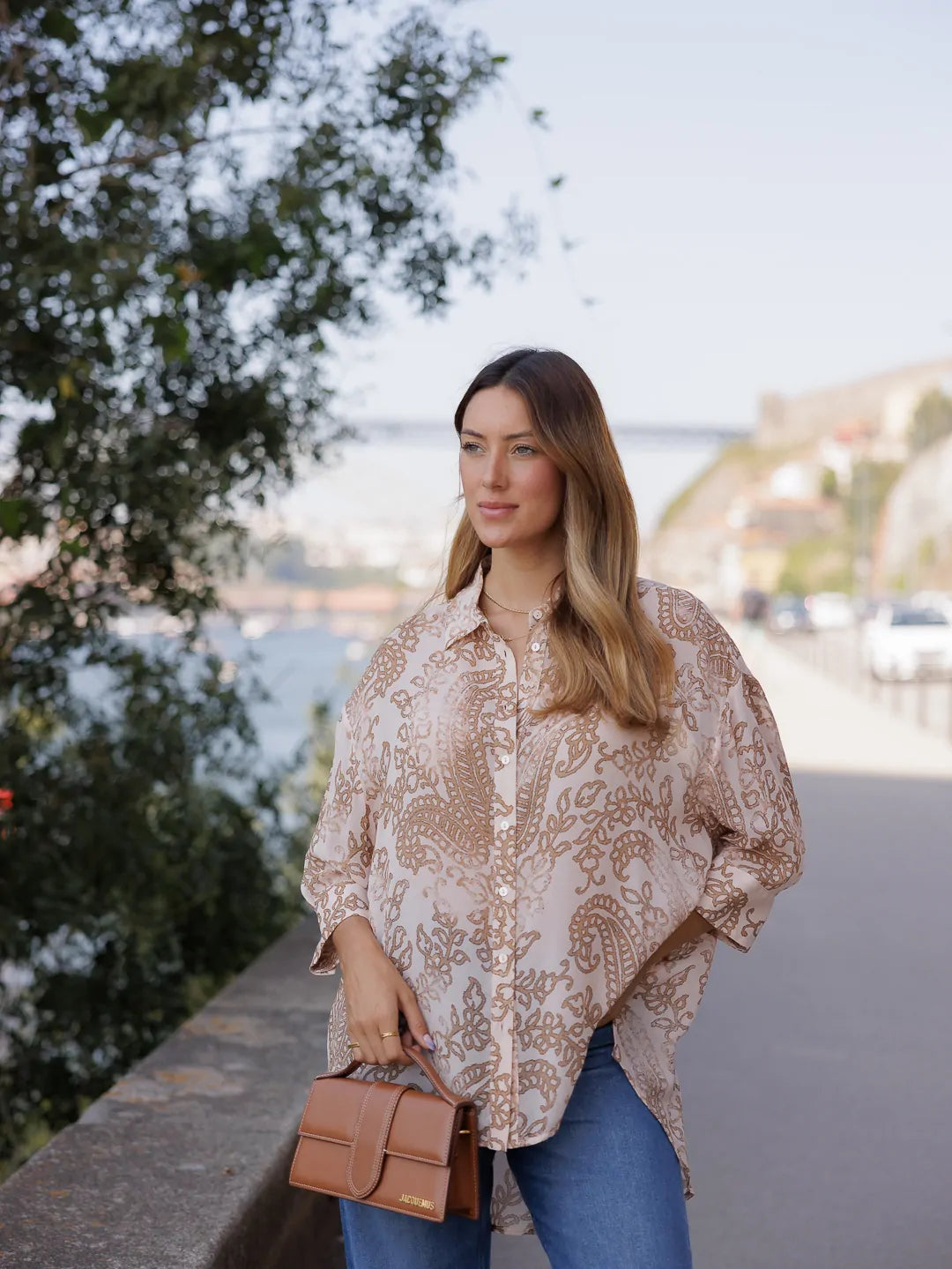 Blusa estampada em tecido fluído. Possui colarinho de abas, mangas 3/4 e ombros descaídos. A costa é mais comprida em relação aà frente. O fitting é solto.