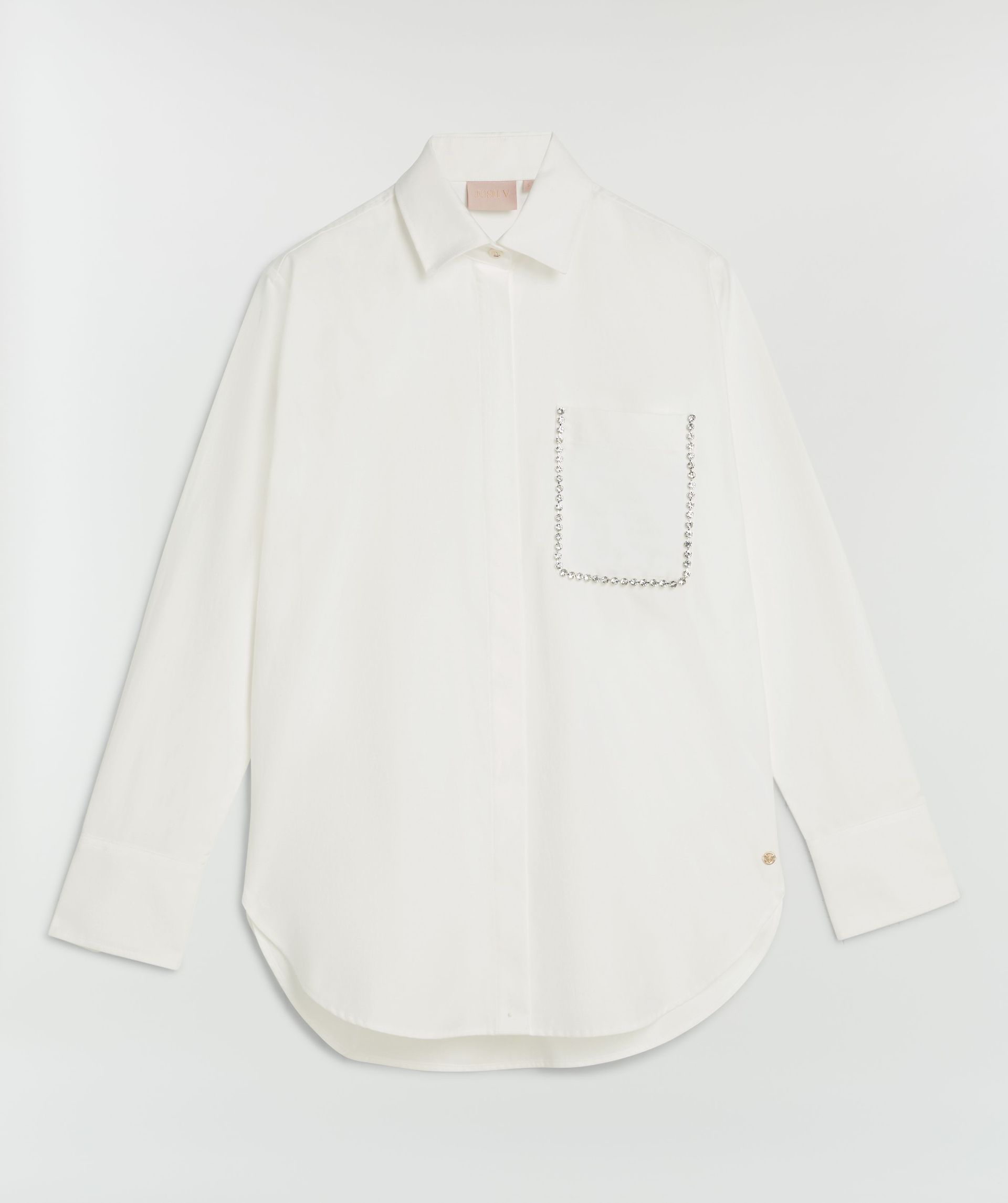 A blusa de senhora JOSH V Meggy na cor Off White é confecionada em algodão proveniente da Better Cotton e poliéster reciclado. A blusa tem um corte solto, gola clássica e é rematada com um bolso no peito adornado com strass brilhantes. Esta blusa branca com detalhes de strass pode ser combinada tanto com jeans casuais como com calças formais para looks versáteis.