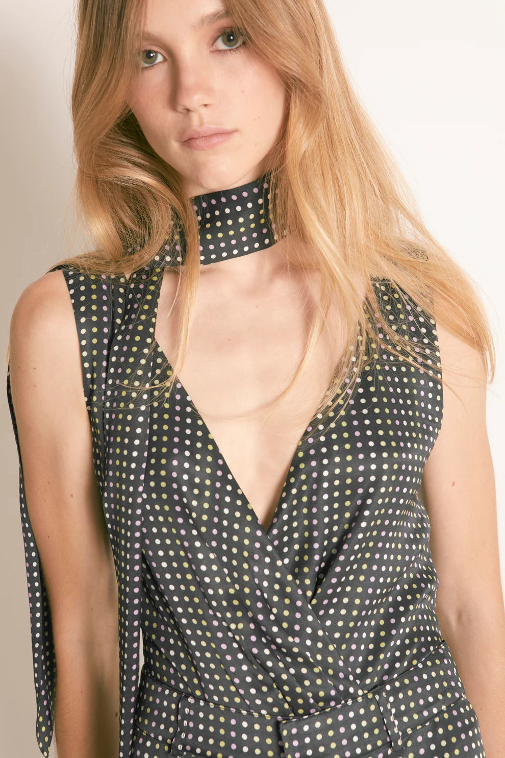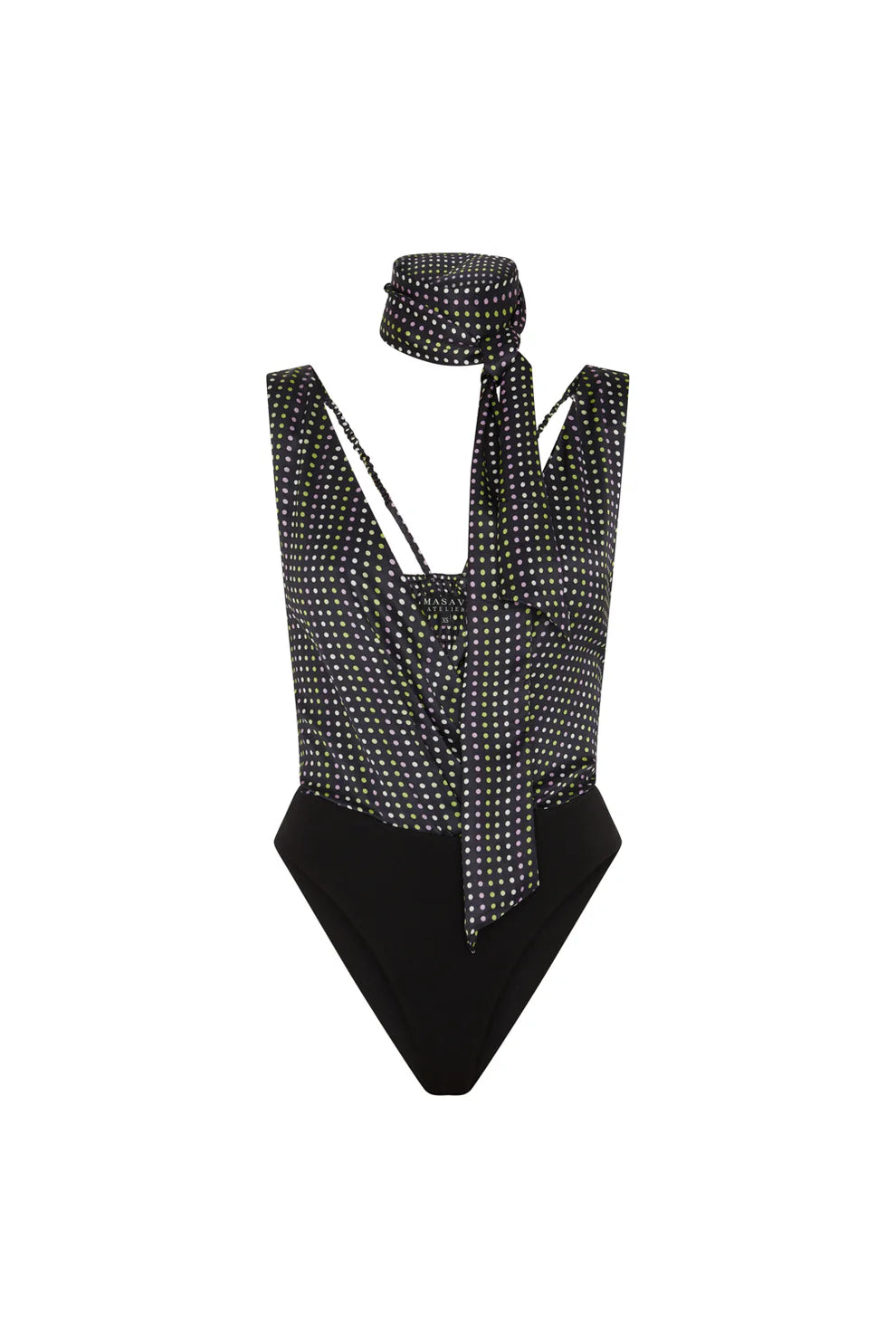 Body com design elegante e contemporâneo. A parte superior apresenta uma impressão personalizada de bolinhas pastel Masavi. O decote em V profundo agiliza a silhueta, enquanto o detalhe do lenço integrado na gola confere versatilidade e um ar de modernidade. A parte inferior é confeccionada em malha lisa preta, ajustando-se perfeitamente ao corpo para maior conforto e sustentação. Este body é ideal para combinar com calças ou saias de cintura alta.