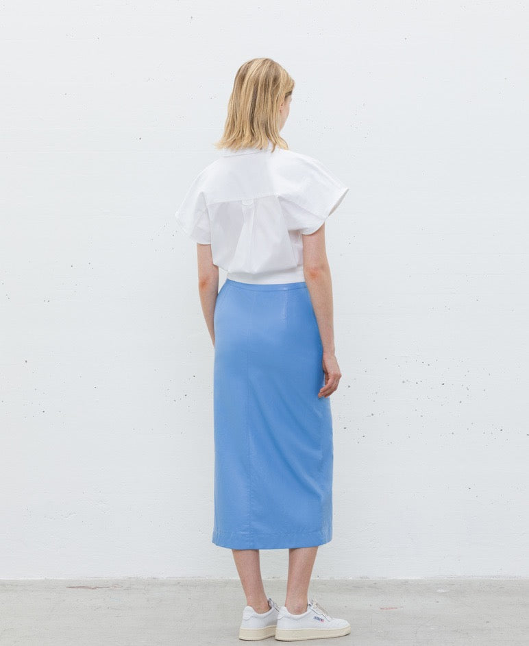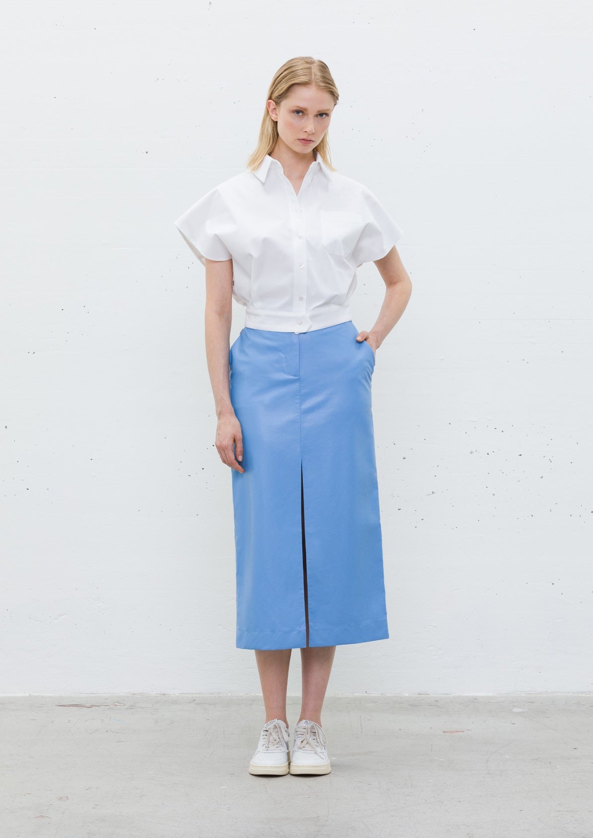 Camisa cropped de corte amplo e estruturado, com colarinho clássico e fecho frontal em botões. O design minimalista e contemporâneo destaca-se pelas mangas amplas tipo capa e pelo detalhe discreto no bolso. Uma peça statement e versátil que transforma qualquer look com um toque de sofisticação italiana. Ideal para combinações com calças de cintura subida ou saias elegantes.