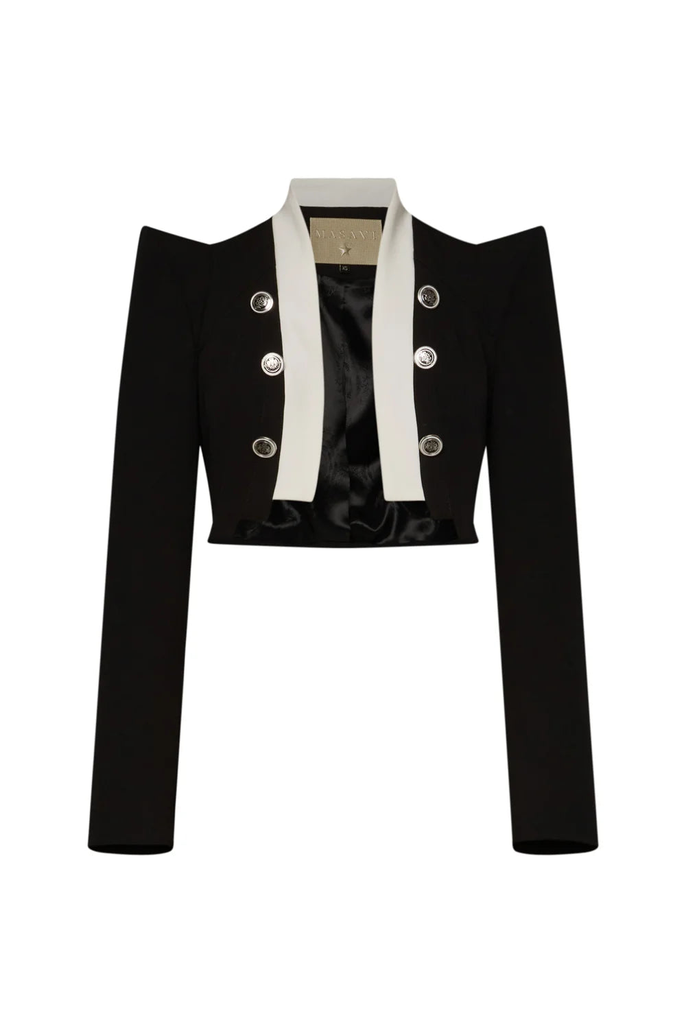 Blazer curto preto e branco, com ombreiras em pico e botões em contraste. É uma peça de roupa com design estruturado que irá realçar o seu look e não deixará ninguém indiferente.