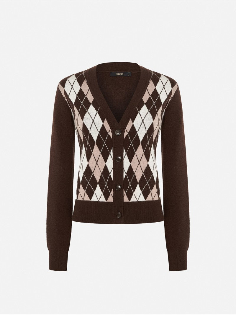 Casaco de malha em padrão argyle (losangos), uma peça clássica reinterpretada num design moderno e elegante. Com decote em V e fecho frontal com botões, este modelo combina conforto e sofisticação. O tecido elástico e macio garante um toque agradável e um ajuste perfeito ao corpo. Ideal para usar em conjunto com a saia coordenada para um look total Scripta.
