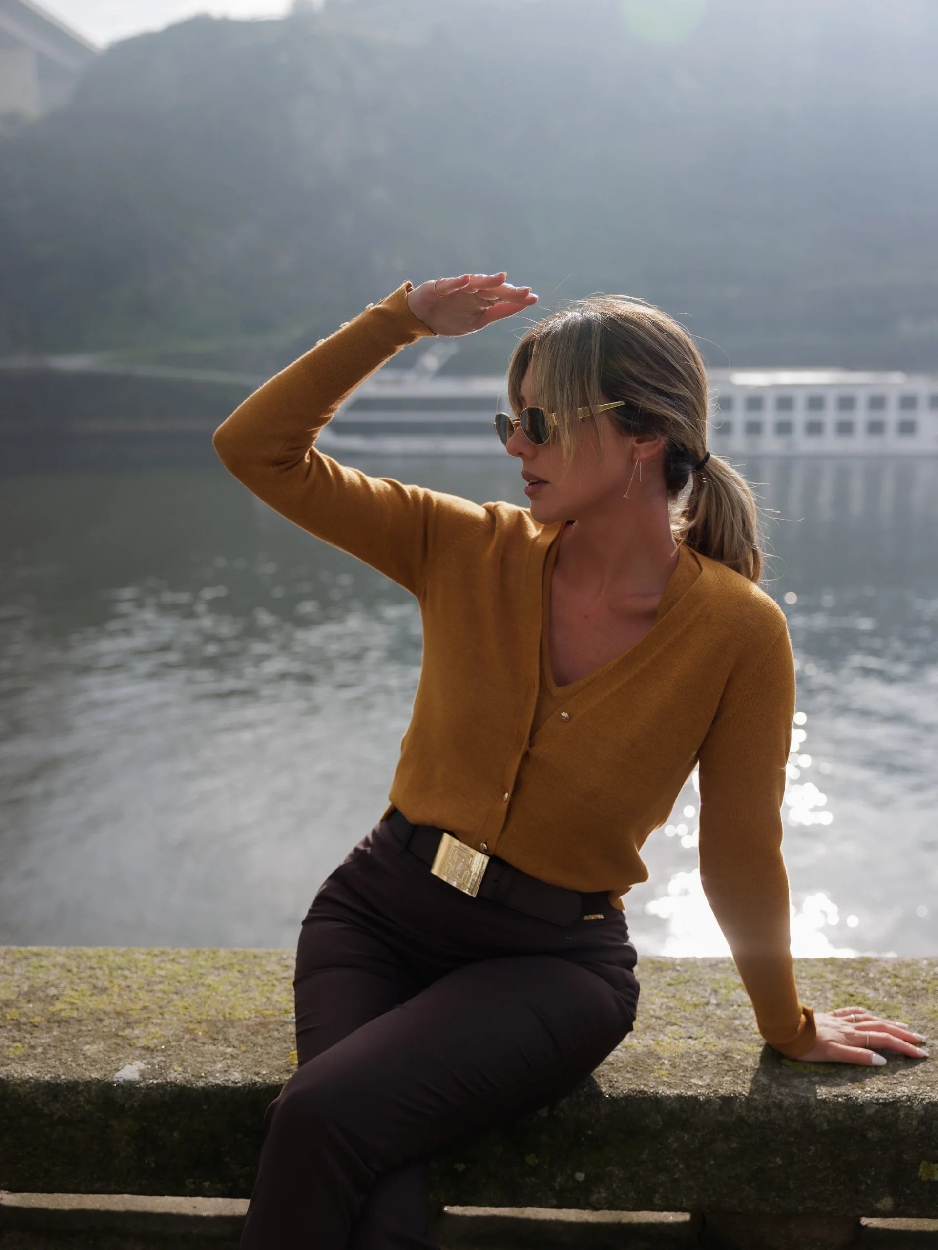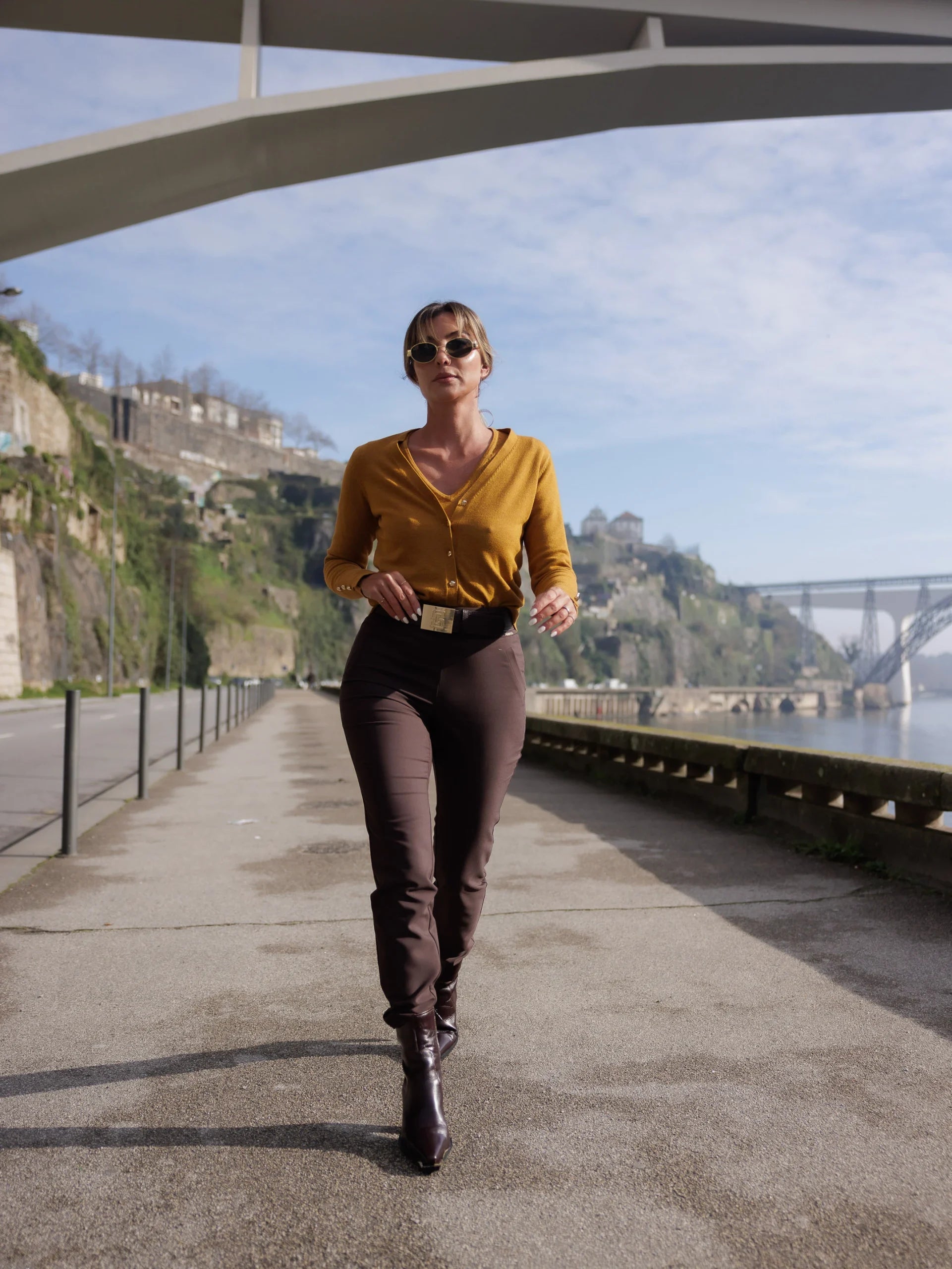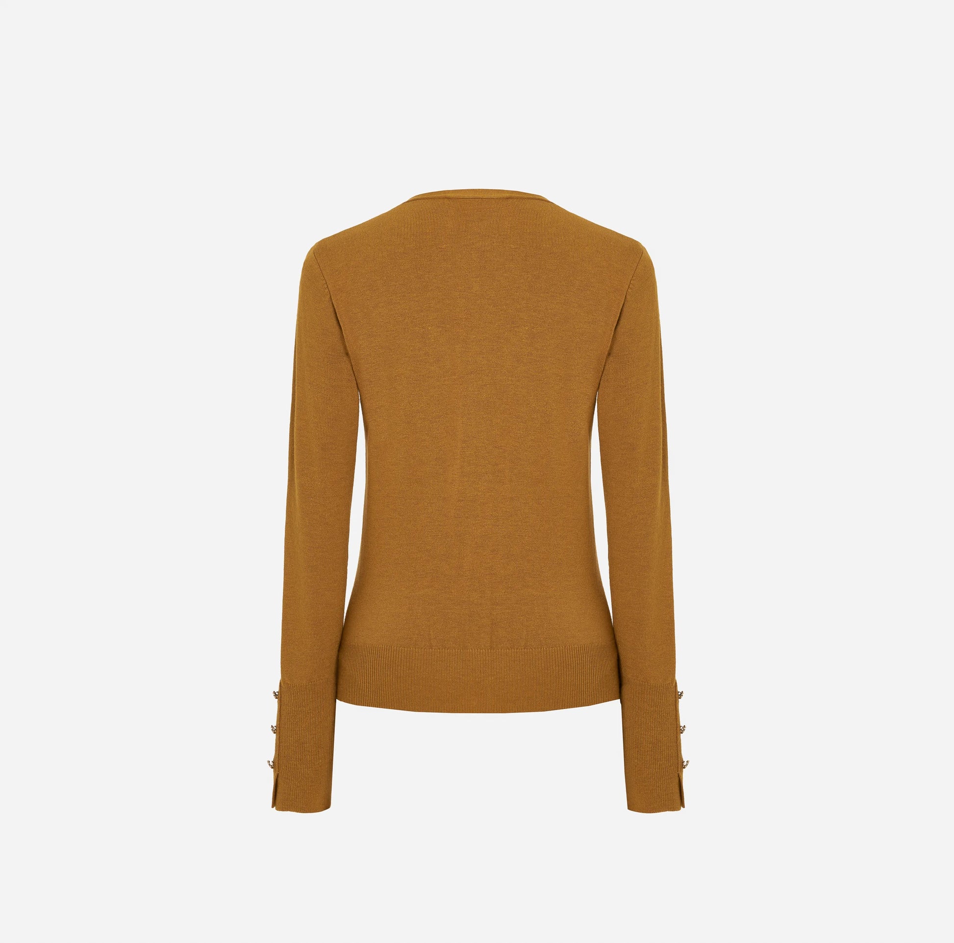Casaco em malha com decote em V e manga comprida. Aperta com botões metálicos personalizados. Pormenor de pequena abertura na manga e botões metálicos. O fitting da peça é ajustado.