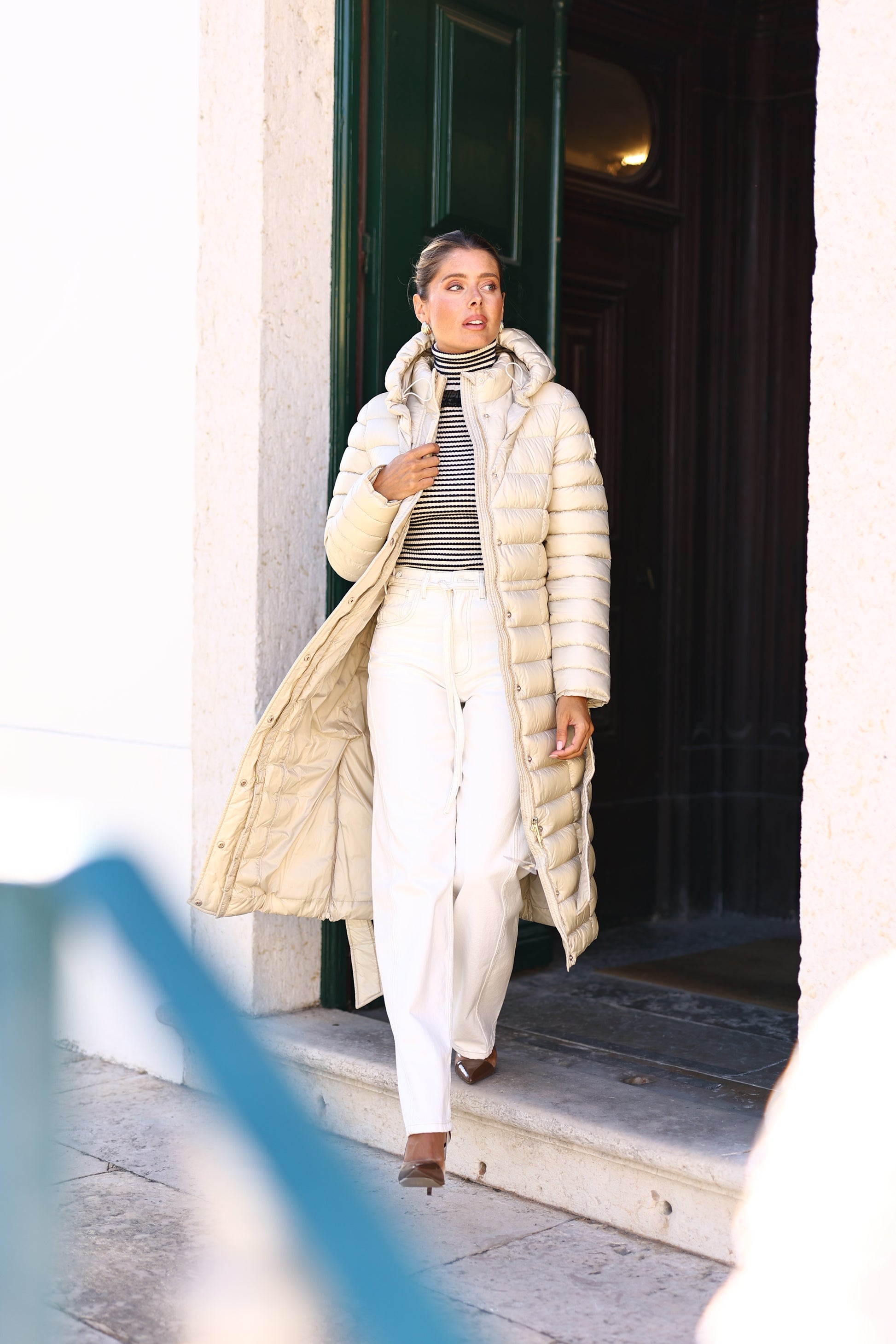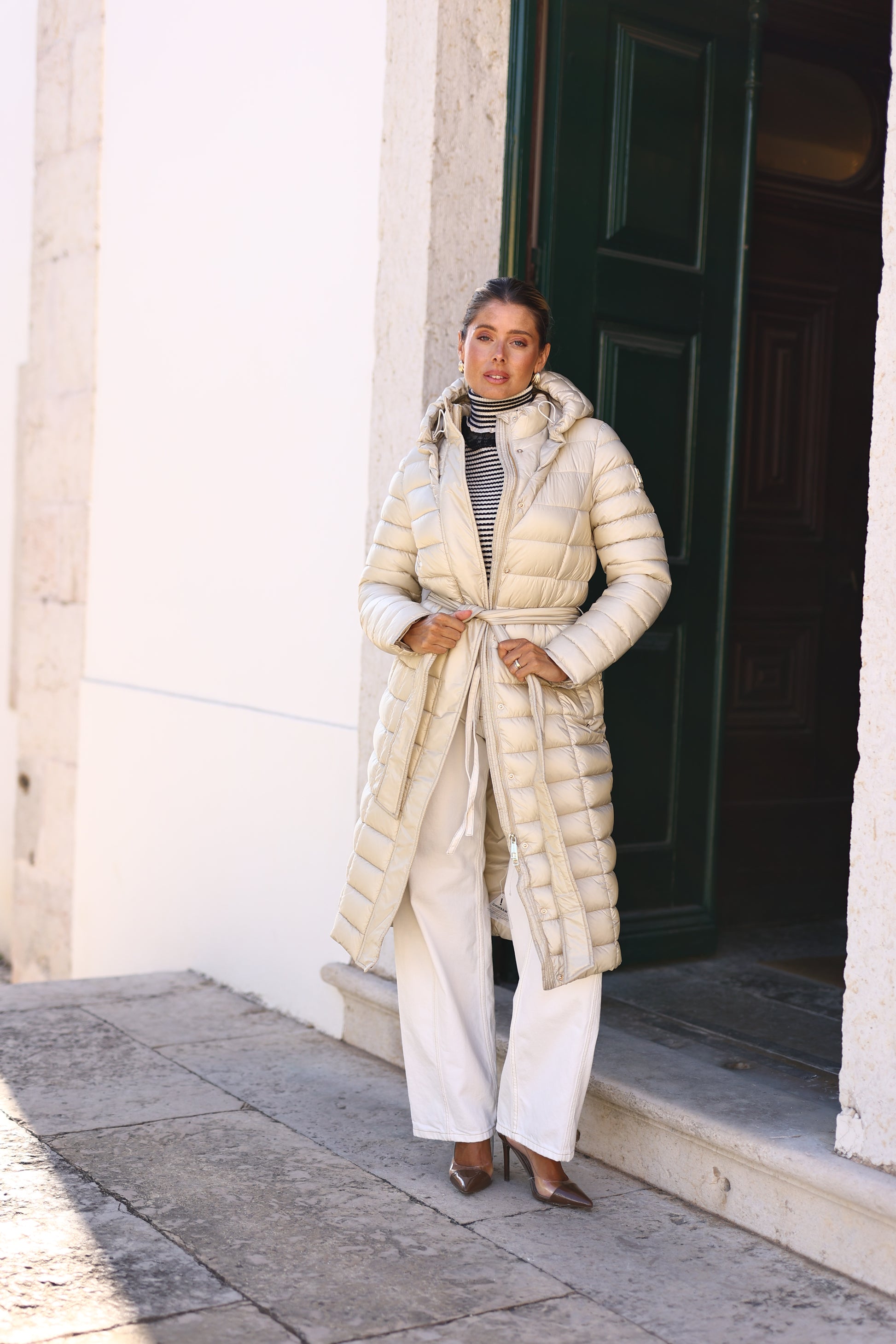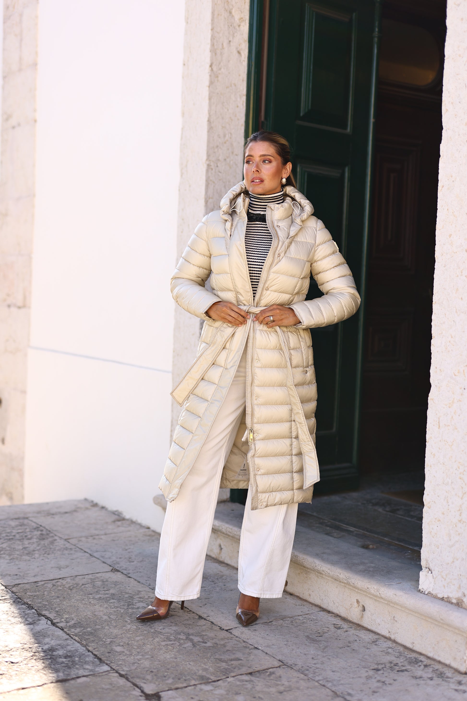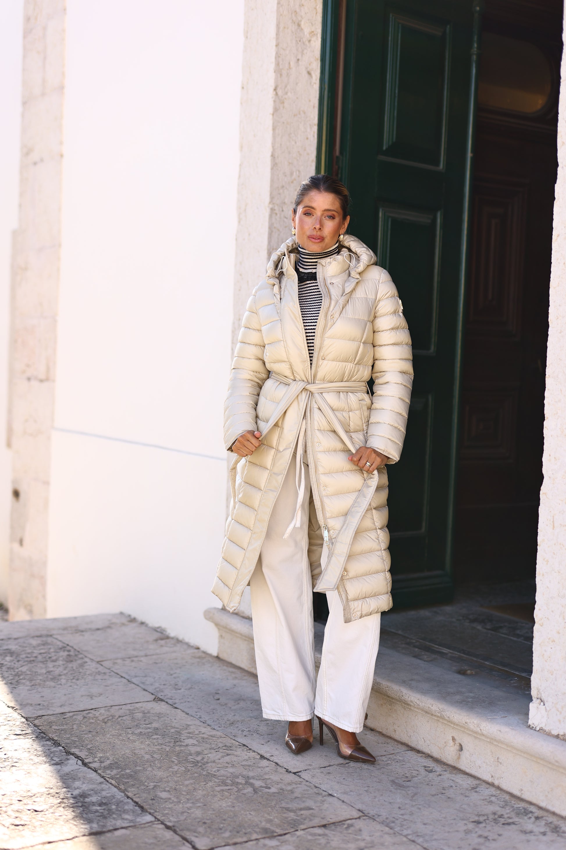 O casaco feminino JOSH V Mirsa na cor Bege Claro é uma adição estilosa ao seu guarda-roupa de inverno. O casaco longo acolchoado foi projetado para conforto nos dias frios. O casaco inclui vários recursos práticos. Por exemplo, o capuz é removível com zíper e possui um cordão para um ajuste confortável. O casaco puffer também possui zíperes em ambos os lados para maior mobilidade. Um cordão interno permite definir a cintura. O casaco fecha na frente com zíper e botão e é fácil de combinar com looks casuais e formais. Use o casaco Mirsa com jeans e botas para um look moderno do dia a dia, ou sobre um vestido com botas de cano alto para um visual elegante.