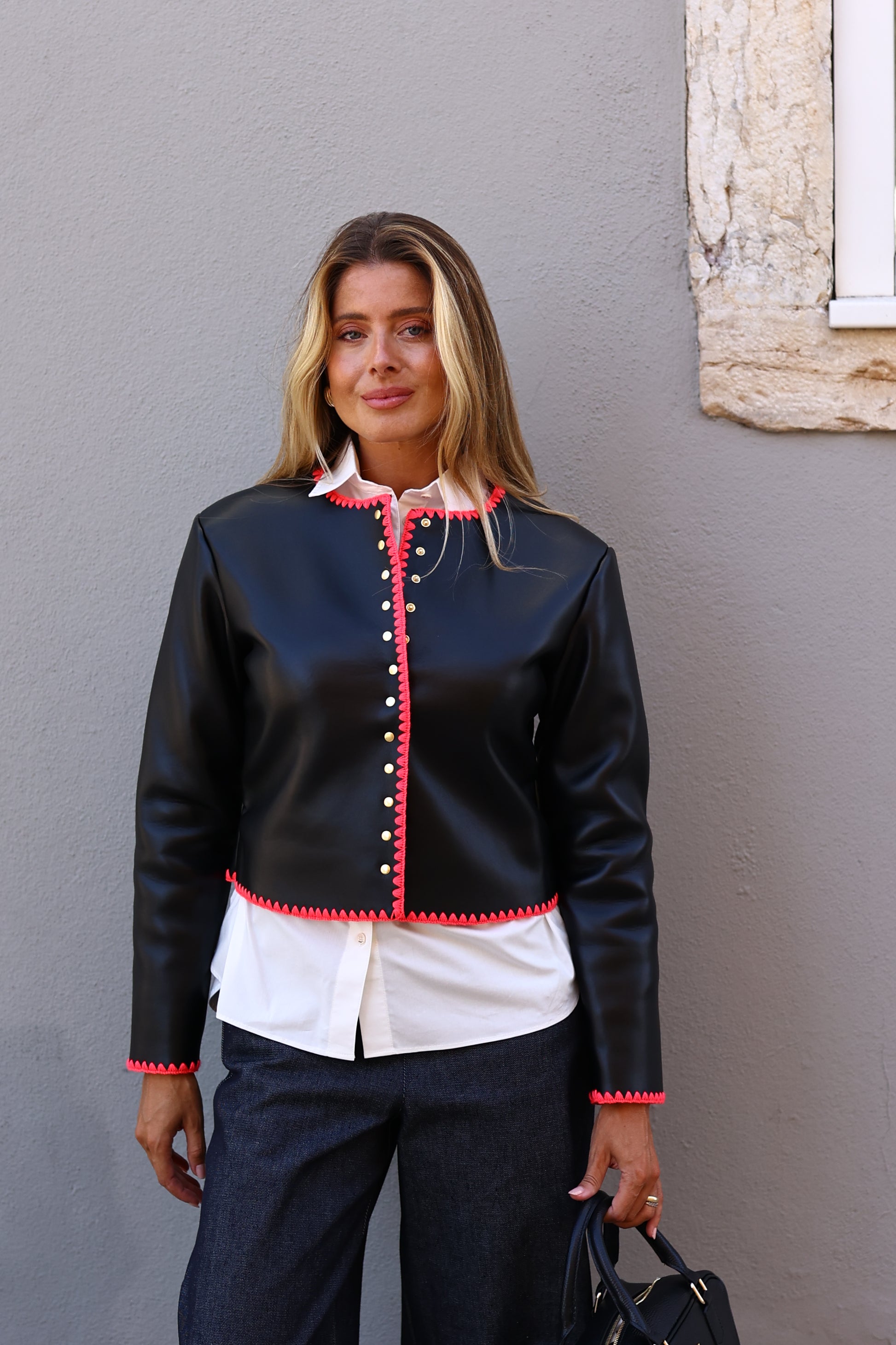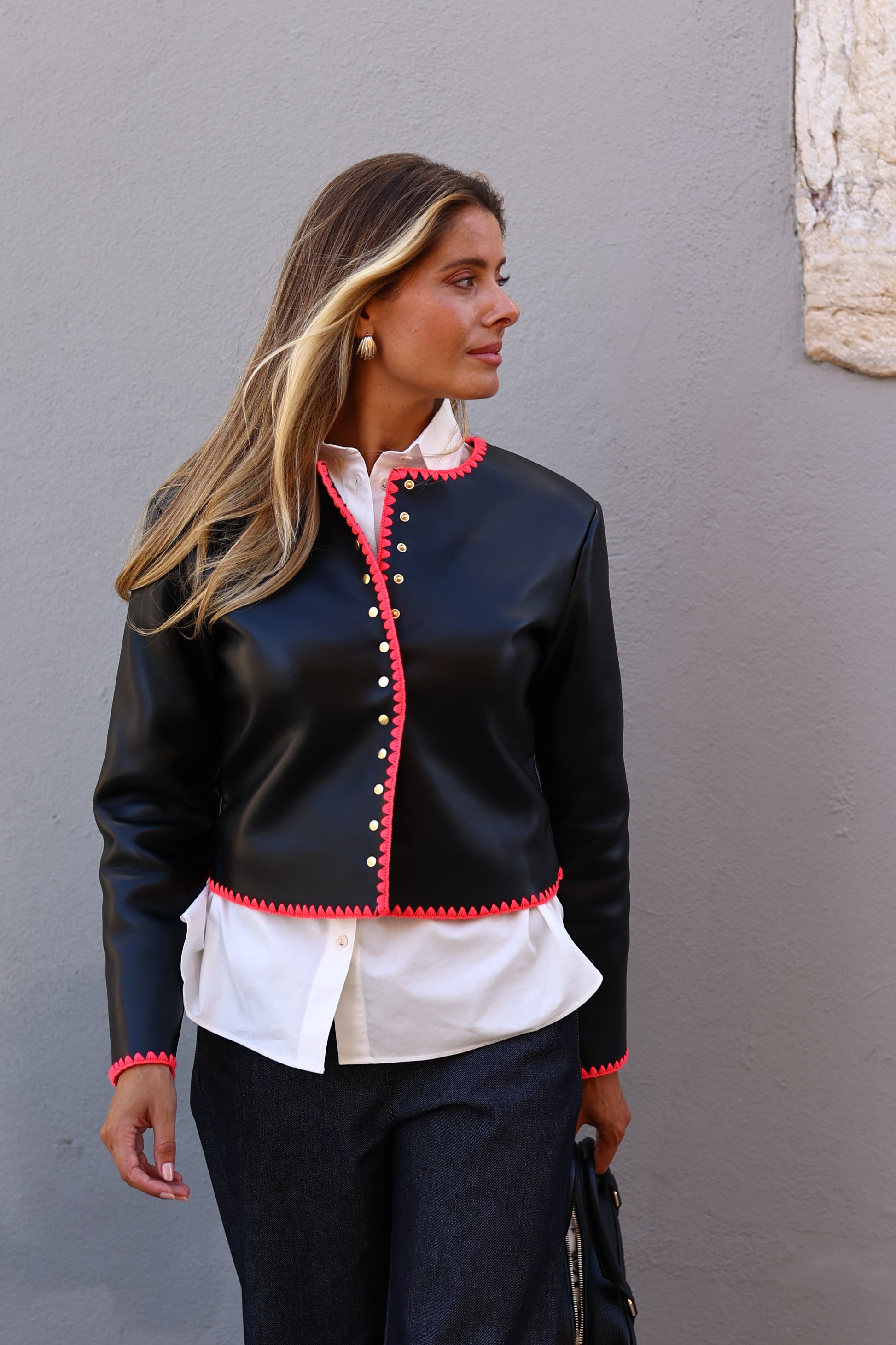 Este casaco é semelhante em couro séduito com acabamentos rosa fúcsia e botões dourados elegantes. Doublée en fausse laine bouclée pour un conforto absoluto, elle allie style audacieux et chaleur tout en douceur.