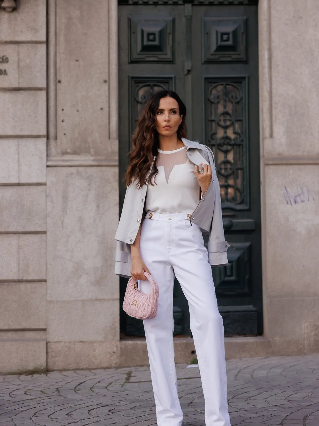 Calças de ganga de cintura subida. Detalhe de aplicações personalizadas na cintura. A calça apresenta um fitting solto.