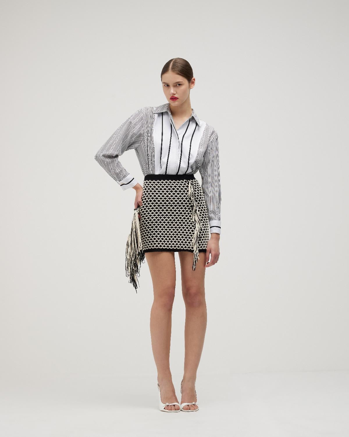 Uma peça artesanal com personalidade. Esta saia curta em crochê apresenta um padrão geométrico em preto e off-white que combina charme retrô com sofisticação contemporânea.