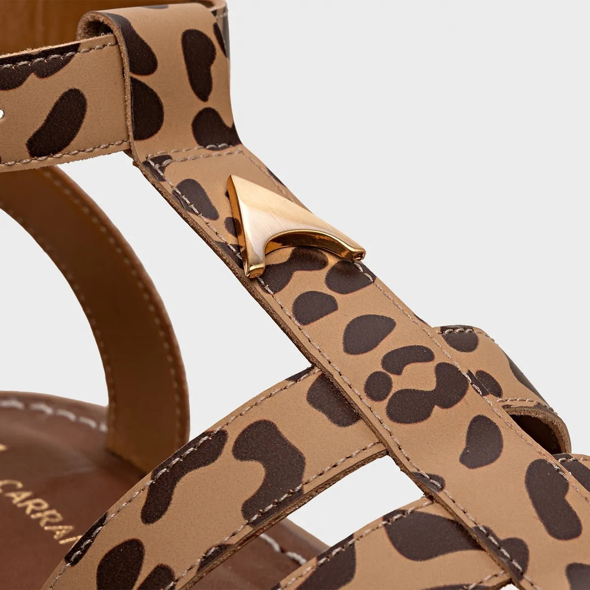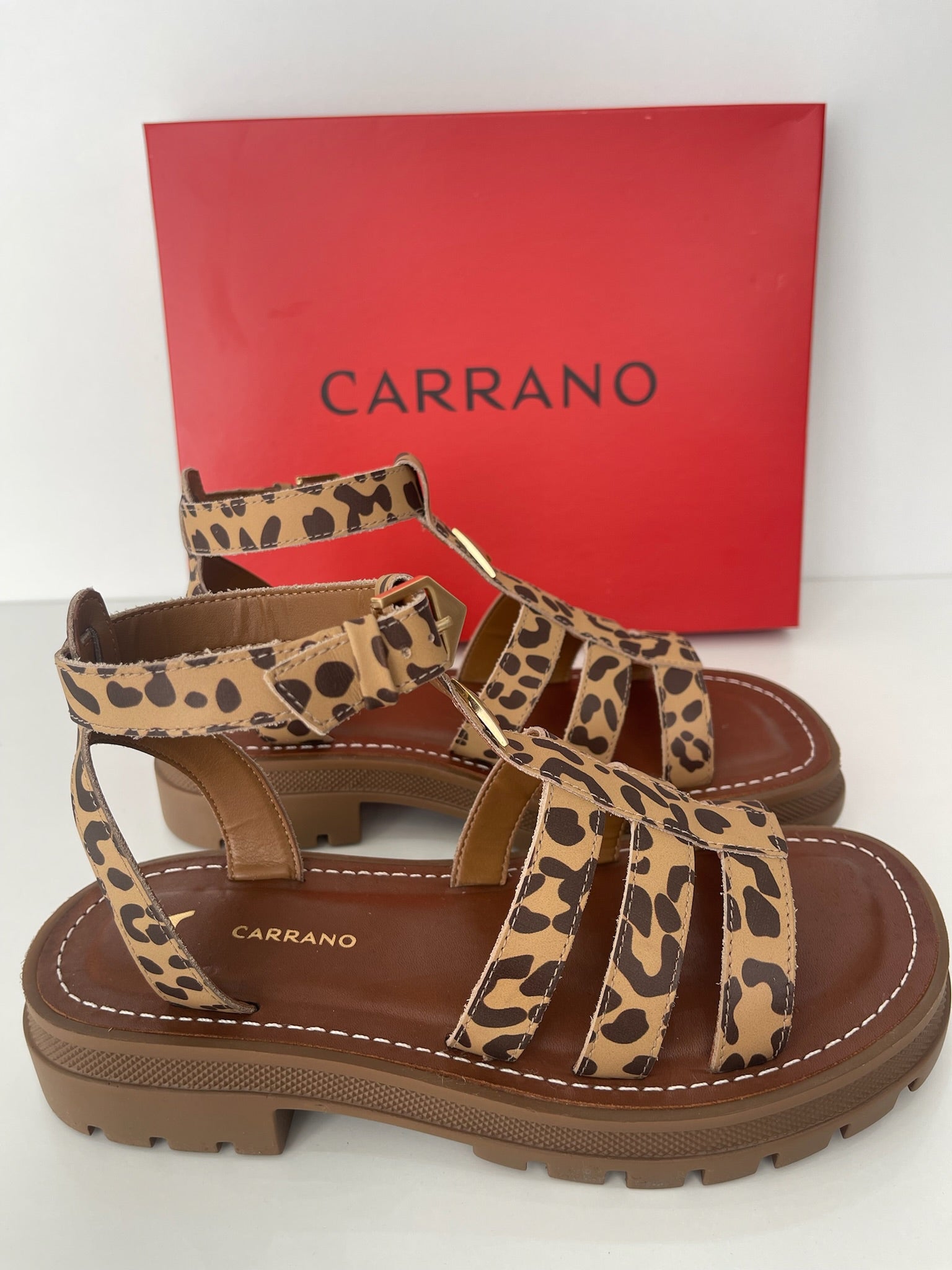 Sandália papete de couro. O modelo tem salto robusto tratorado e bico redondo. Possui tiras no formato gladiadora sobre o pé, aplicação do ícone Carrano no centro do sapato. Fechamento com fivela ajustável no tornozelo. Com palmilha da cor do modelo e inscrição do nome da marca. FEITO EM COURO LEGÍTIMO.