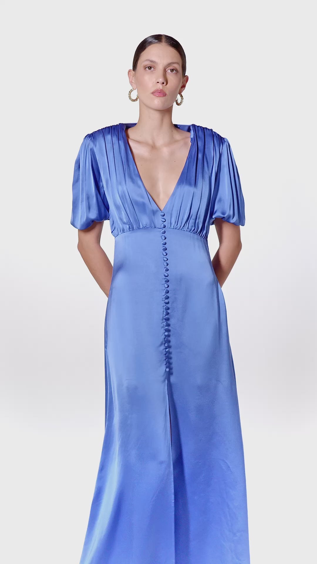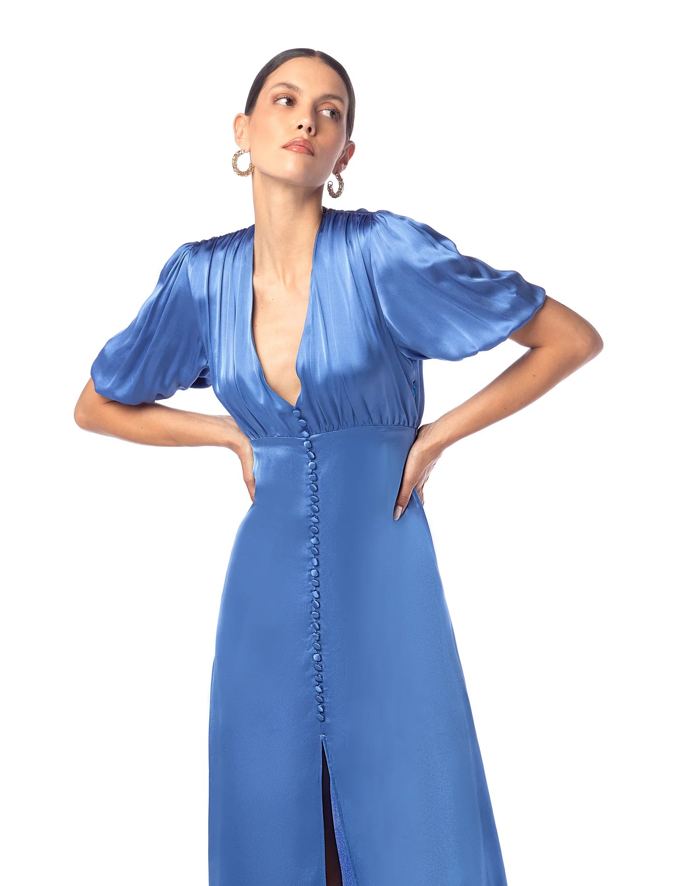 Vestido camiseiro longo em viscose, corte abaixo do busto e mangas bufantes. Botões forrados no centro da frente e abertura no acabamento.