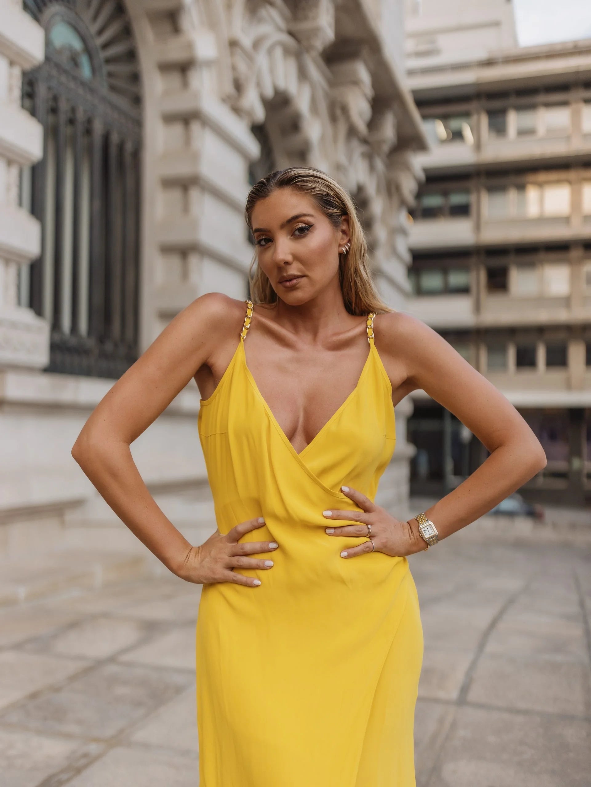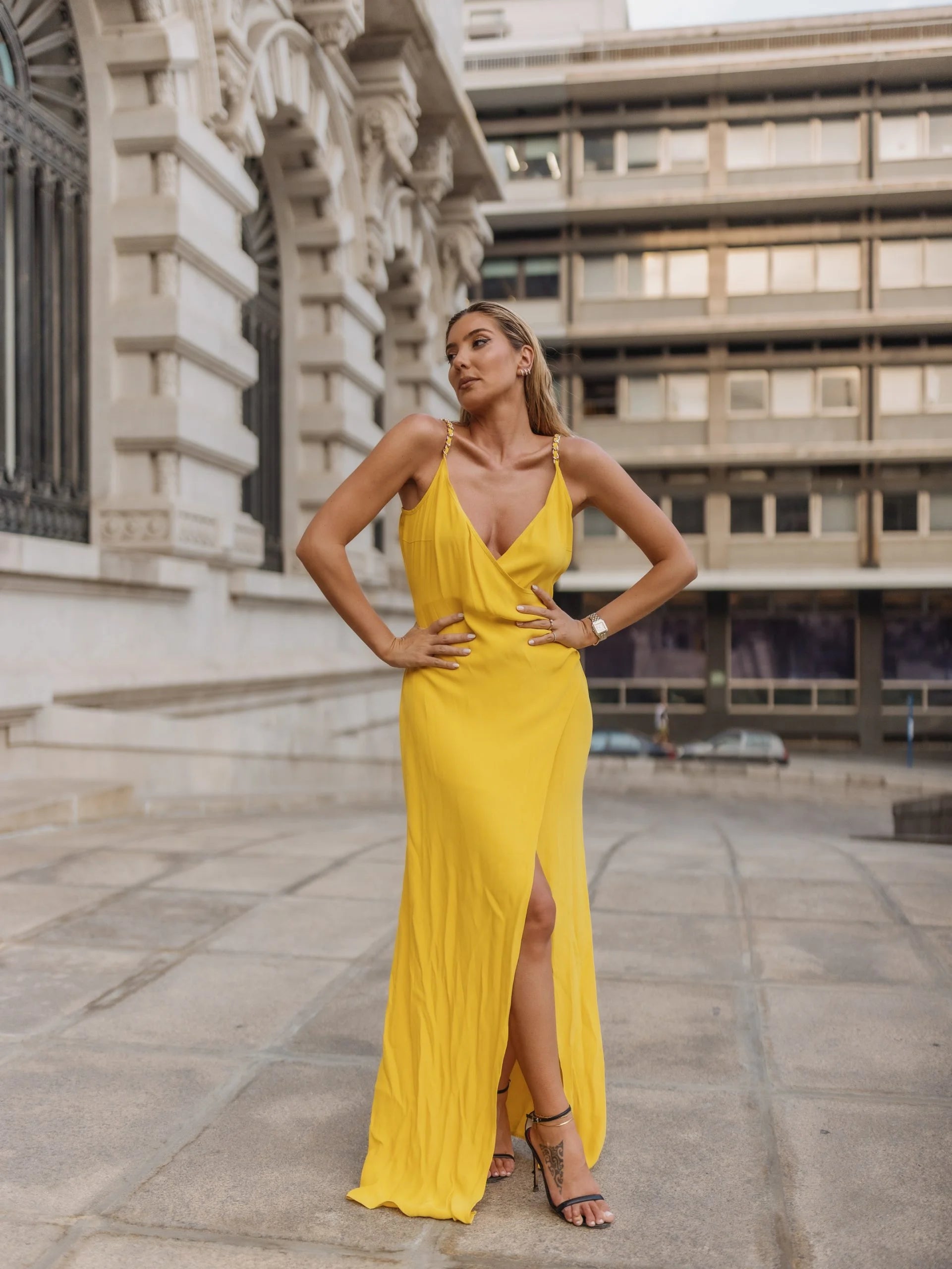 Vestido comprido fluído com decote cruzado. Alças finas com pormenor de corrente. Parte inferior do vestido também cruza na frente e contém um ligeiro franzido na lateral. Aperta na costa com fecho invisível.