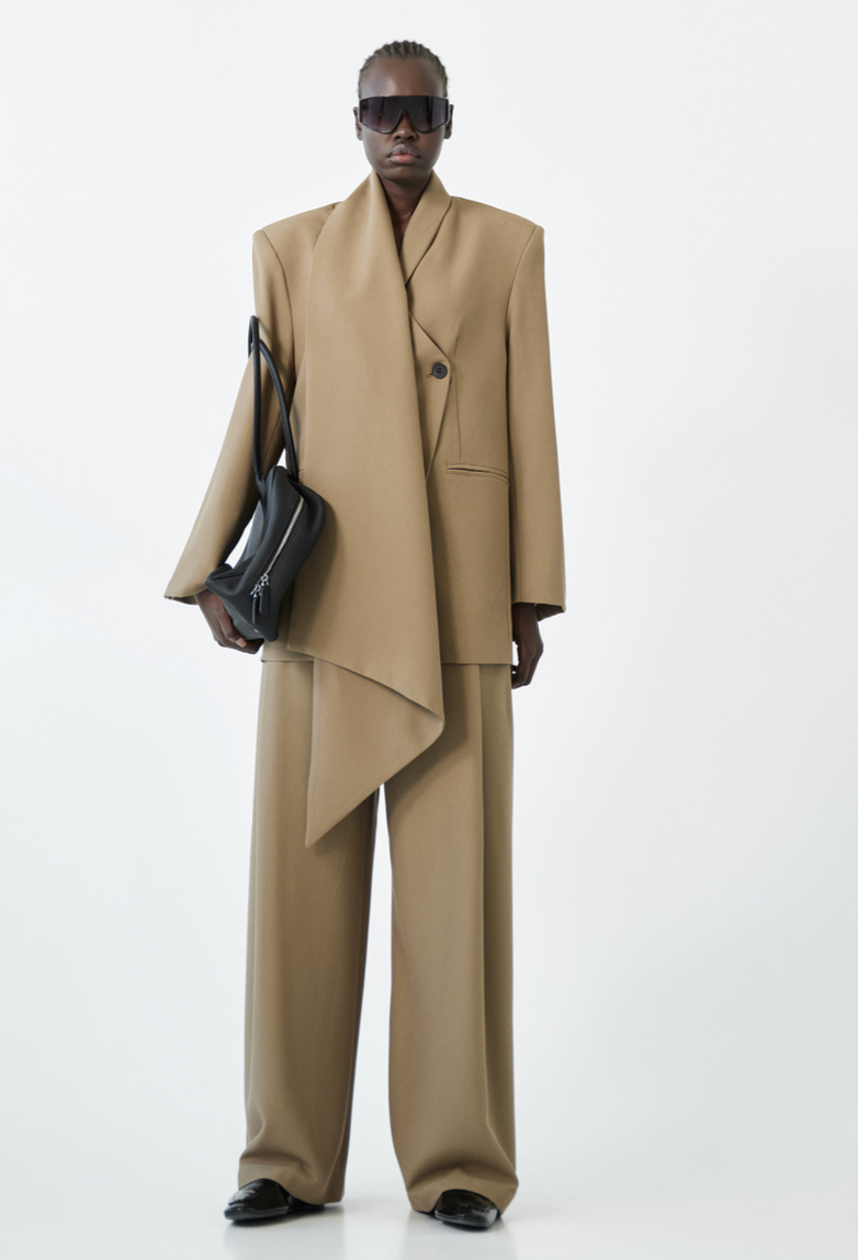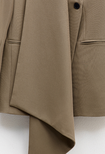 Blazer estruturado com gola ampla e detalhe assimétrico em tecido, criando um elegante efeito drapeado. Um design moderno e sofisticado que traduz a estética minimalista da ELEH.
