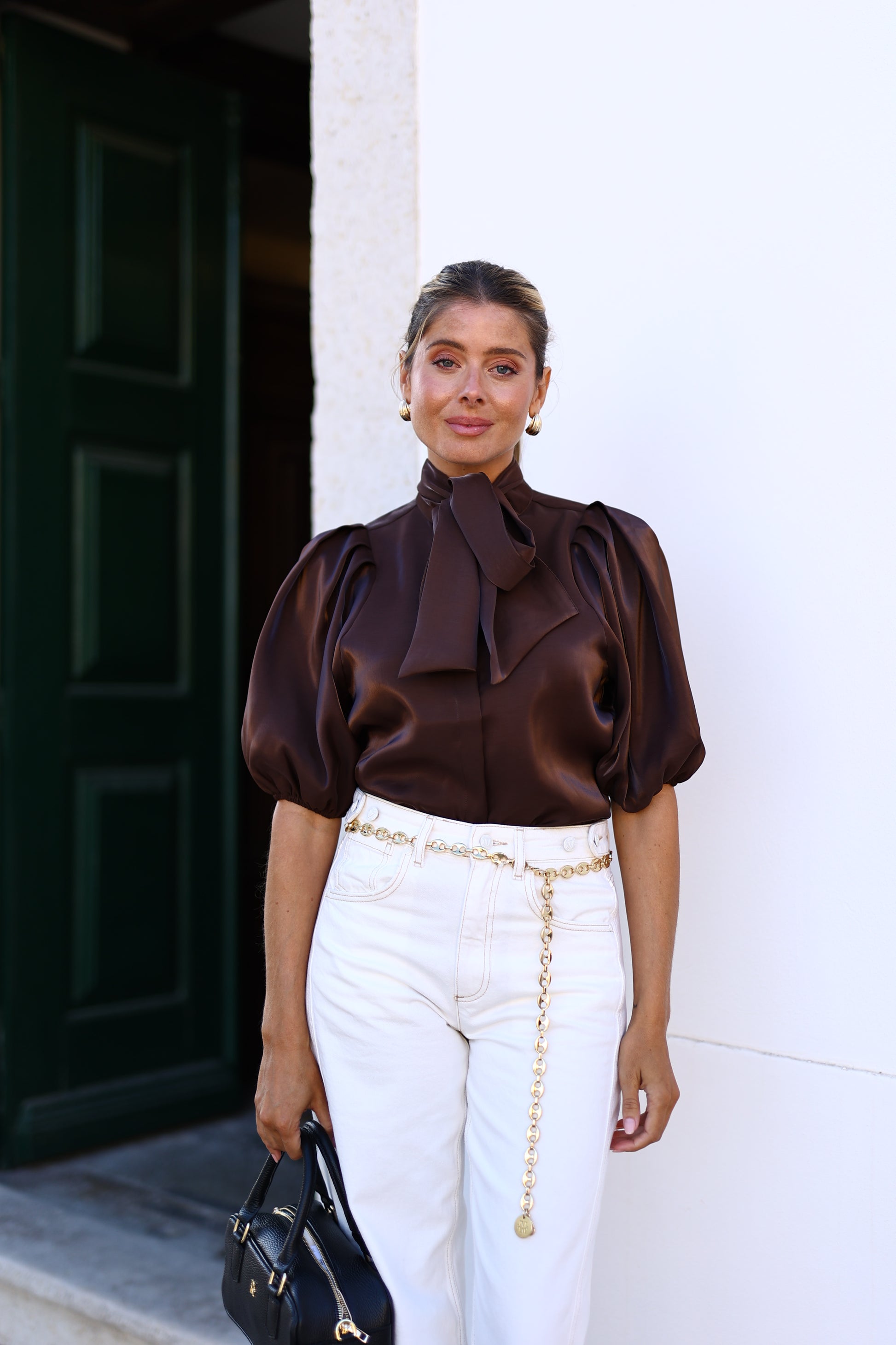 A blusa feminina JOSH V Sylvia na cor Marrom Escuro é um item indispensável que eleva o seu visual. Esta blusa tem caimento regular e é feita de organza brilhante, um tecido composto por poliéster e poliéster reciclado. Possui mangas bufantes e uma tira de amarrar na gola, que pode ser estilizada ao seu gosto ou usada sem a alça para um visual mais simples.