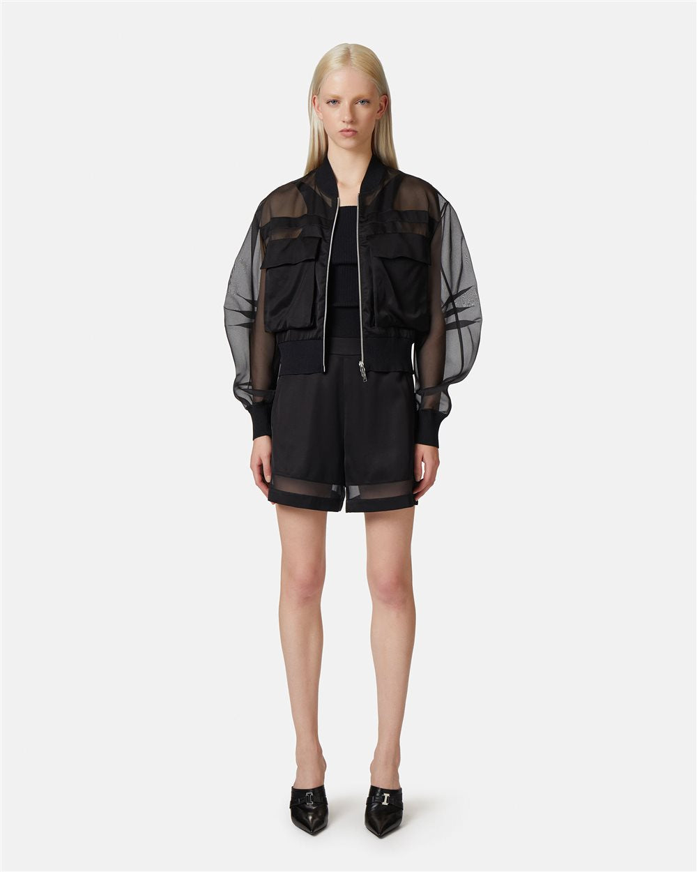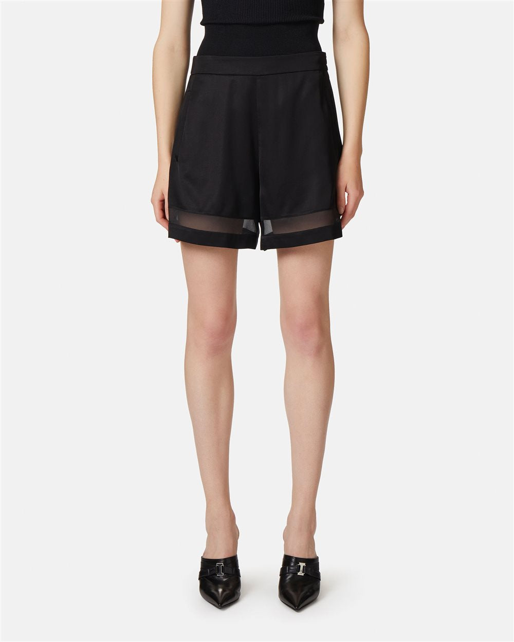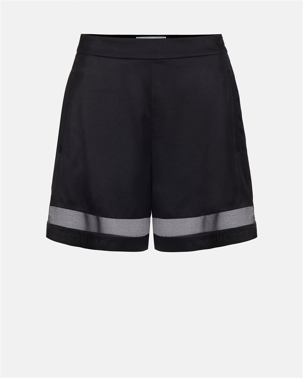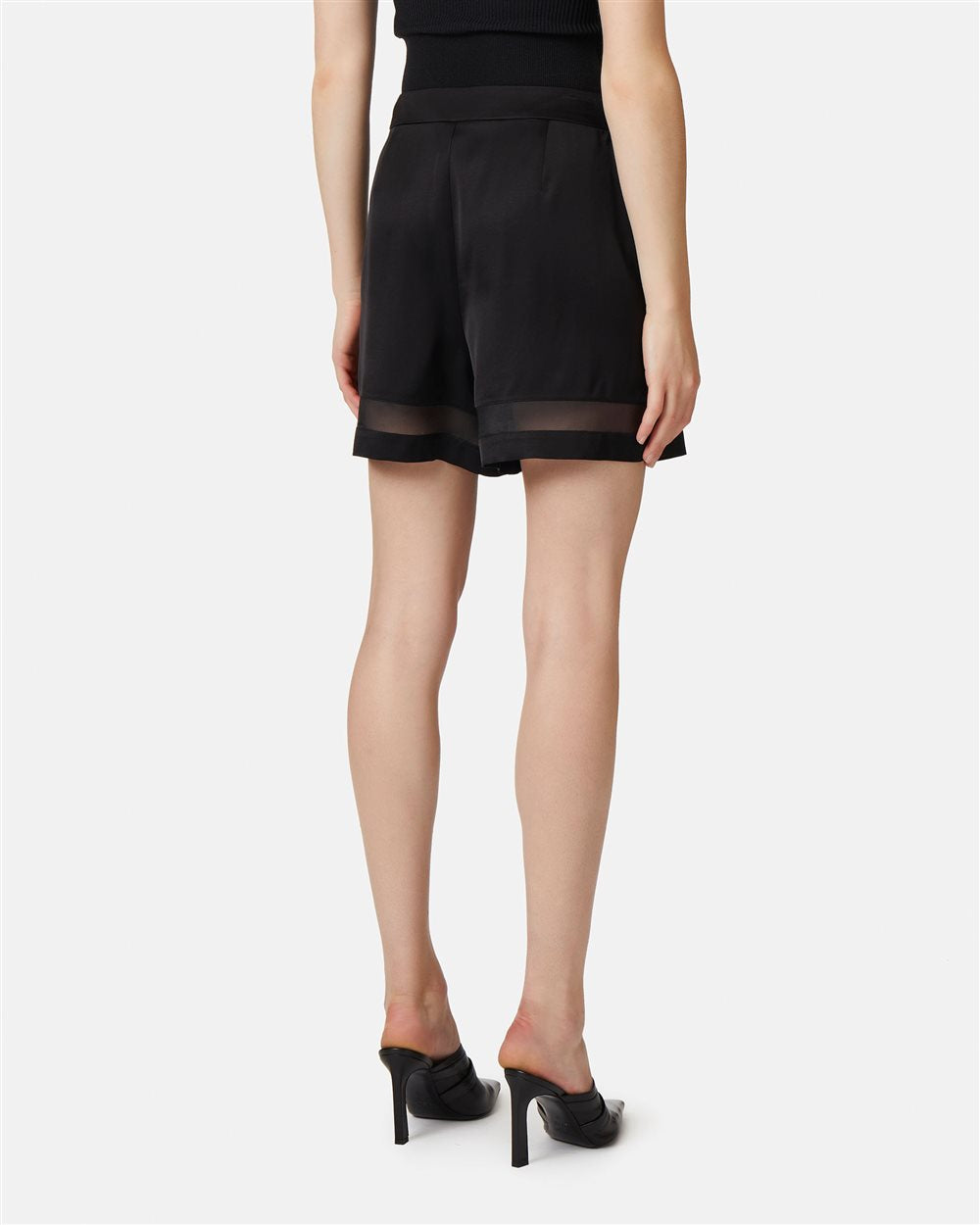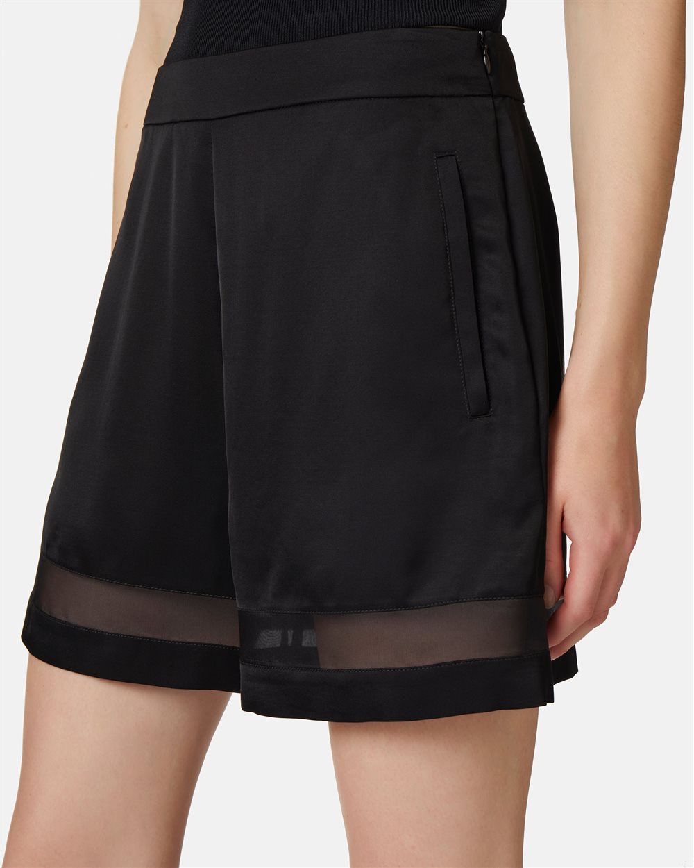 Calções pretos em cetim viscose lavado com banda de organza no final e cinto de cintura. Botão lateral com zíper oculto. Ajuste regular.