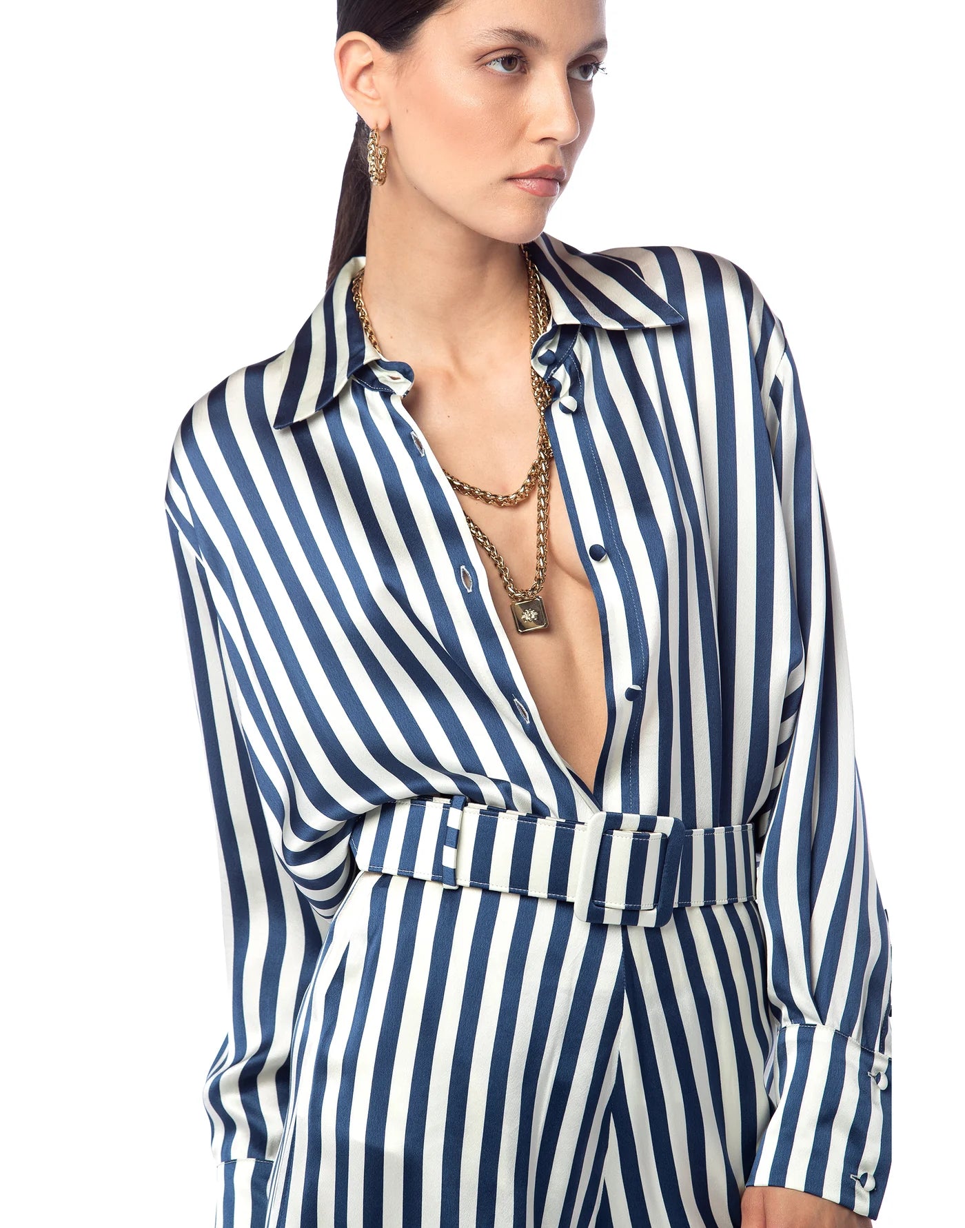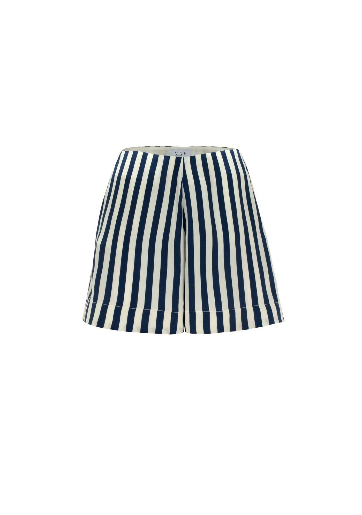 Calções de viscose com desenho de listras verticais, perna larga e bolsos. Fecho lateral invisível para fechamento.