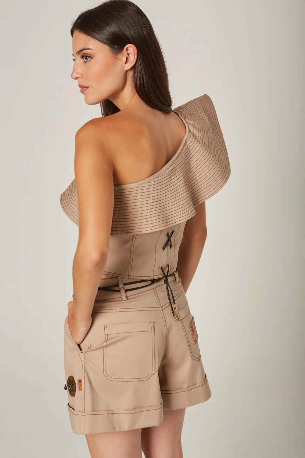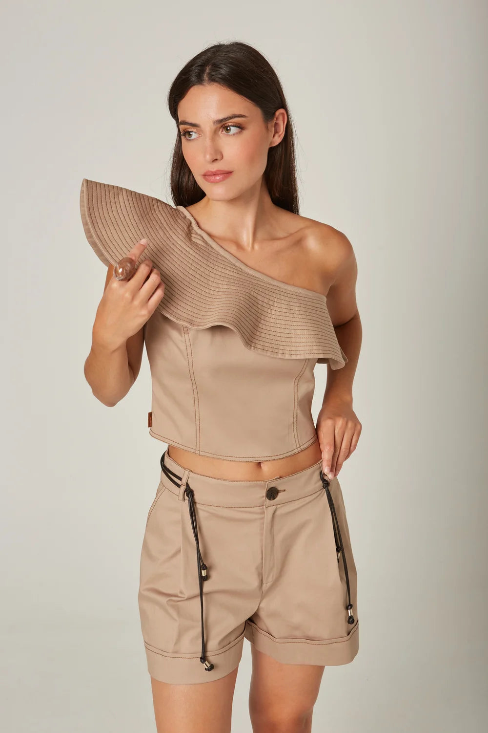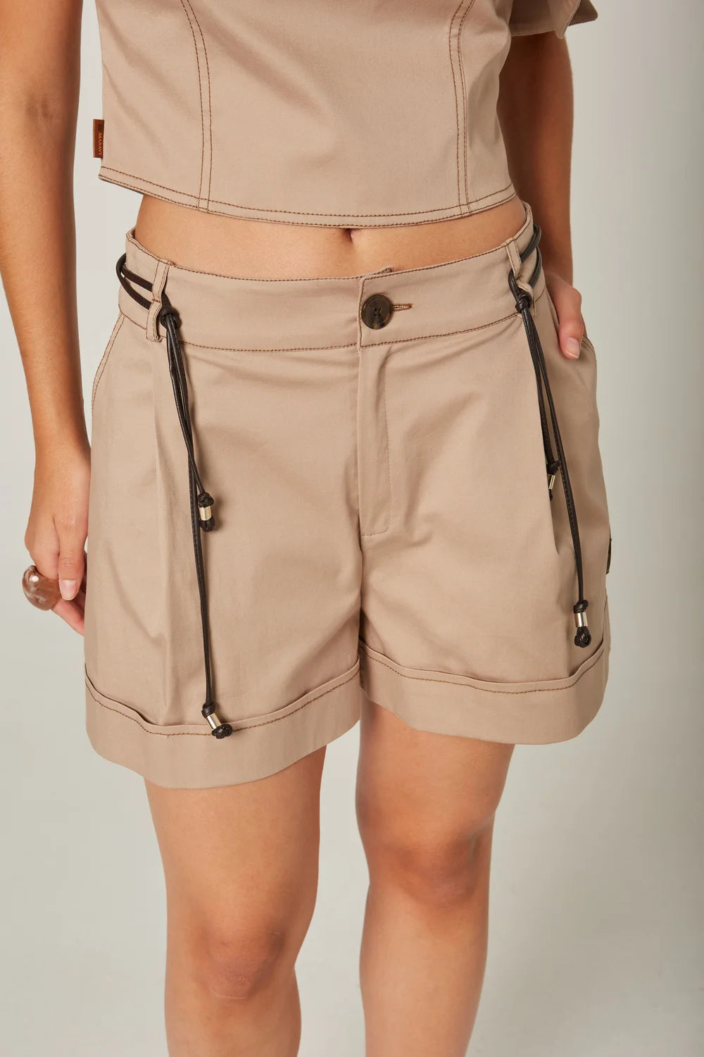 Este short é o melhor aliado para lidar com as altas temperaturas do verão, tanto de dia como de noite. Este básico short areia em sarja destaca-se pelo detalhe do cinto com cordão atado e pelo logotipo no lado inferior esquerdo. Feito com pontos marcados em contraste.