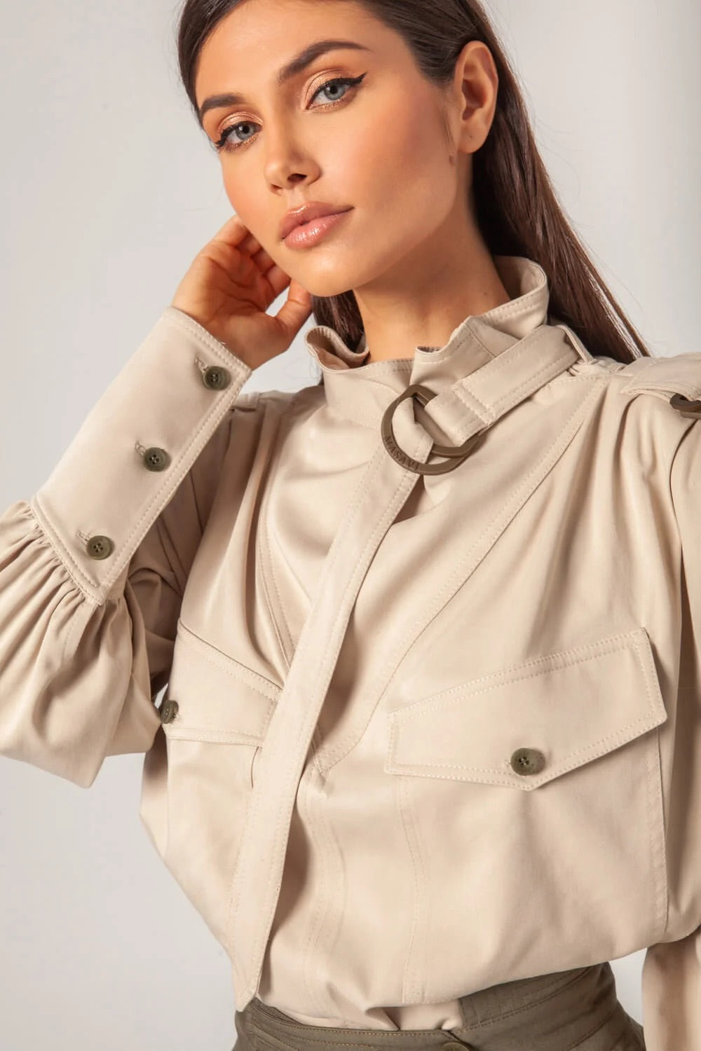 Fantastique chemise cargo kaki. Il se distingue par son design structuré pour créer du volume sur les manches et les épaules, les boucles qui décorent les épaules et le cou en font une pièce très spéciale.
