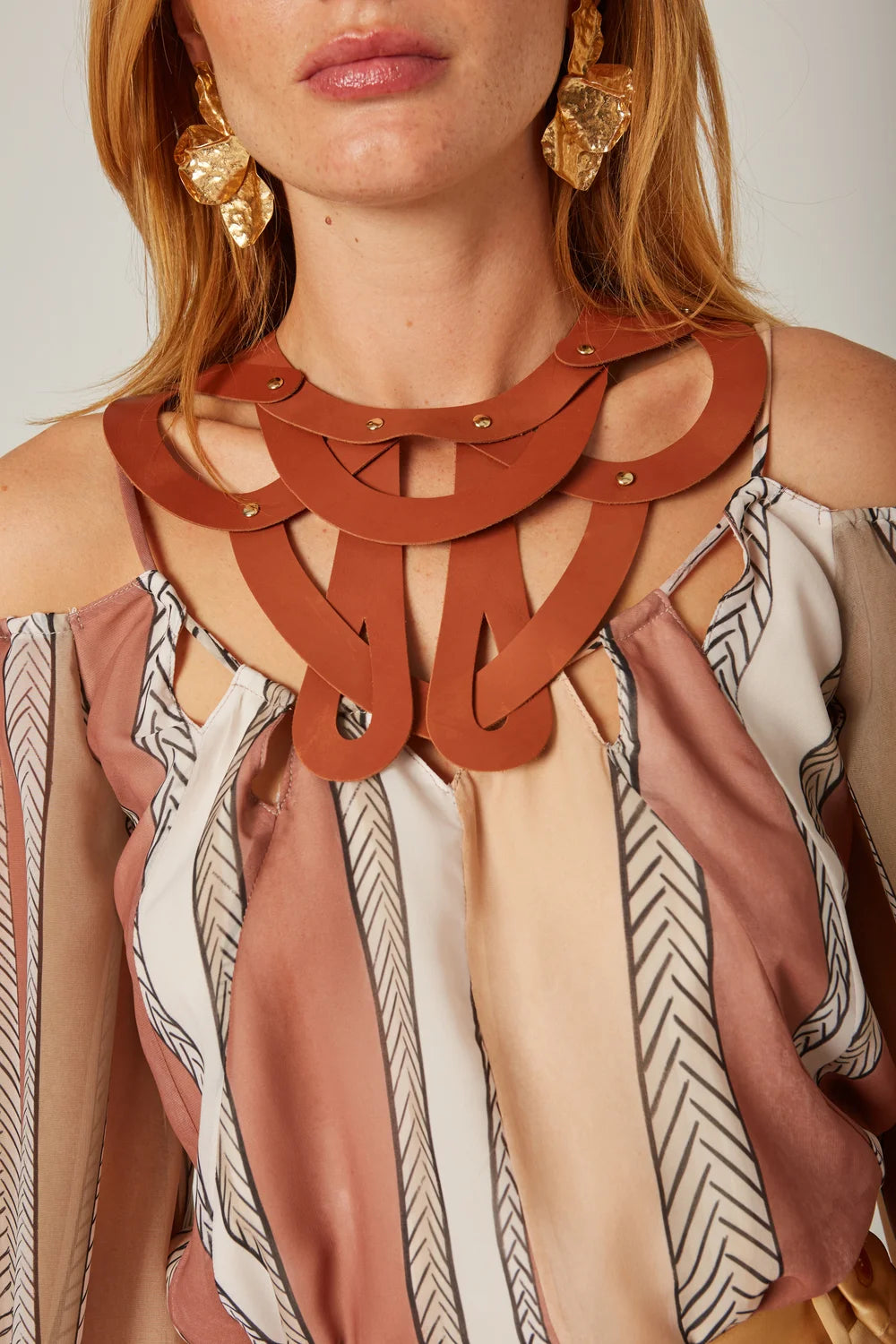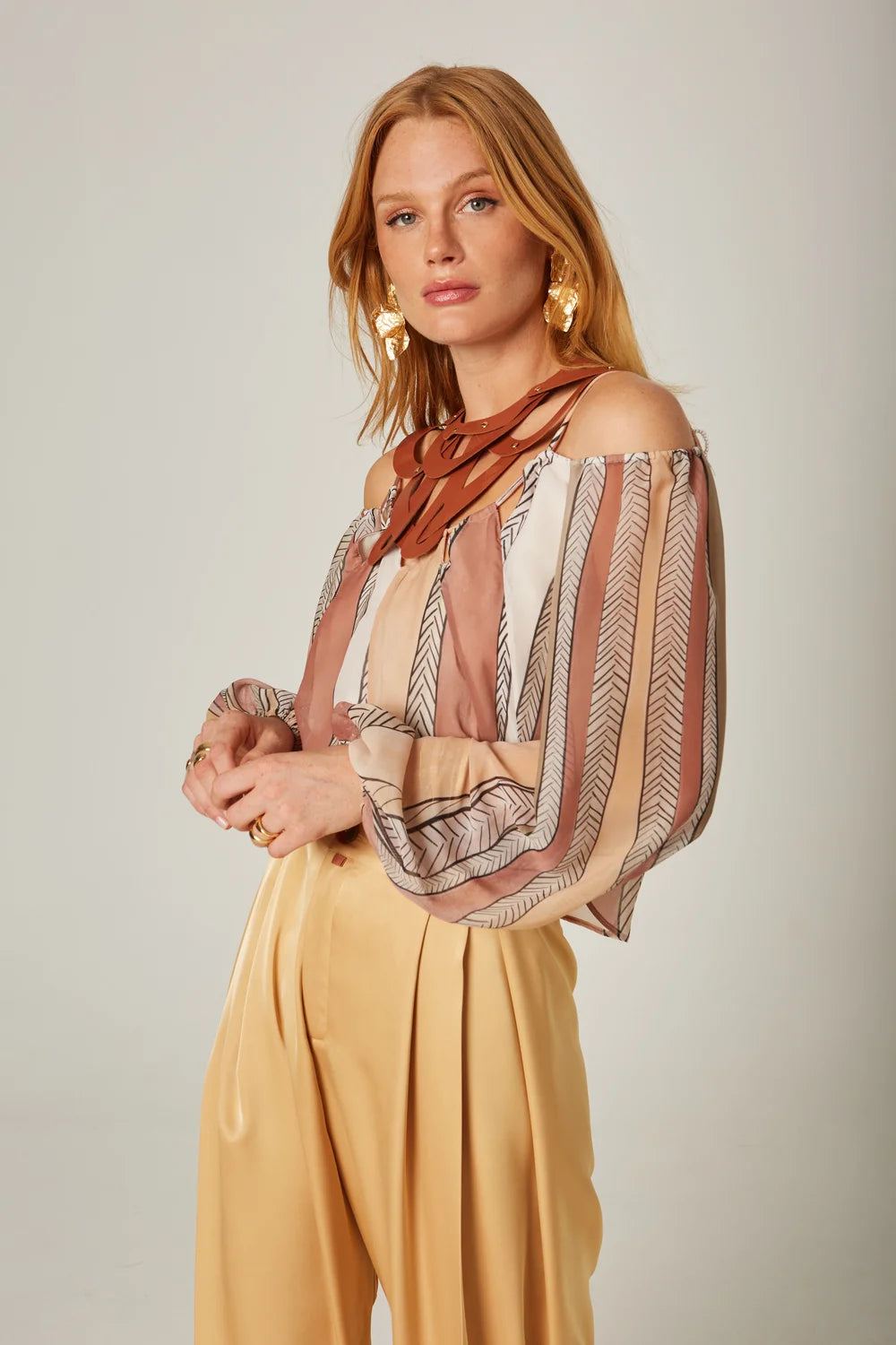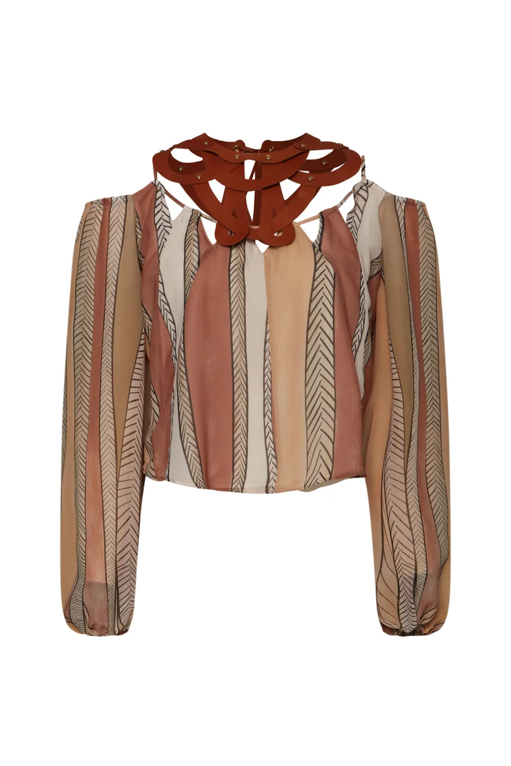 Camisa com estampa étnica de manga comprida com volume. Destaca-se pelo seu espetacular pescoço de 100% pele de vaca. Uso de remover e colocar. Ombros descobertos e costas com um maravilhoso decote em V.