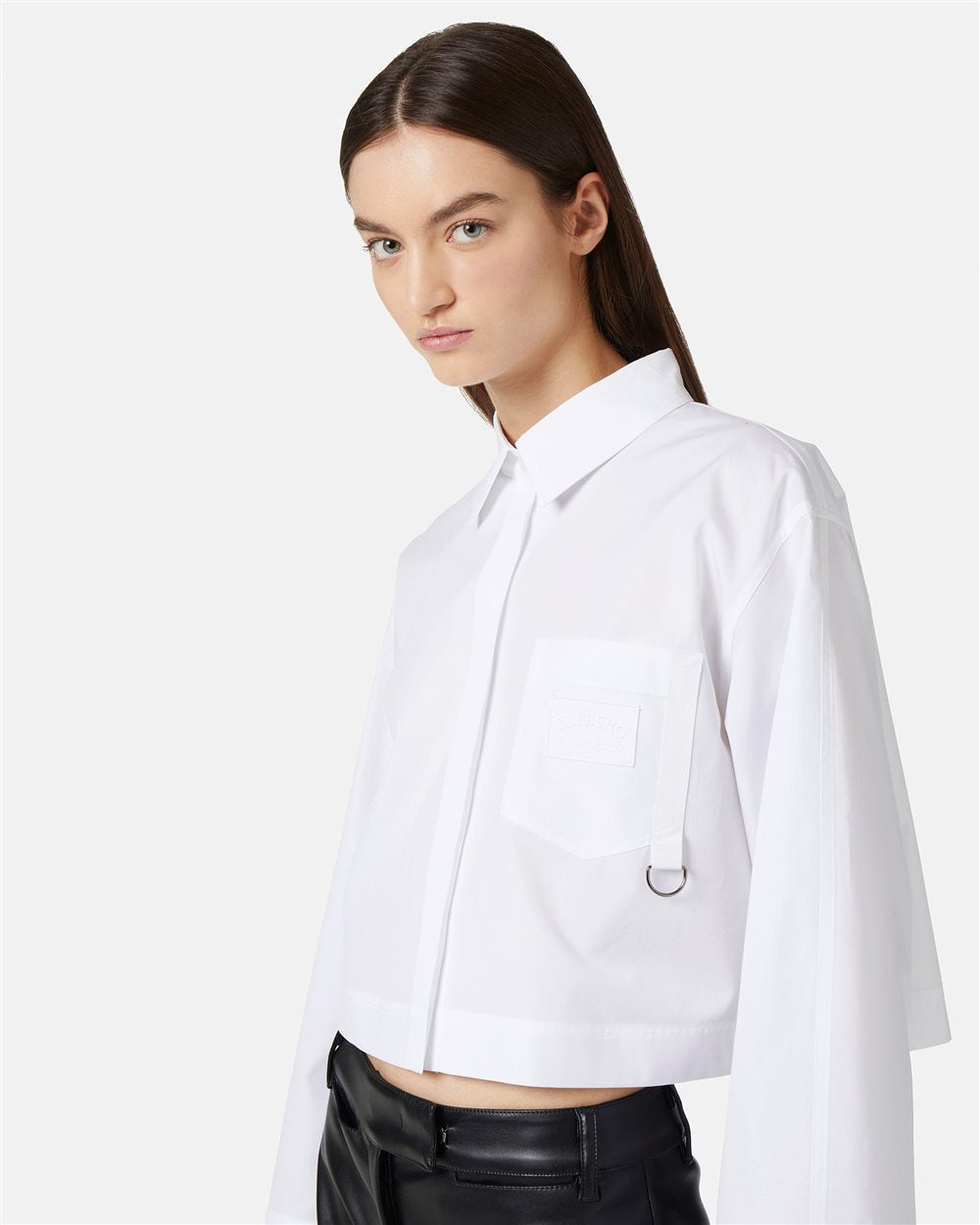 Camisa cropped fit feita de popeline ecossustentável para garantir não apenas um estilo impecável, mas também uma pegada ambiental. As mangas largas dão um toque de elegância moderna, enquanto o detalhe de ilhós e meio anel na lateral do bolso adicionam um elemento chique e contemporâneo, mantido discreto graças ao fecho oculto. O patch bordado do logotipo institucional Iceberg na cor do tom completa o visual com um toque de requinte.