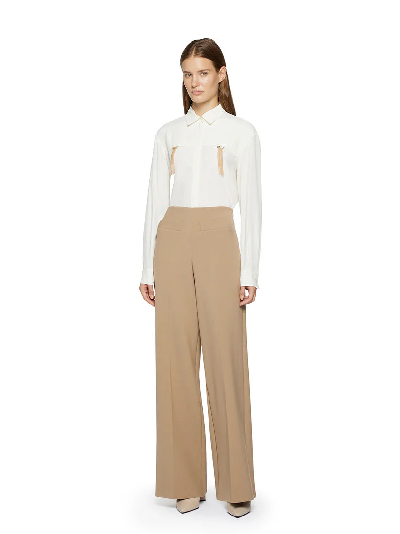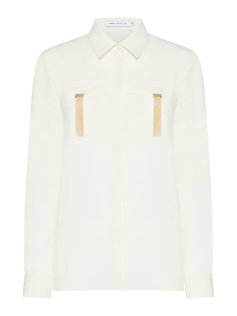 Camisa em acetato de seda com canga dupla e acessório de argola com franjas duplas.