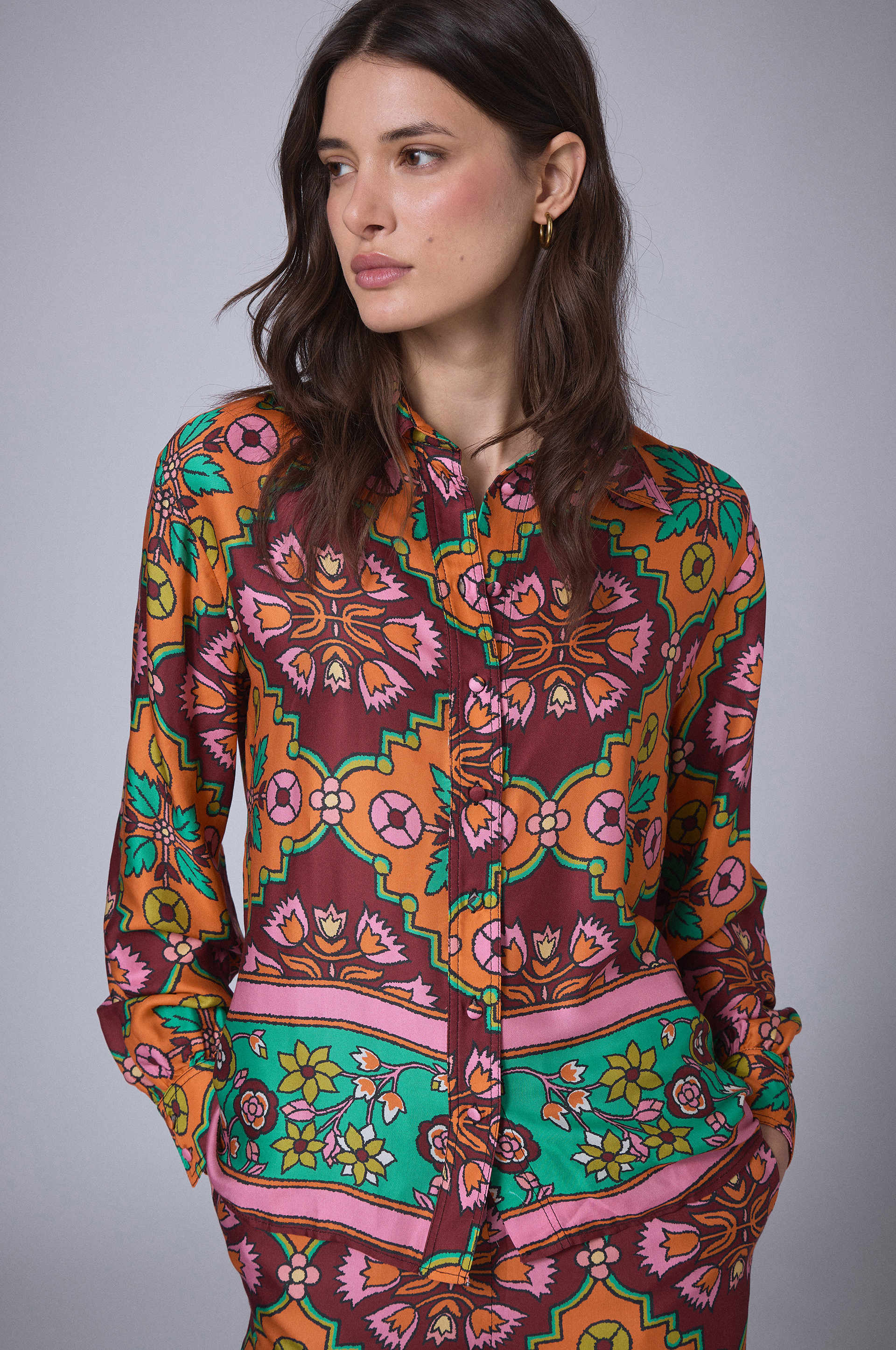 Camisa de manga comprida. Estampa colorida de jaipur. Corte reto. Fechamento por botões na frente e punhos.