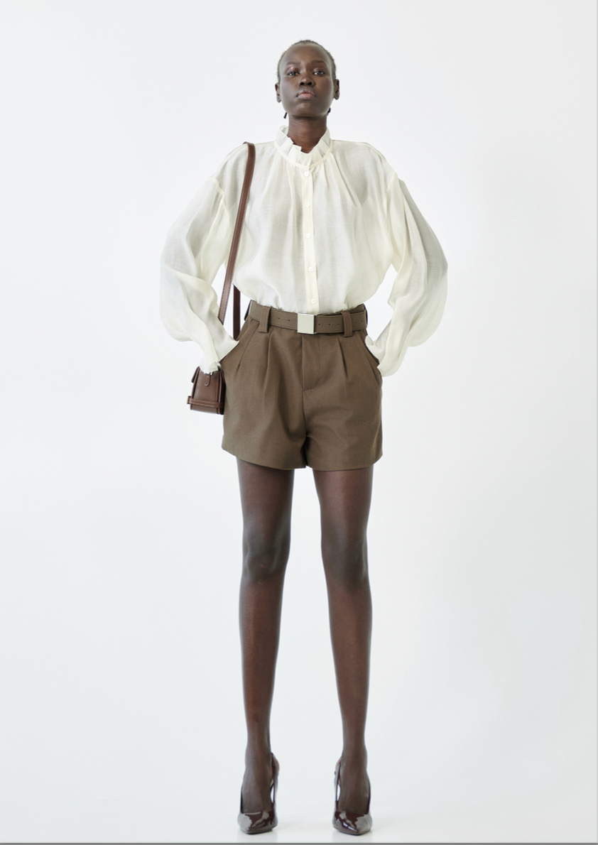 Camisa fluida em tecido leve e translúcido, com gola alta franzida e mangas amplas com punhos ajustados. O design romântico e sofisticado reflete o ADN elegante da marca ELEH, perfeita para composições modernas e femininas. VESTE GRANDE