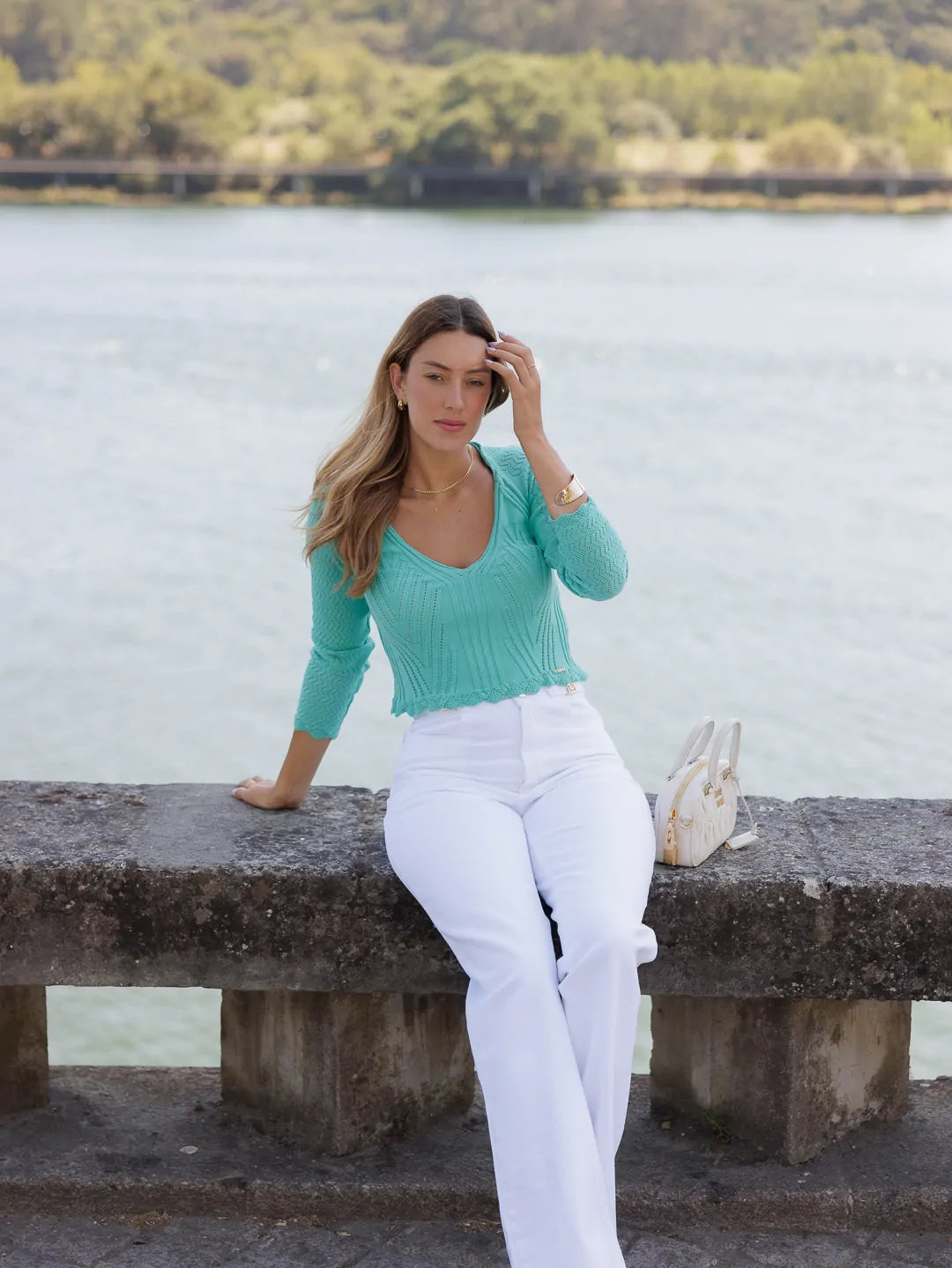 Camisola em malha com decote em V e manga comprida. O fitting da peça é ajustado.
