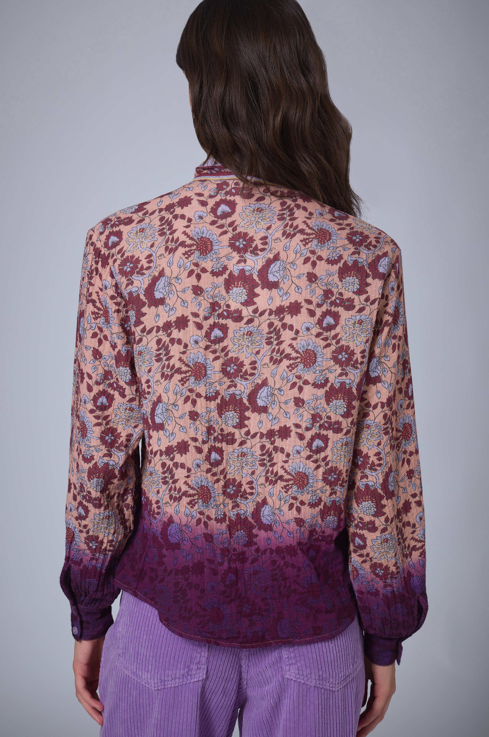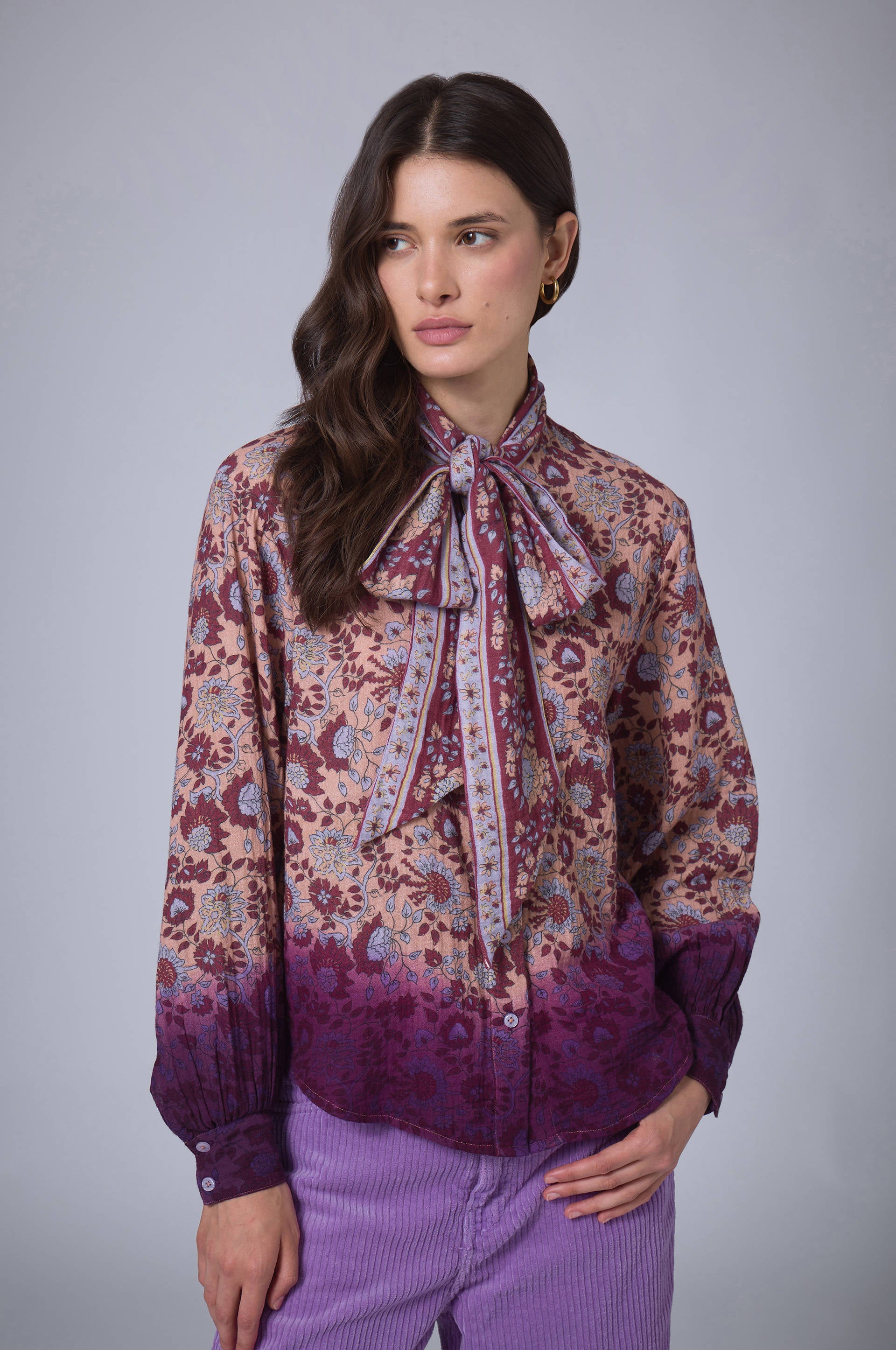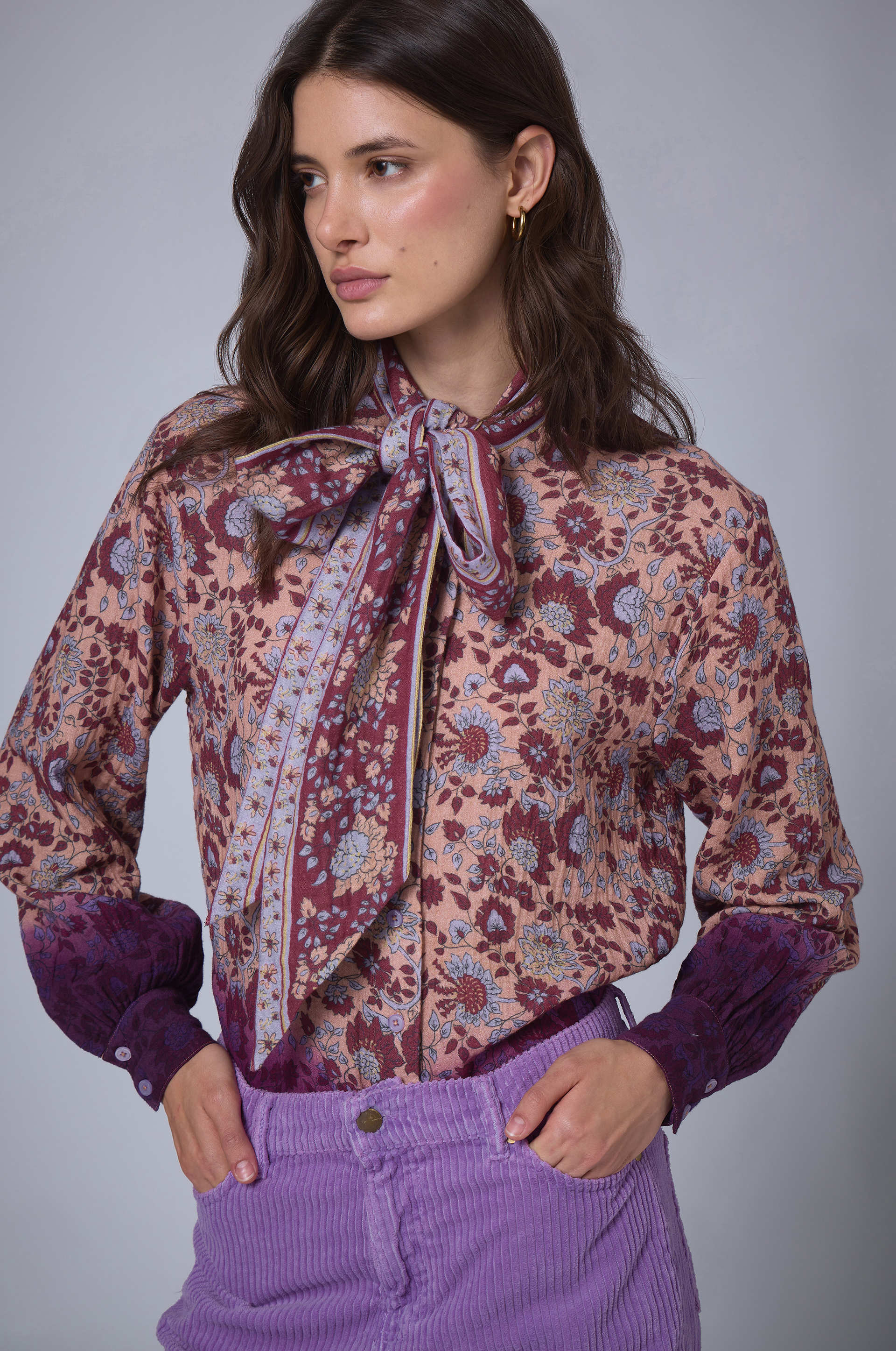 Camisola de manga comprida. Tecido floral e efeito gravata e tingimento. Gola de lapela com nó. Aperto de botão na frente e na parte inferior das mangas.