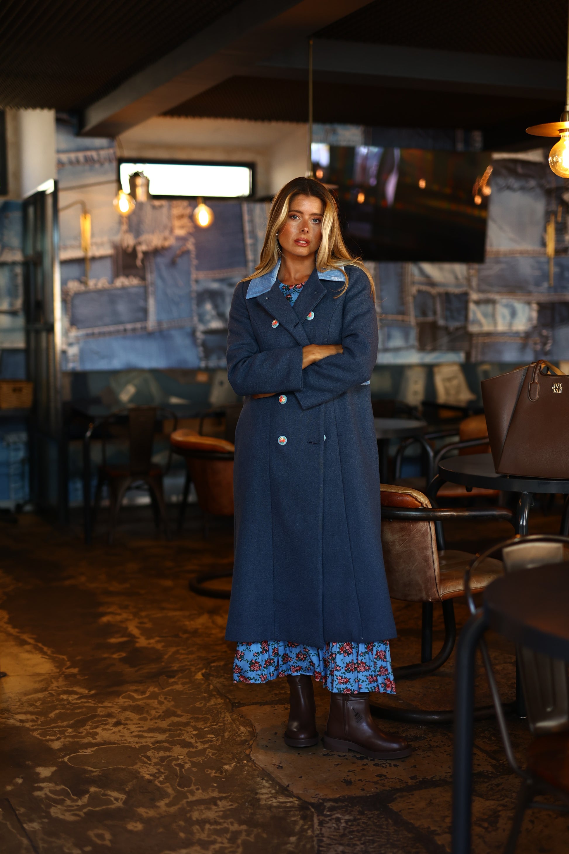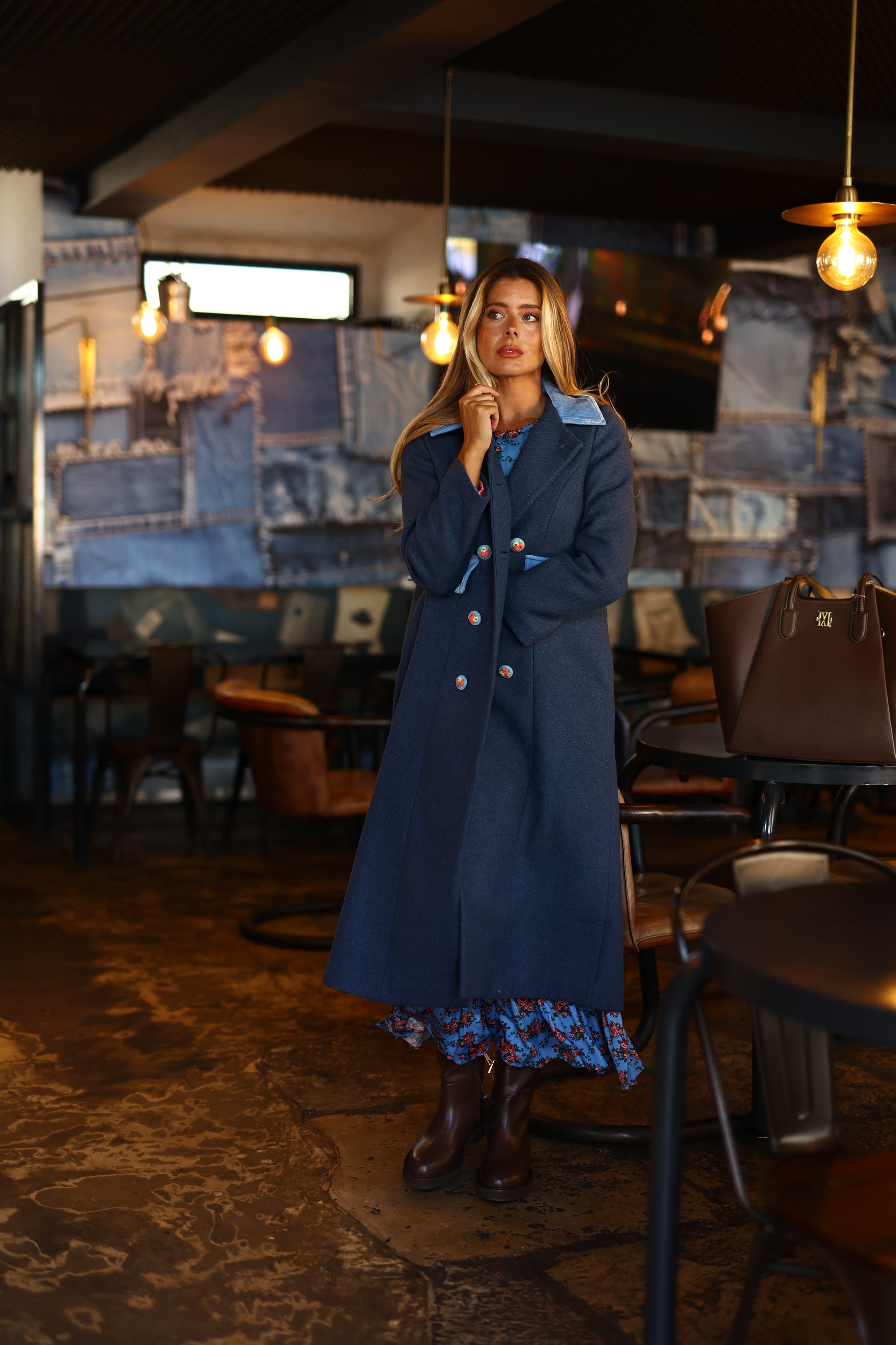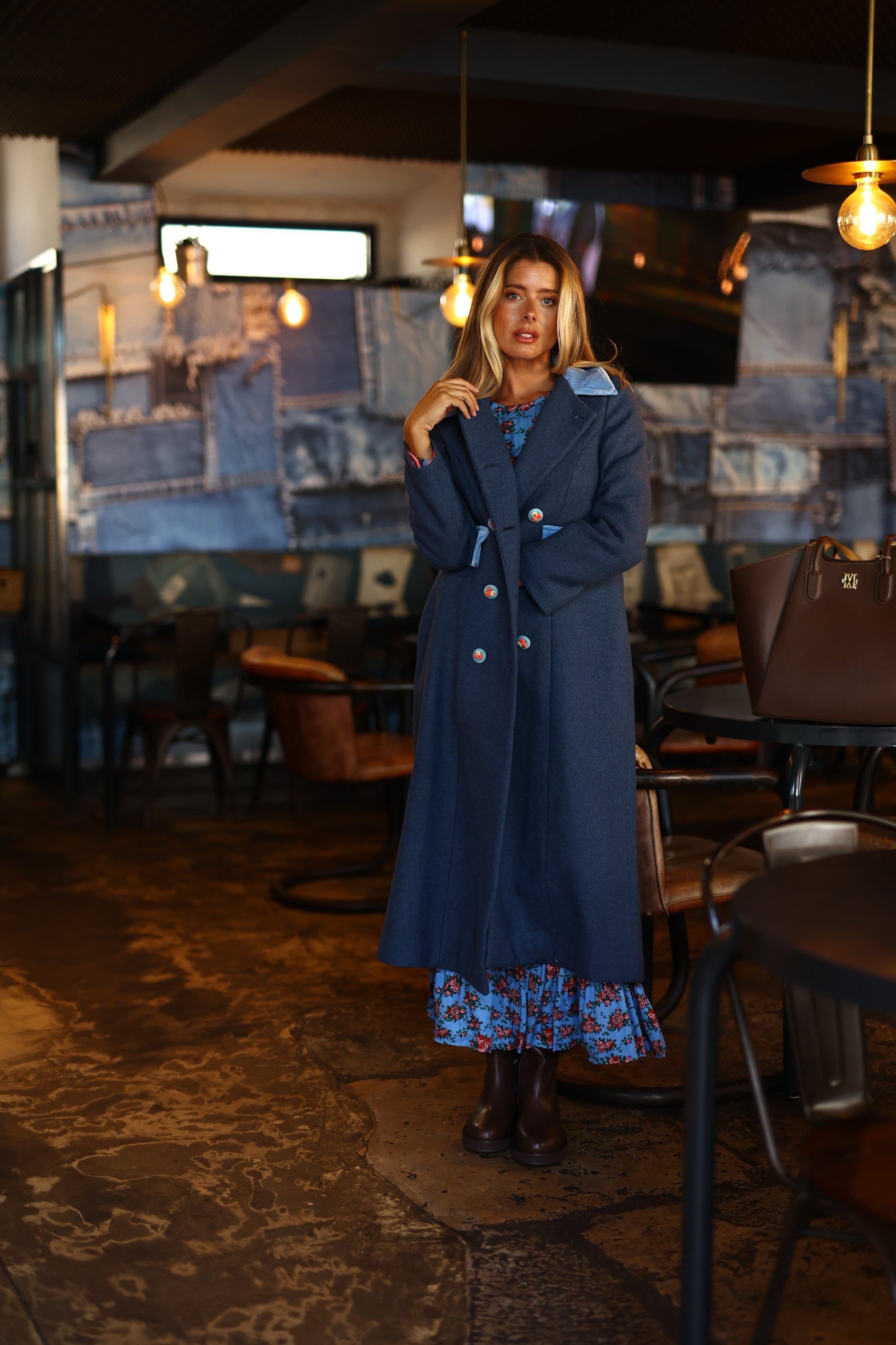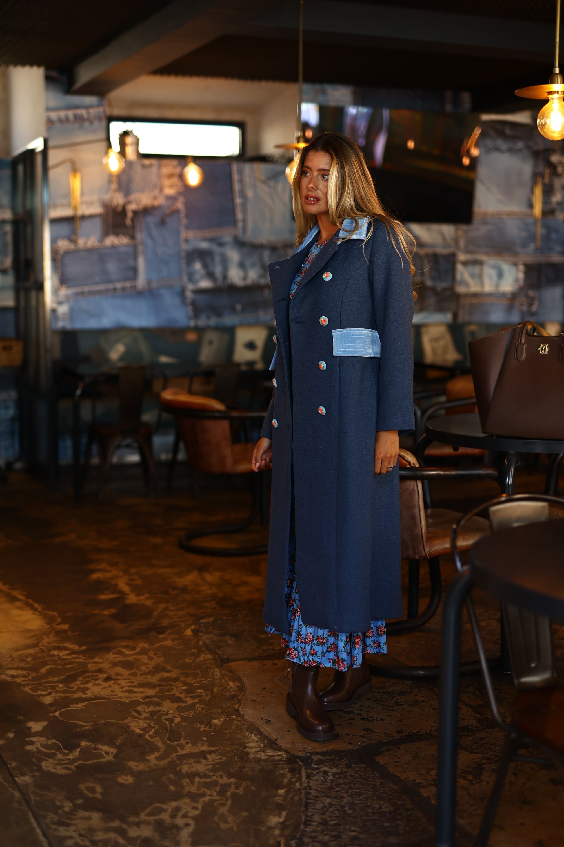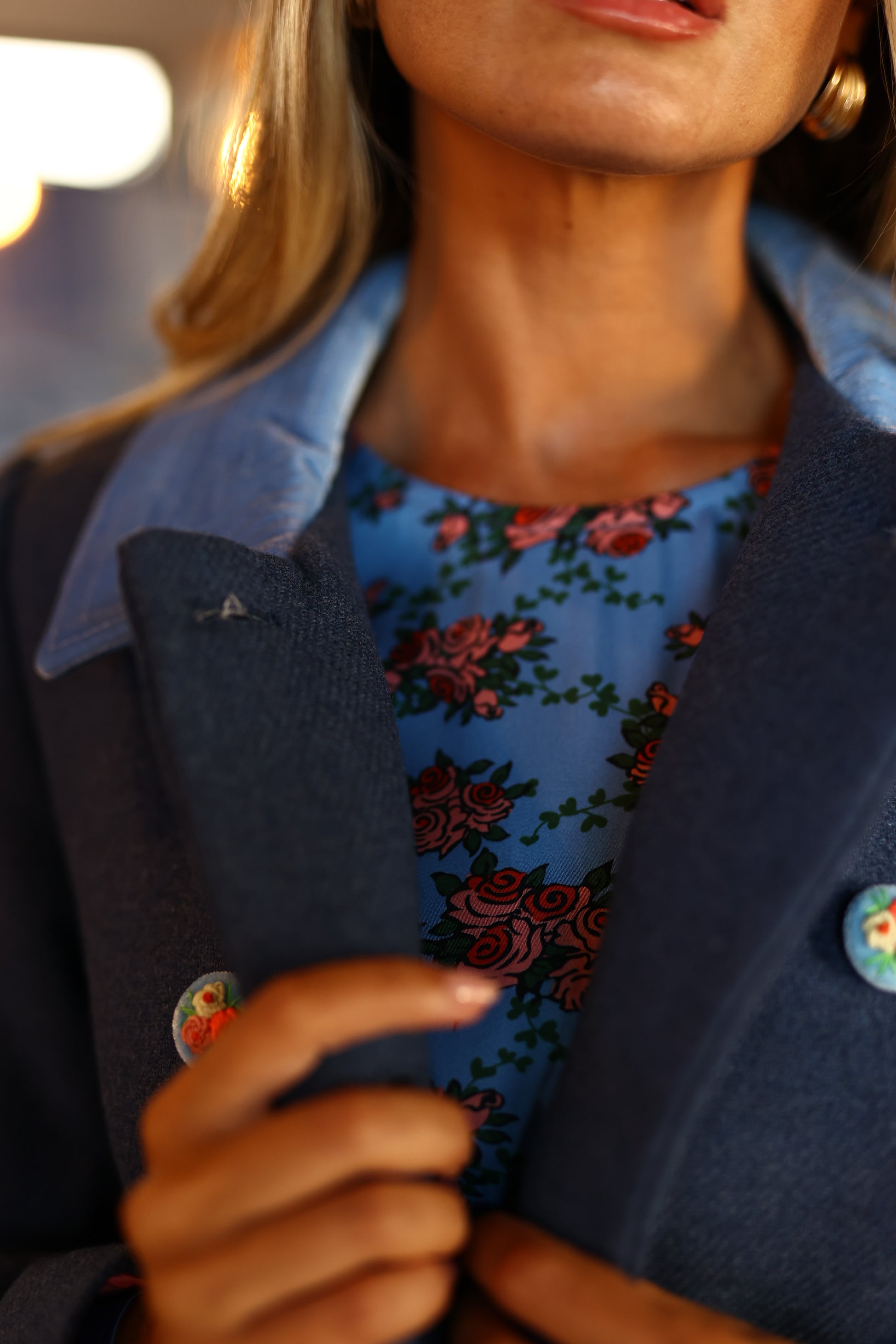 Este casaco trespassado com gola Peter Pan é adornado com botões com detalhes de bordados florais e acabamentos em veludo, combinando elegância e sofisticação com um toque feminino.