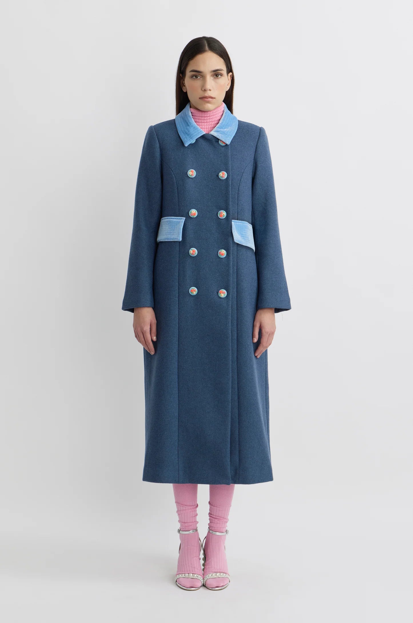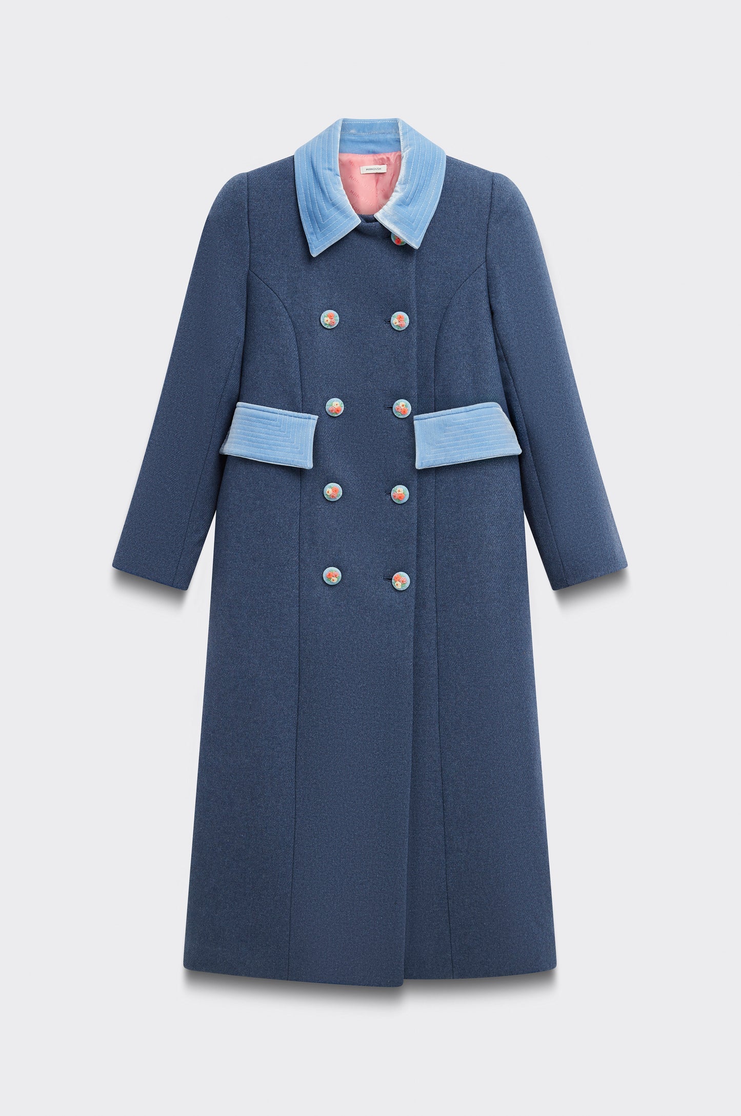 Este elegante casaco cruzado destaca-se pelos seus detalhes femininos e sofisticados. O colarinho e as abas em veludo azul-claro contrastam delicadamente com o tom azul profundo da peça, enquanto os botões com aplicações florais bordadas adicionam um toque romântico e artesanal.