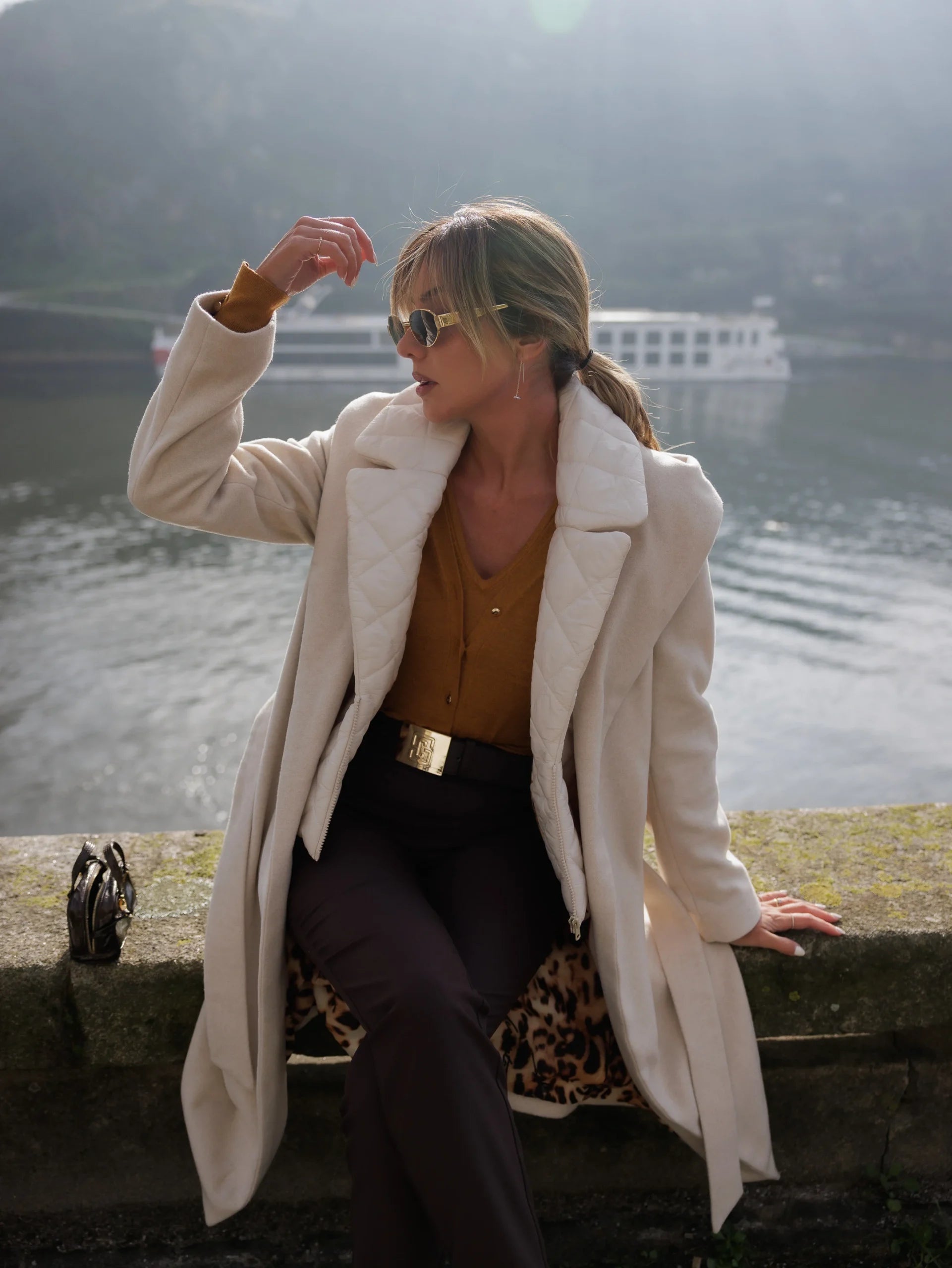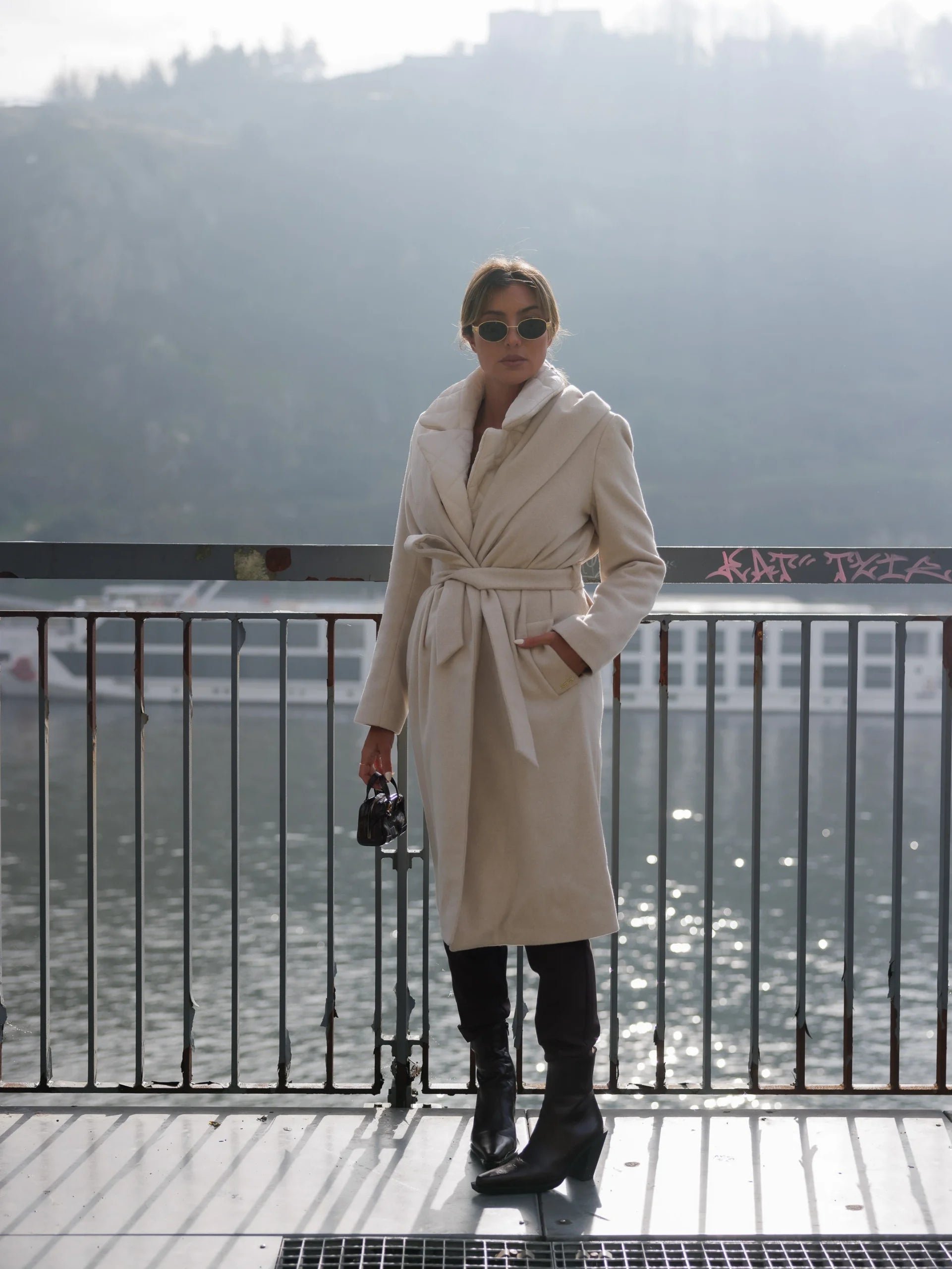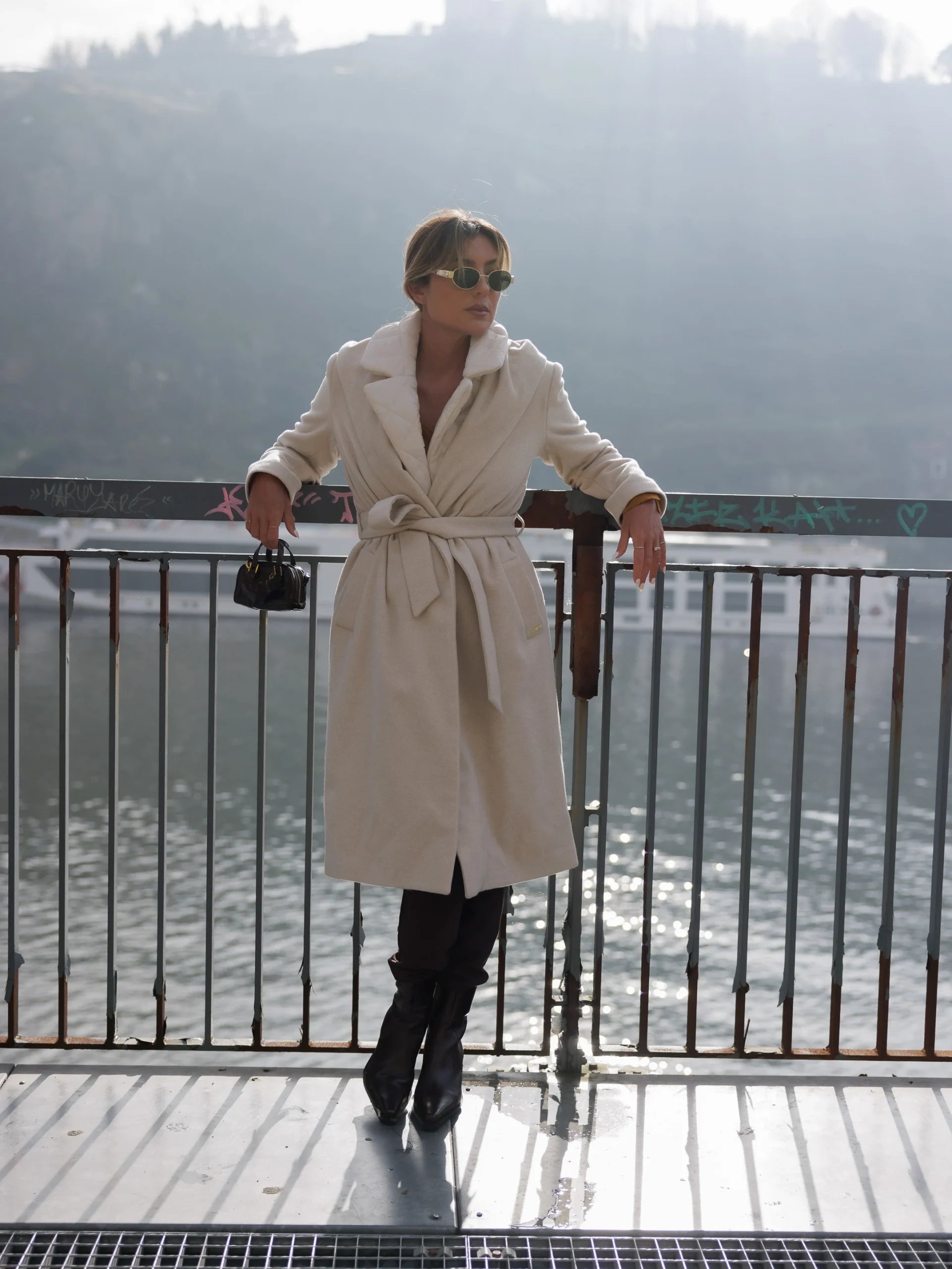 Casaco comprido com capuz e manga comprida. Efeito de colete em artigo fantasia na parte frontal. Bolso quadrado e frente do casaco cruza com cinto. Fitting da peça é fluído.