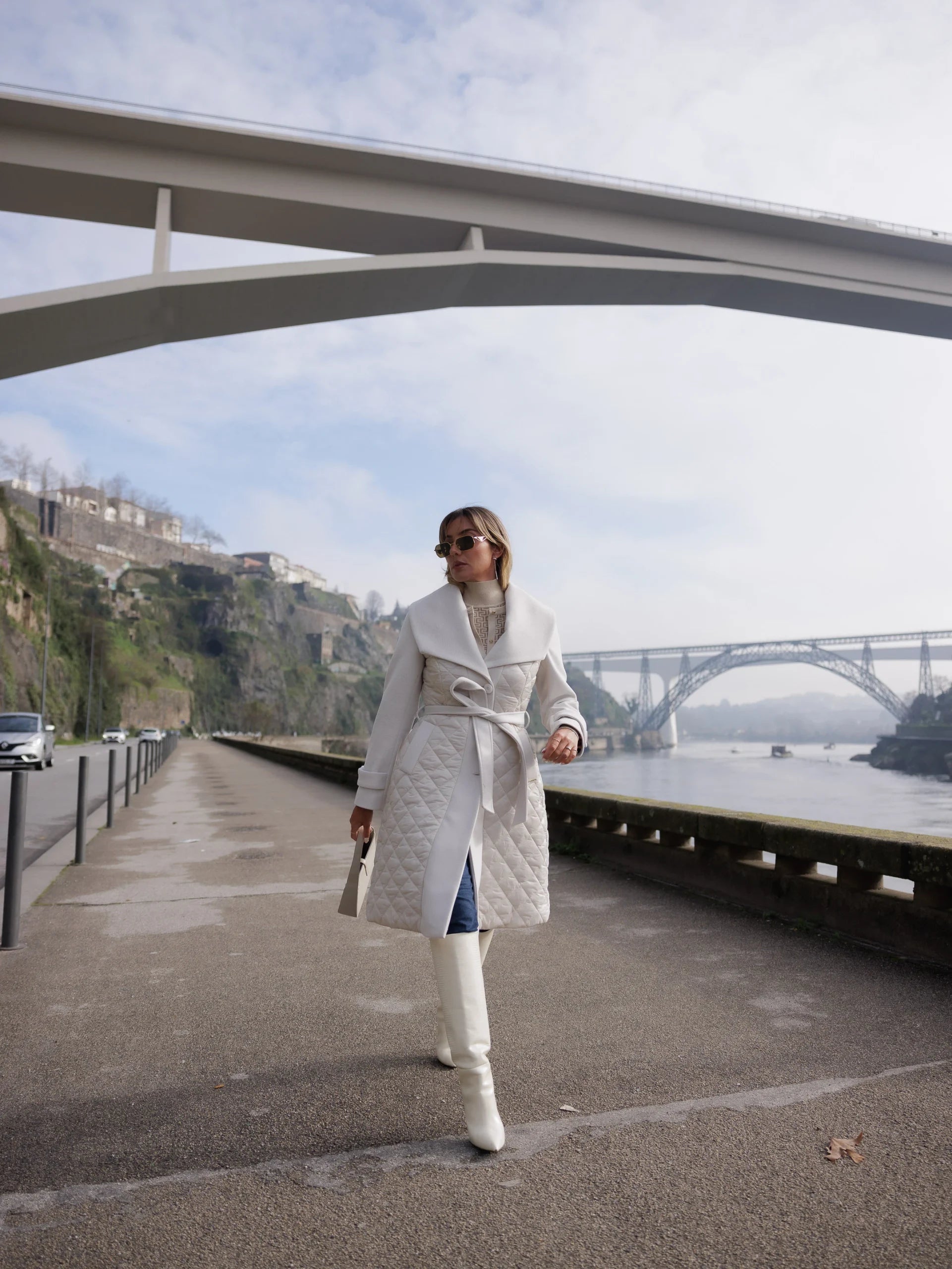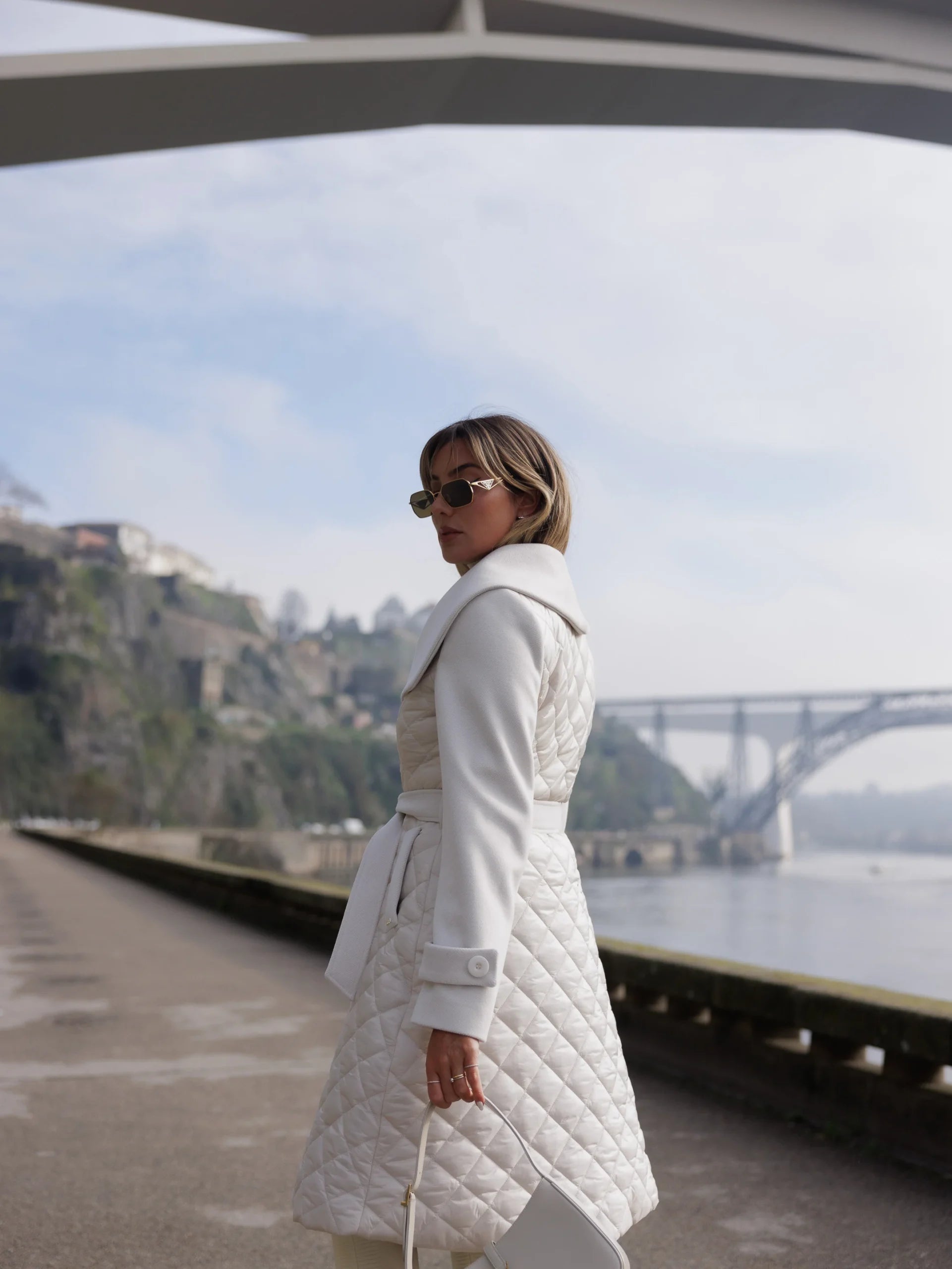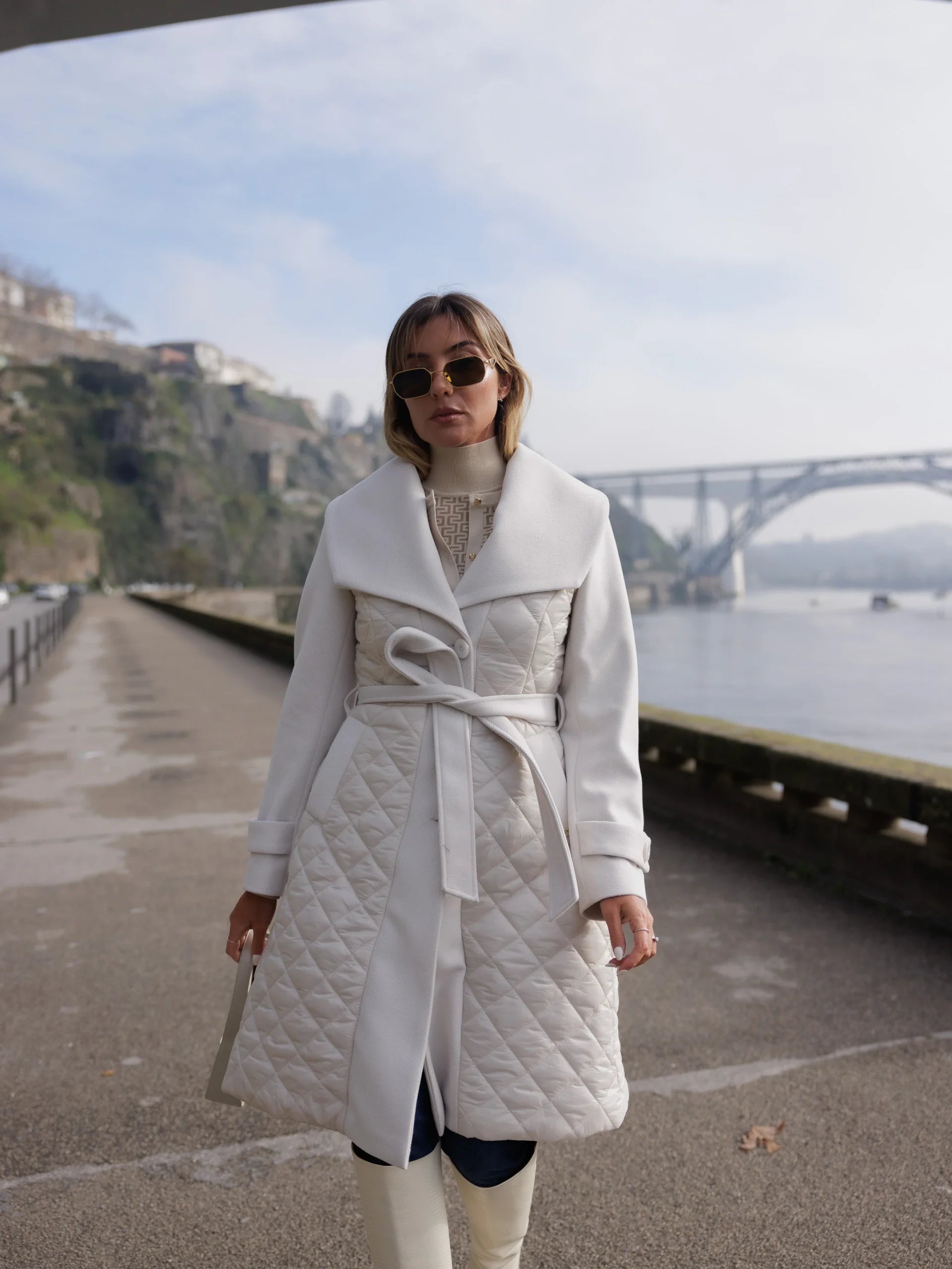 Casaco de comprimento médio em artigo liso e acolchoado. Manga comprida e gola de abas largas. Aperta na frente com botões. Detalhe de presilhas no fundo da manga e aperta com cinto ajustável. Fitting da peça com godé no fundo.
