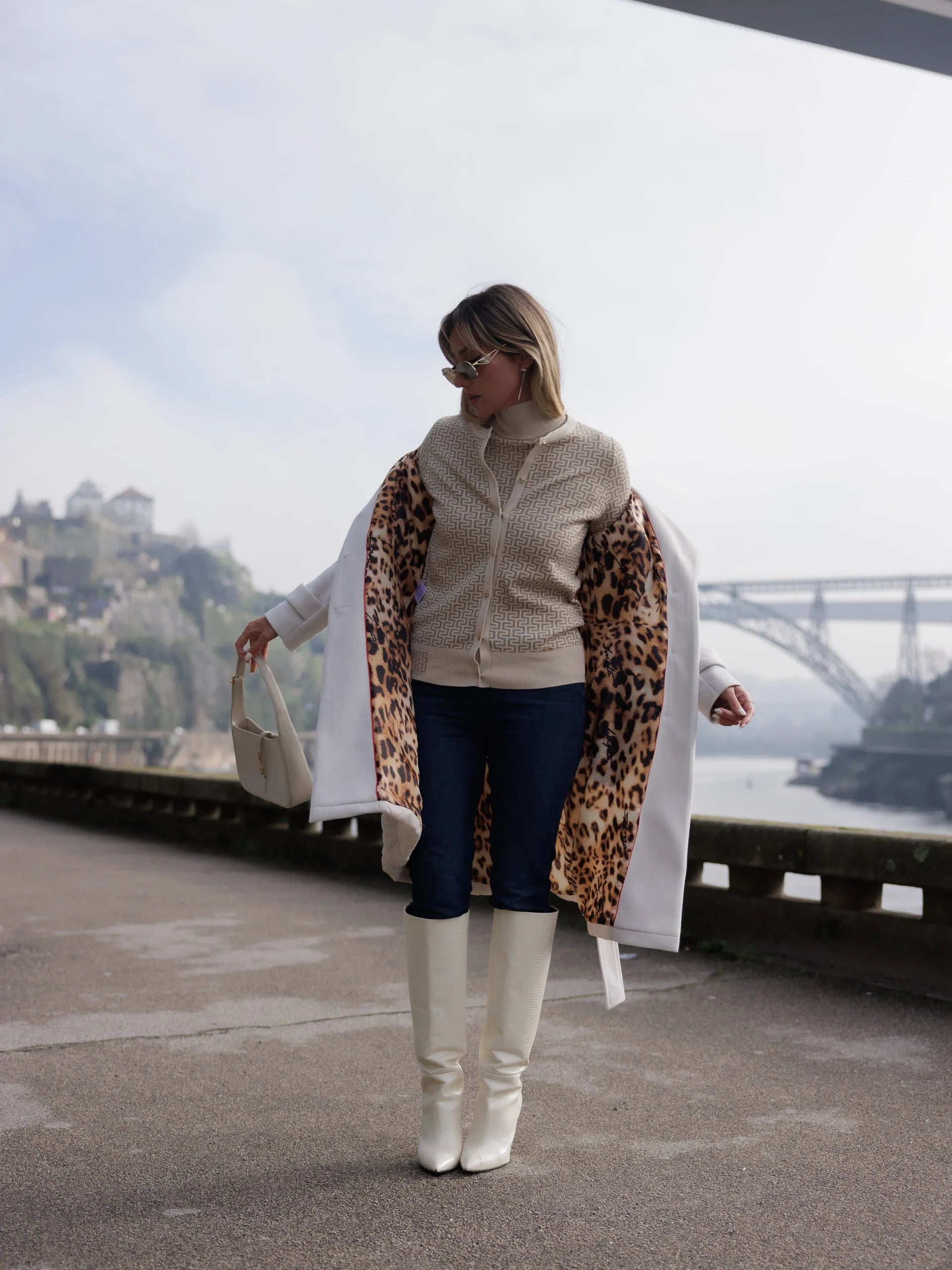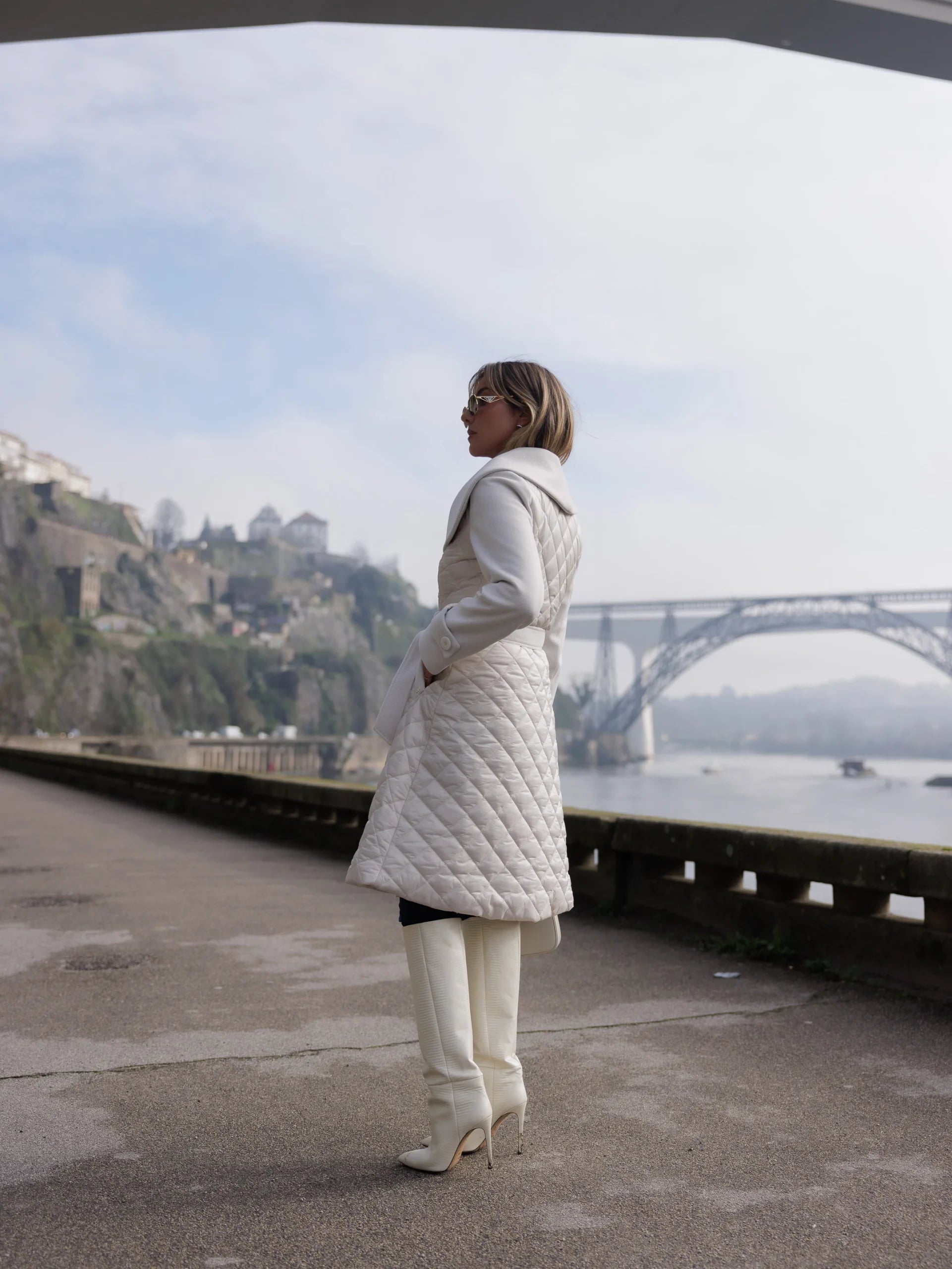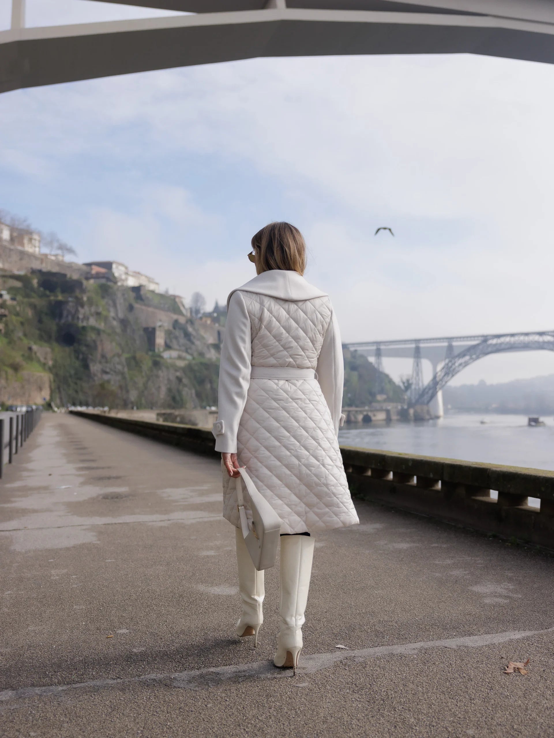 Casaco de comprimento médio em artigo liso e acolchoado. Manga comprida e gola de abas largas. Aperta na frente com botões. Detalhe de presilhas no fundo da manga e aperta com cinto ajustável. Fitting da peça com godé no fundo.