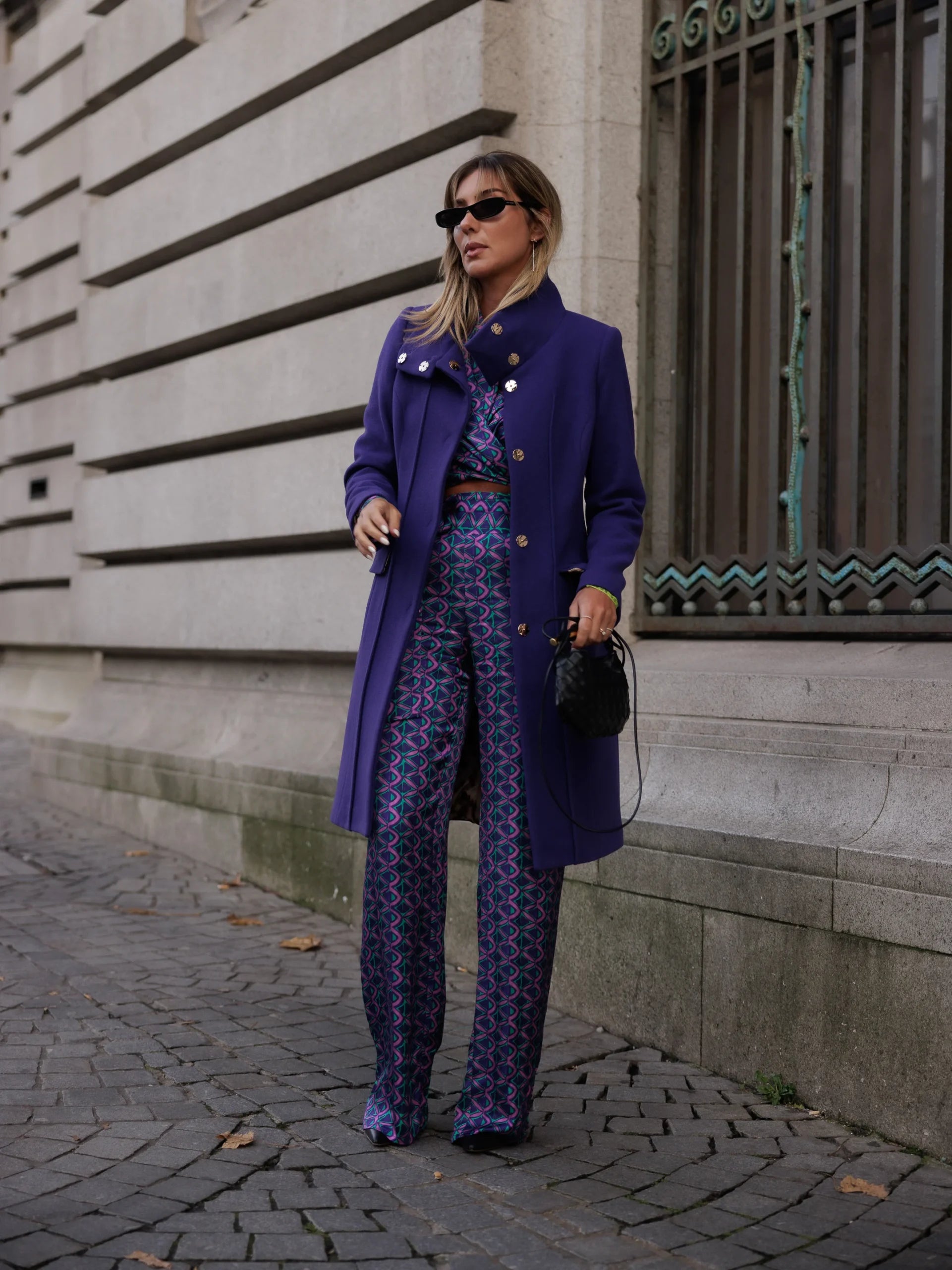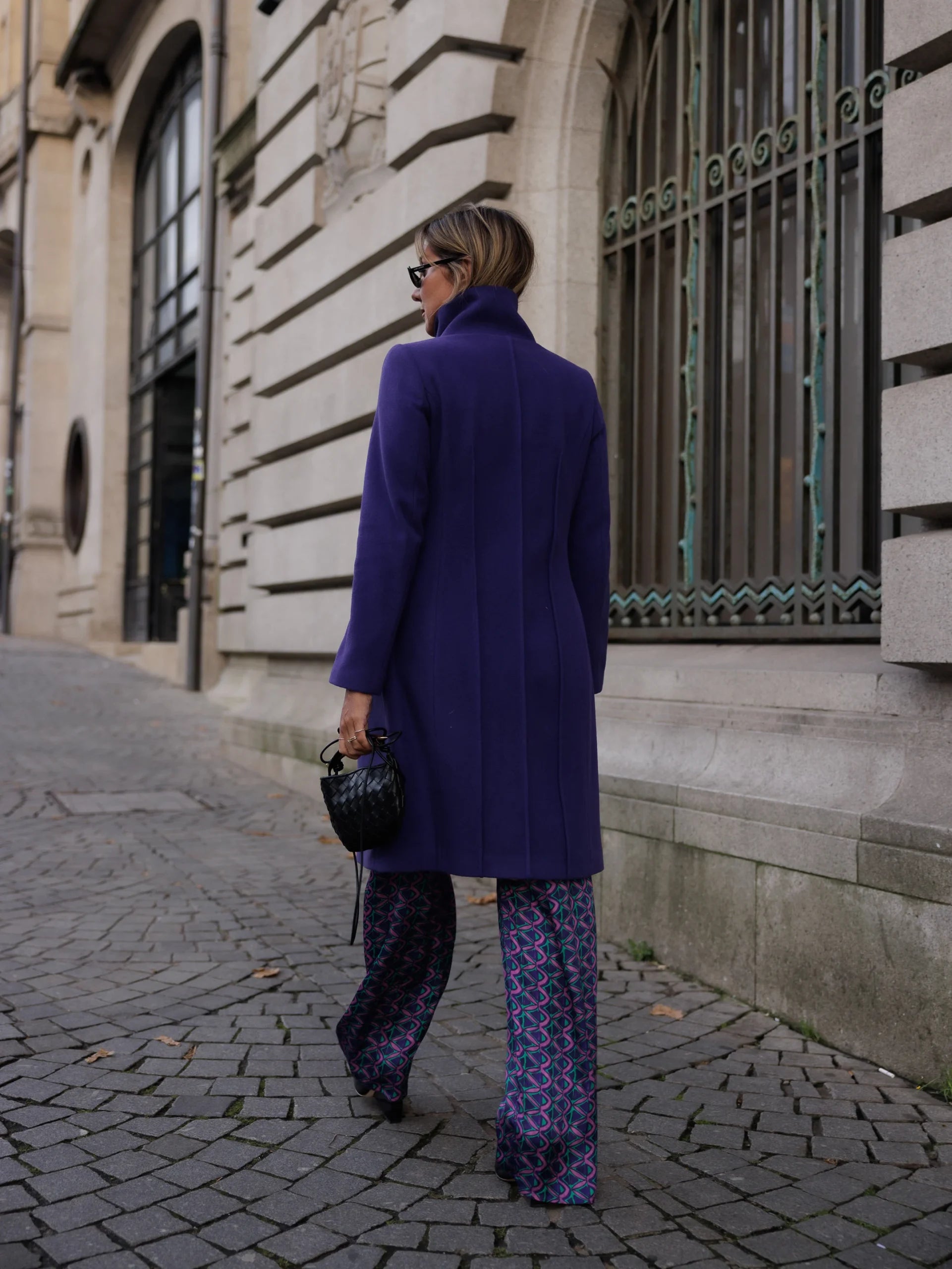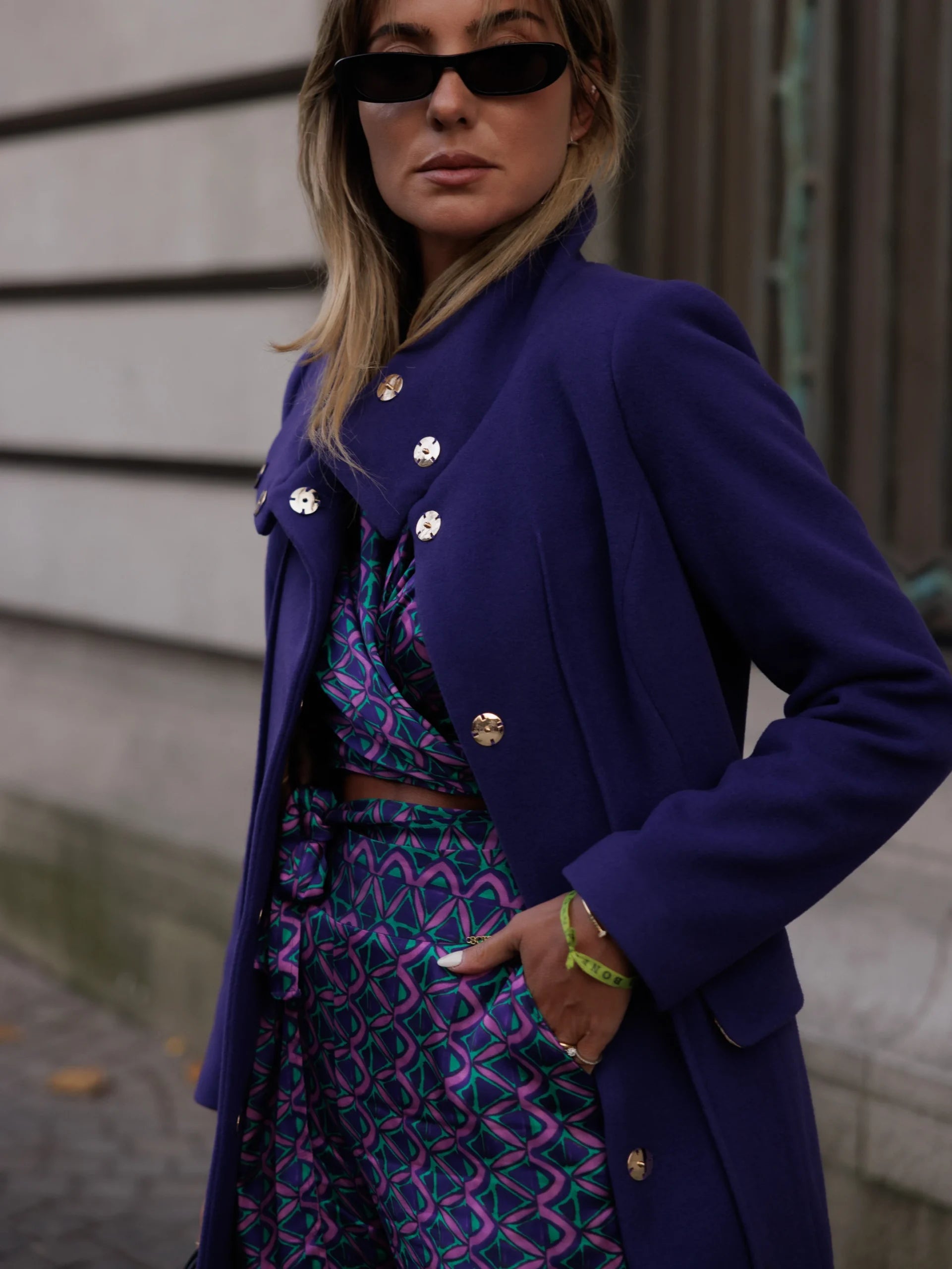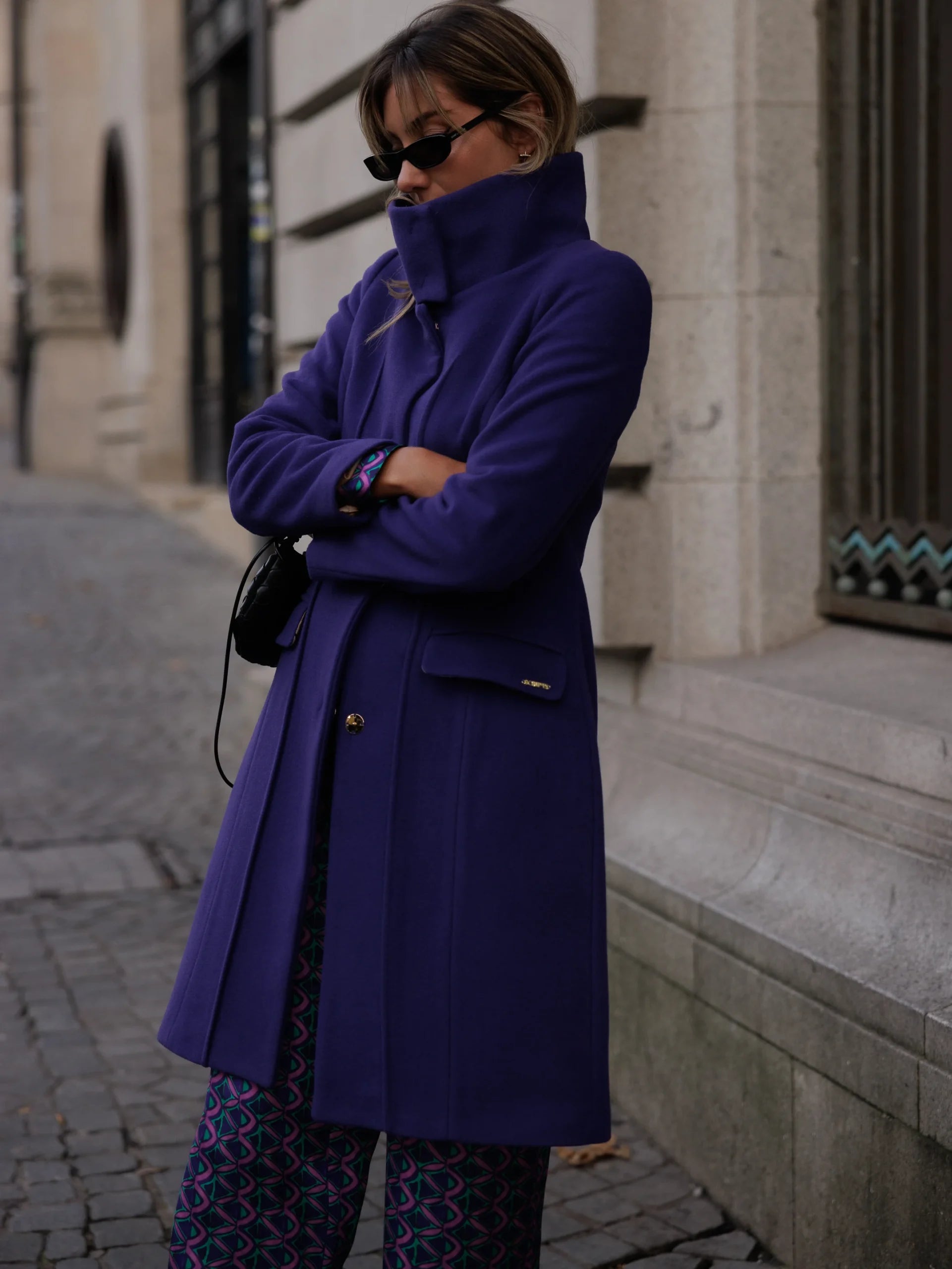 Casaco de comprimento médio, com gola e frente a apertar com molas douradas. Possui bolsos de palas. Manga comprida. Detalhe de nervuras prespontadas. O fitting da peça é ajustado.