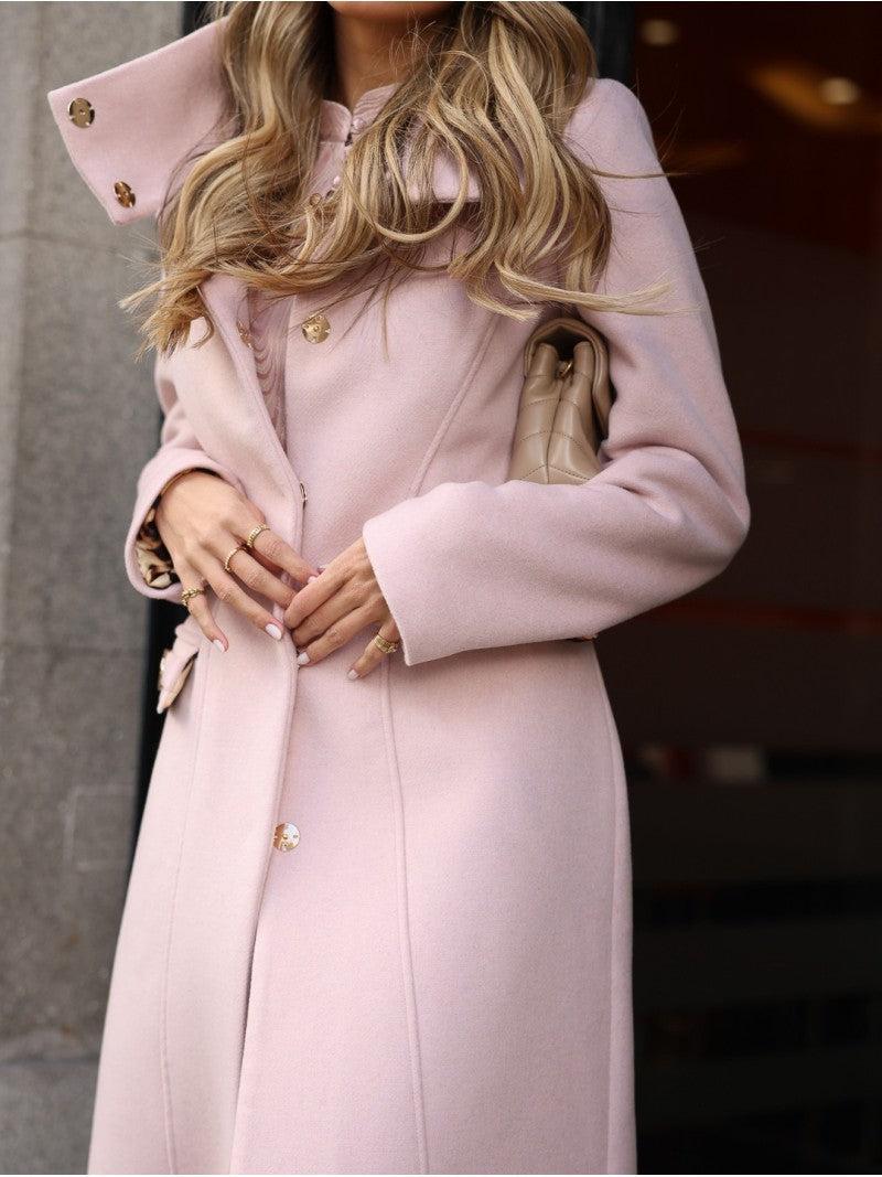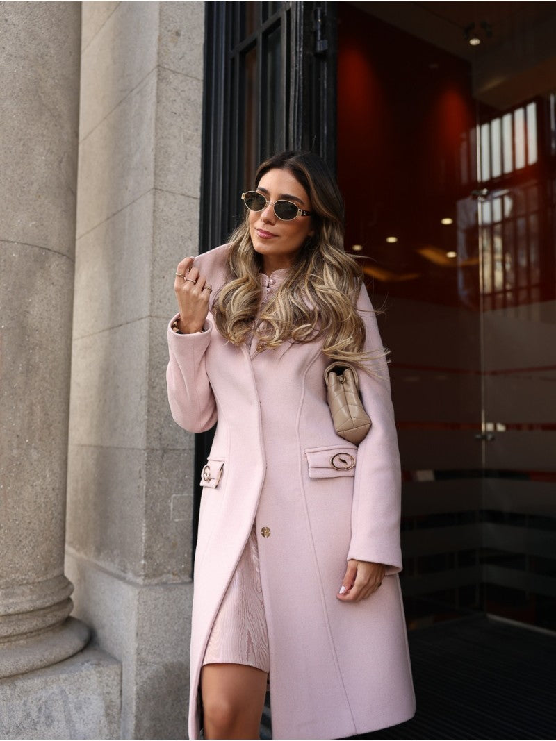 Casaco comprido em lã com corte estruturado e acabamento elegante. O modelo apresenta gola ampla e bolsos com pala decorados por botões metálicos dourados, que adicionam um toque sofisticado e feminino. O design cintado valoriza a silhueta, tornando-o perfeito para coordenar com vestidos, saias ou looks formais.