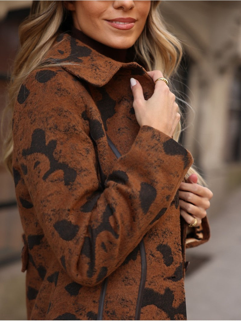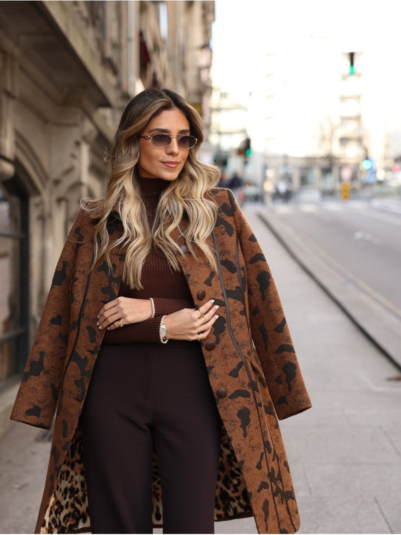 Casaco comprido em tecido encorpado com padrão animal print em tons de castanho e preto. O modelo apresenta gola clássica com lapelas largas e forro interior contrastante com estampa de leopardo, criando um efeito visual impactante e elegante. A mistura de fibras garante conforto e estrutura, tornando esta peça perfeita para looks sofisticados e ousados nos dias frios.
