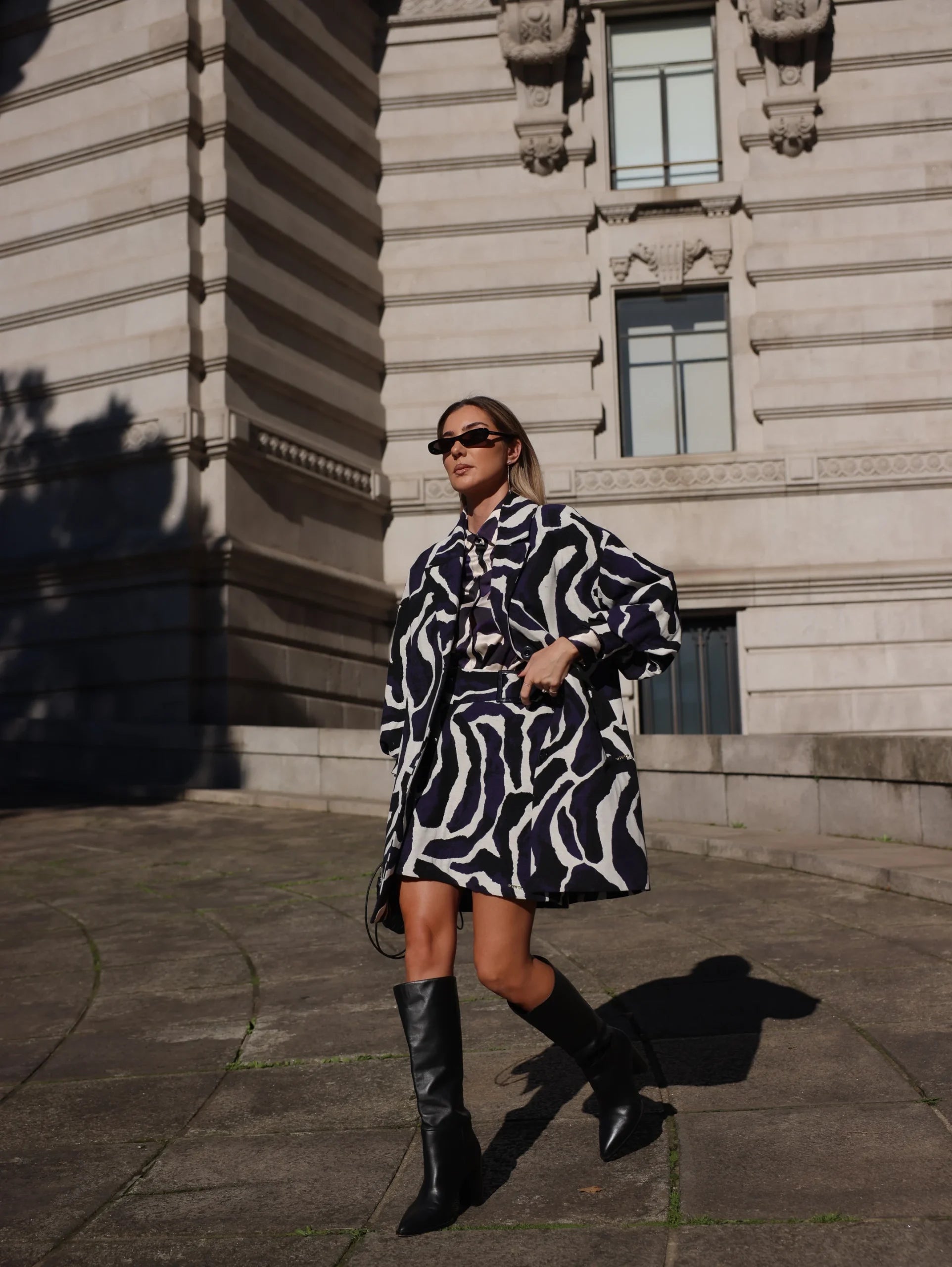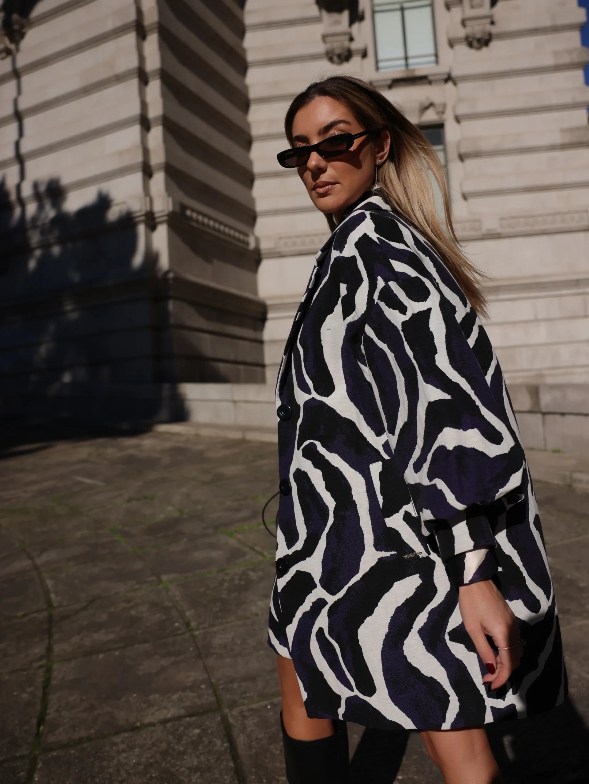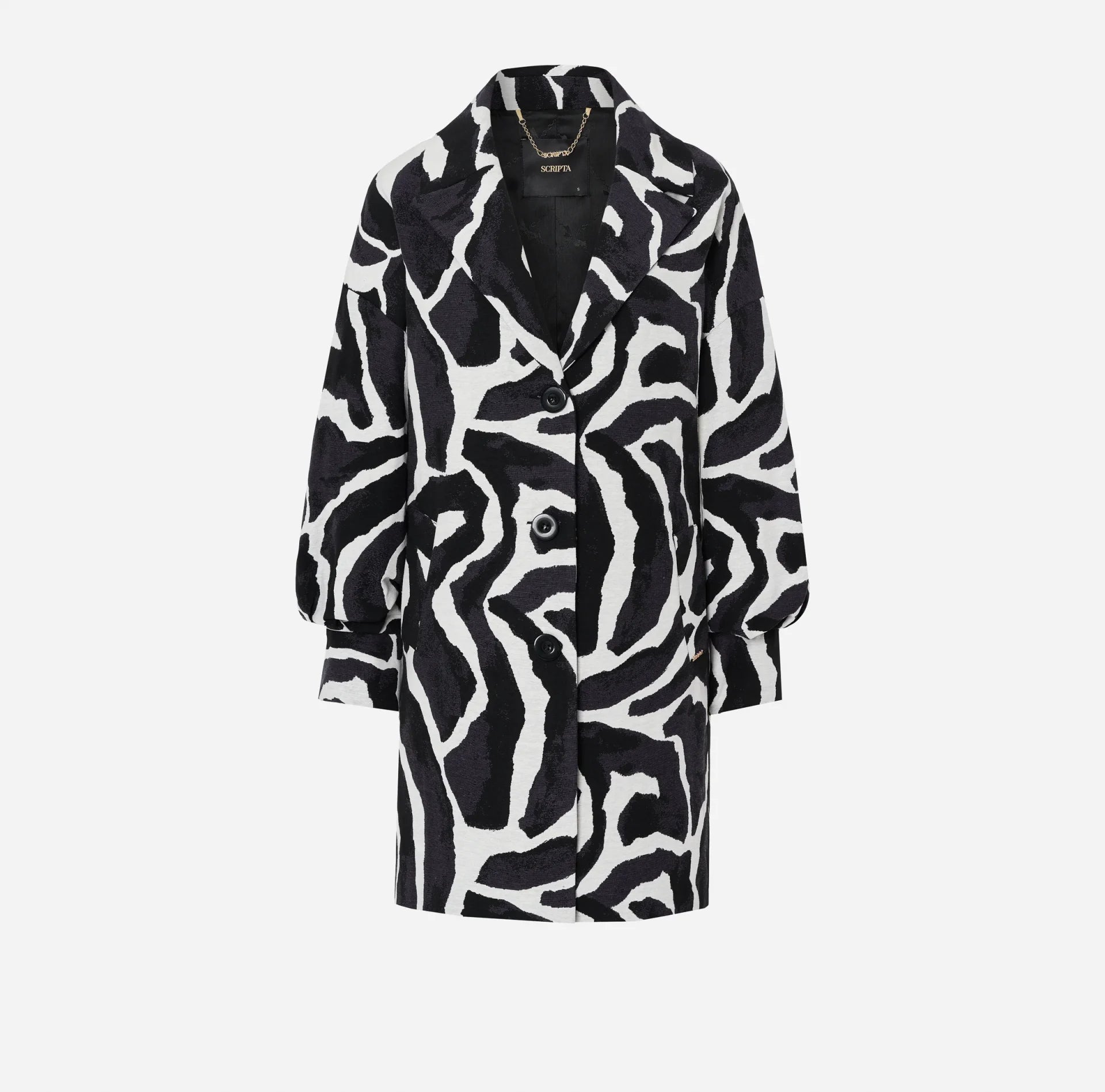 Casaco em jacquard de comprimento médio com gola de abas. Manga 3/4 com efeito balão e bolsos quadrados. A frente do casaco aperta com três botões e o fitting é solto.