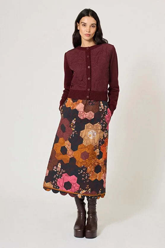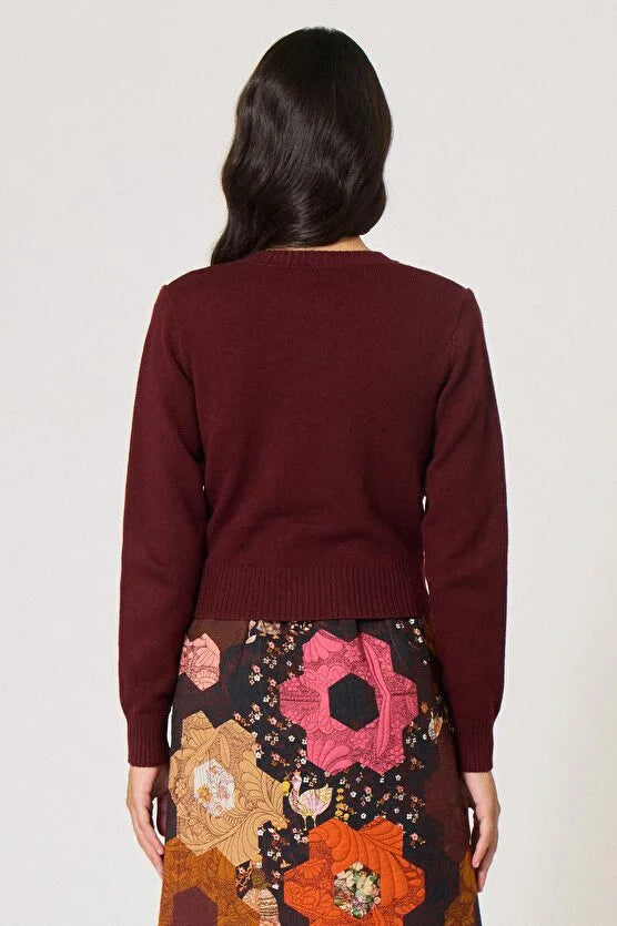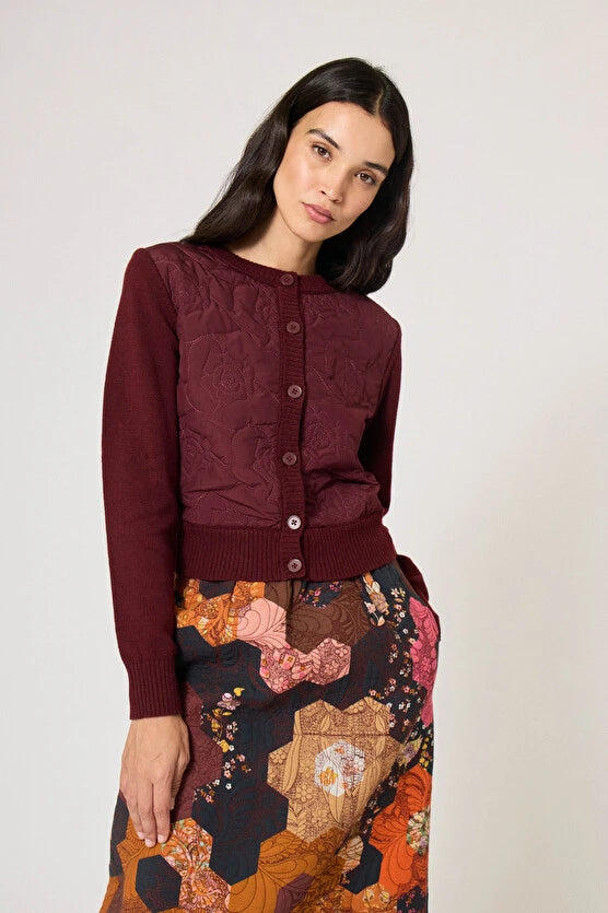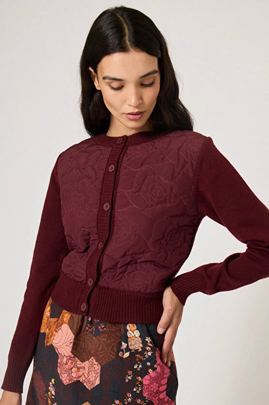 Gilet bi-matière à col rond. Devant en polyester recyclé; Dos et manches en maille de laine. Fermeture avant avec 6 boutons. Logo "Manoush" brodé sur le devant gauche. Manches longues.