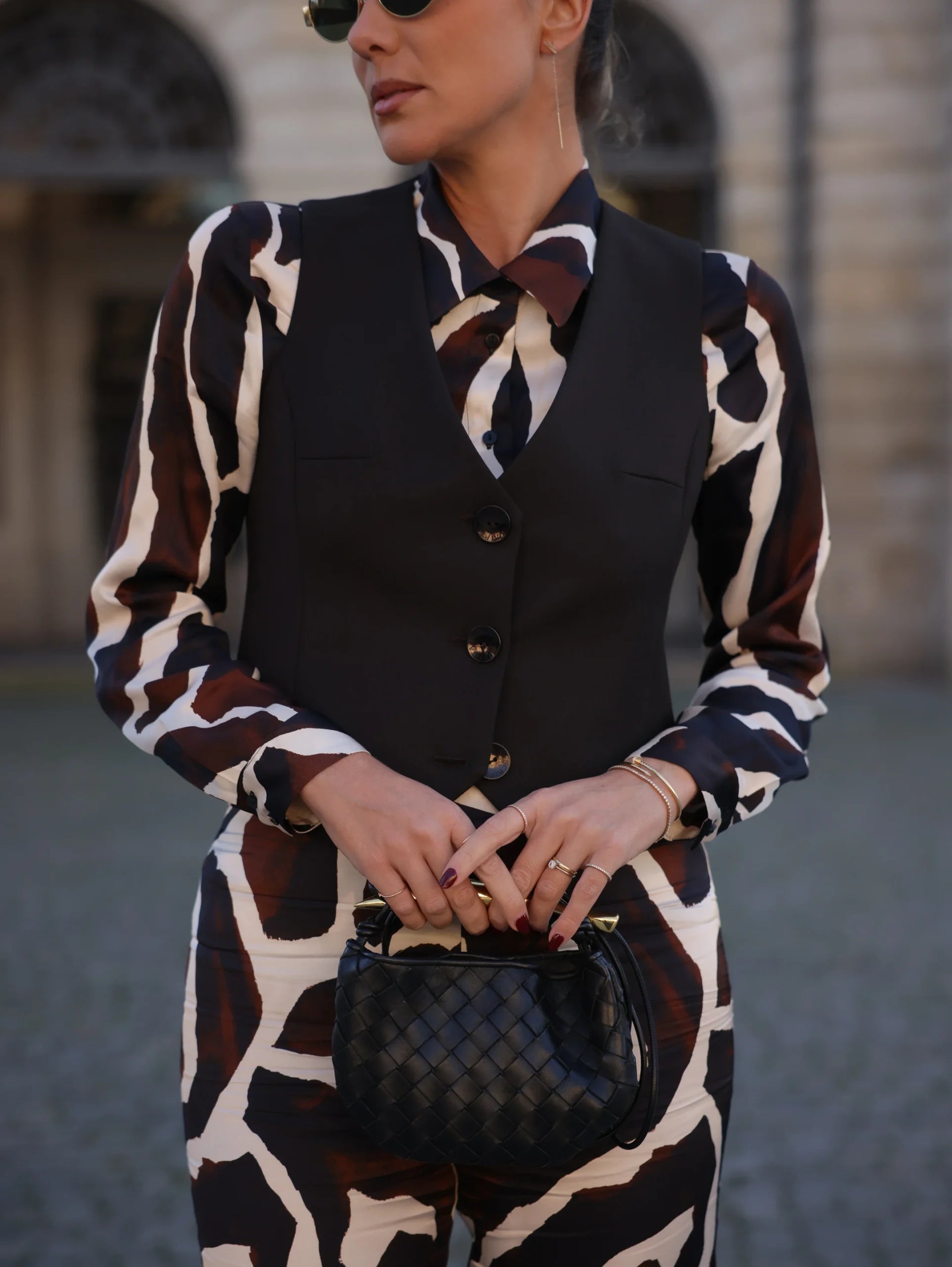 Colete em tecido de liso. Fecho frontal com três botões personalizados, ao tom do tecido. O fitting da peça é ajustado.