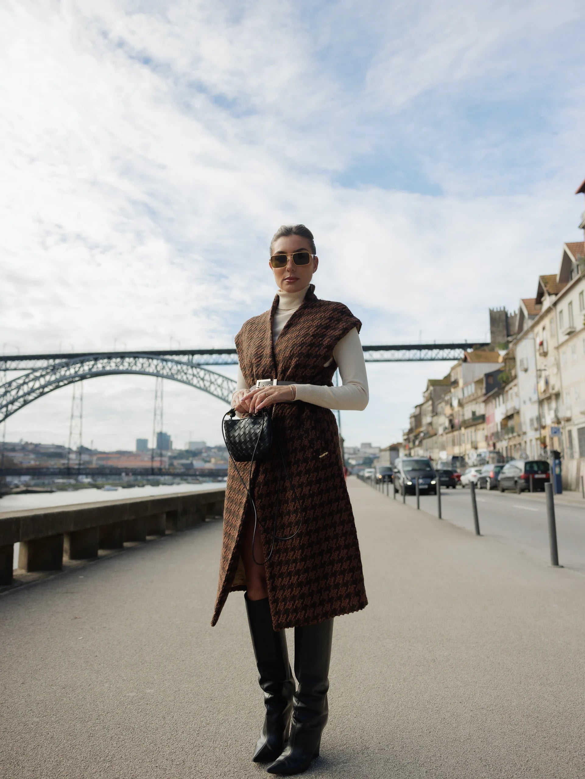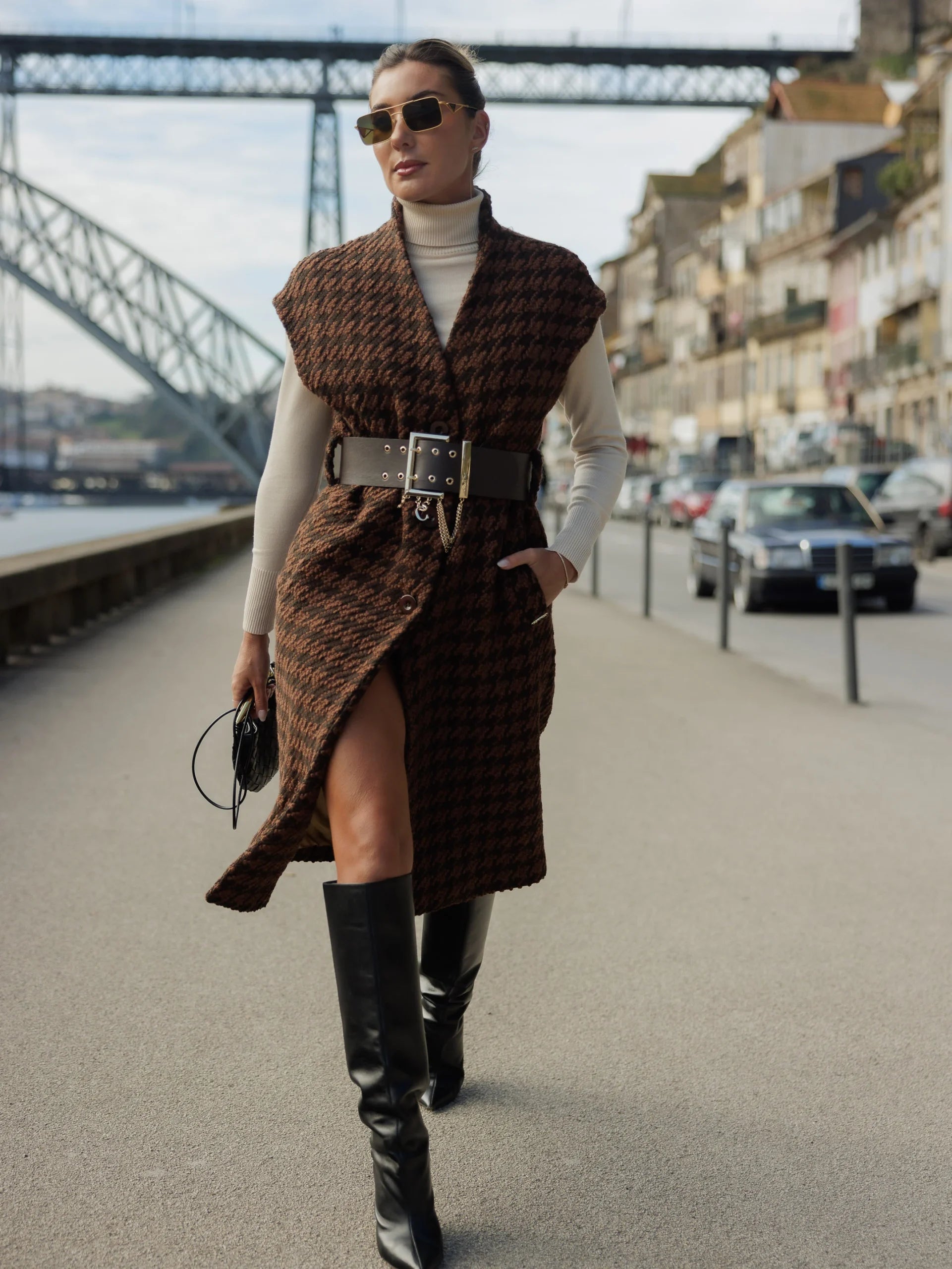 Colete comprido em pied poule com ombro descaído. Possui bolsos quadrados e frente do casaco a aperta com botões. Acompanha com cinto fantasia personalizado. O fitting da peça é solto.