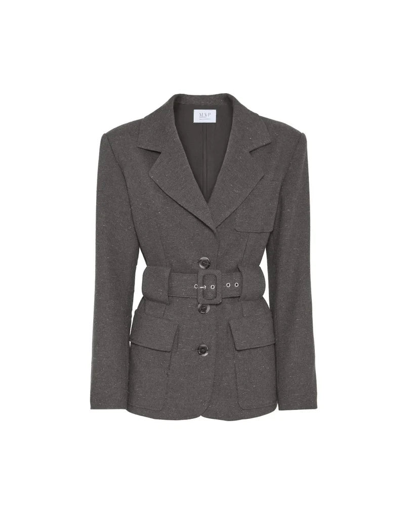 Casaco em tweed com três botões de chifre. Modelo militar com três bolsos e cinto com fivela forrada em tecido que realça a cintura.