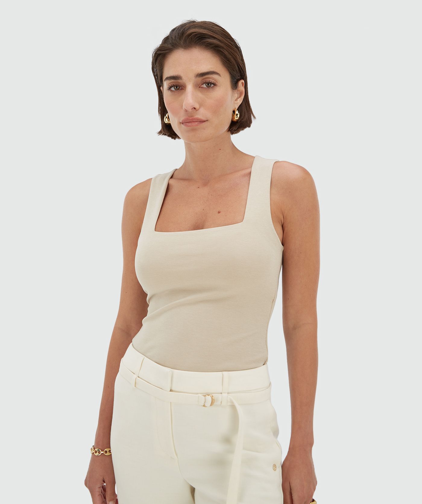 O top feminino Linde em Bege Claro é confeccionado em uma mistura de algodão com elastano, o que o torna muito confortável de usar. Detalhes exclusivos incluem o decote quadrado e o logotipo bordado nas costas. Este top slim fit bege claro é um item básico perfeito para combinar com qualquer look.