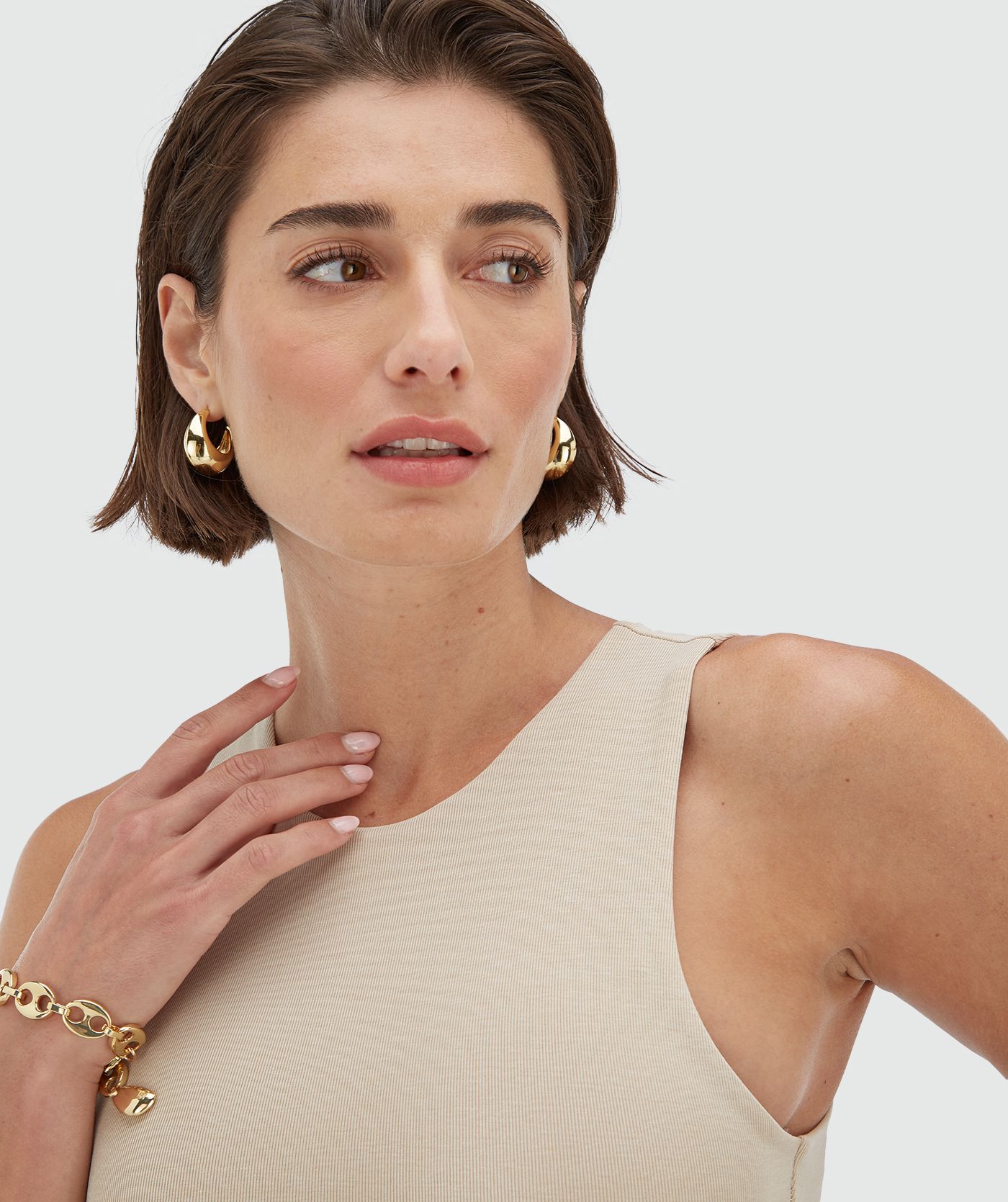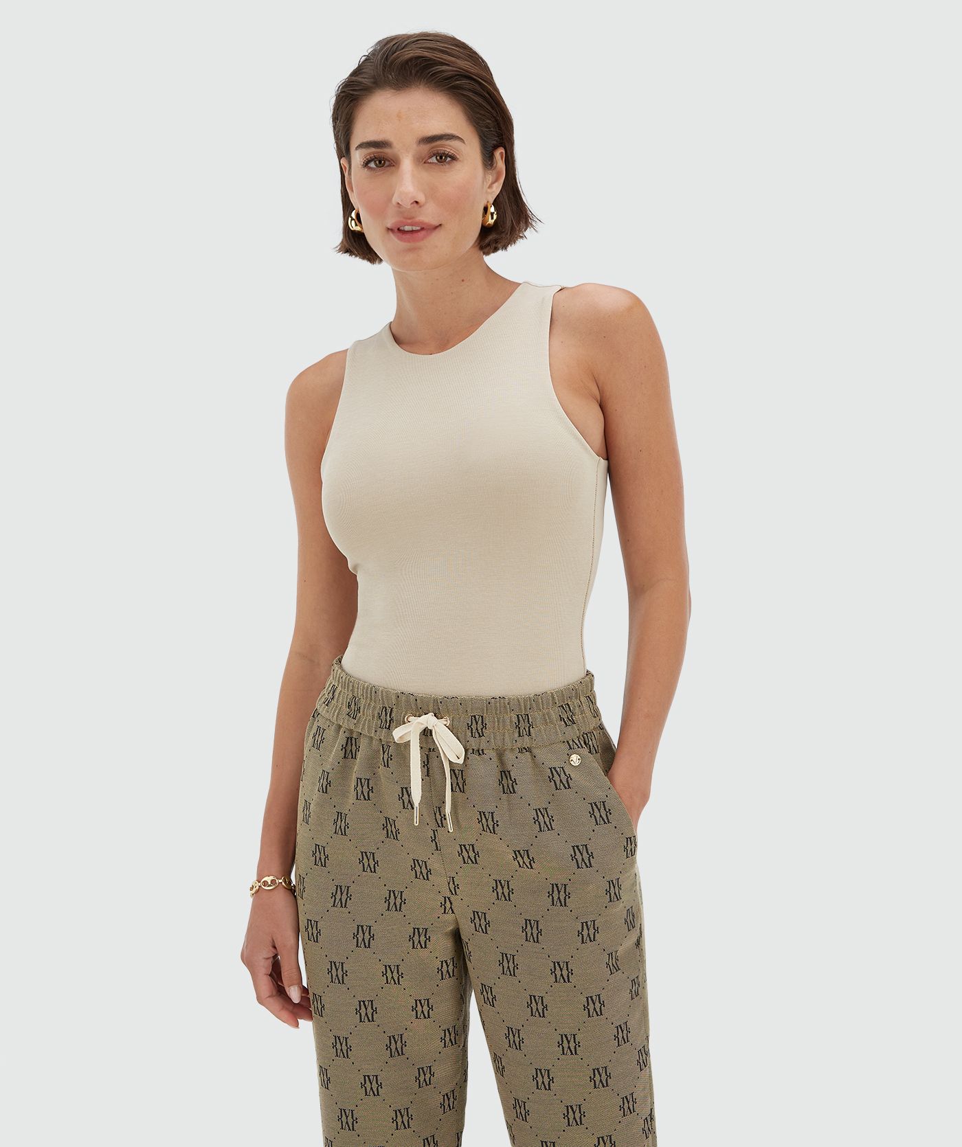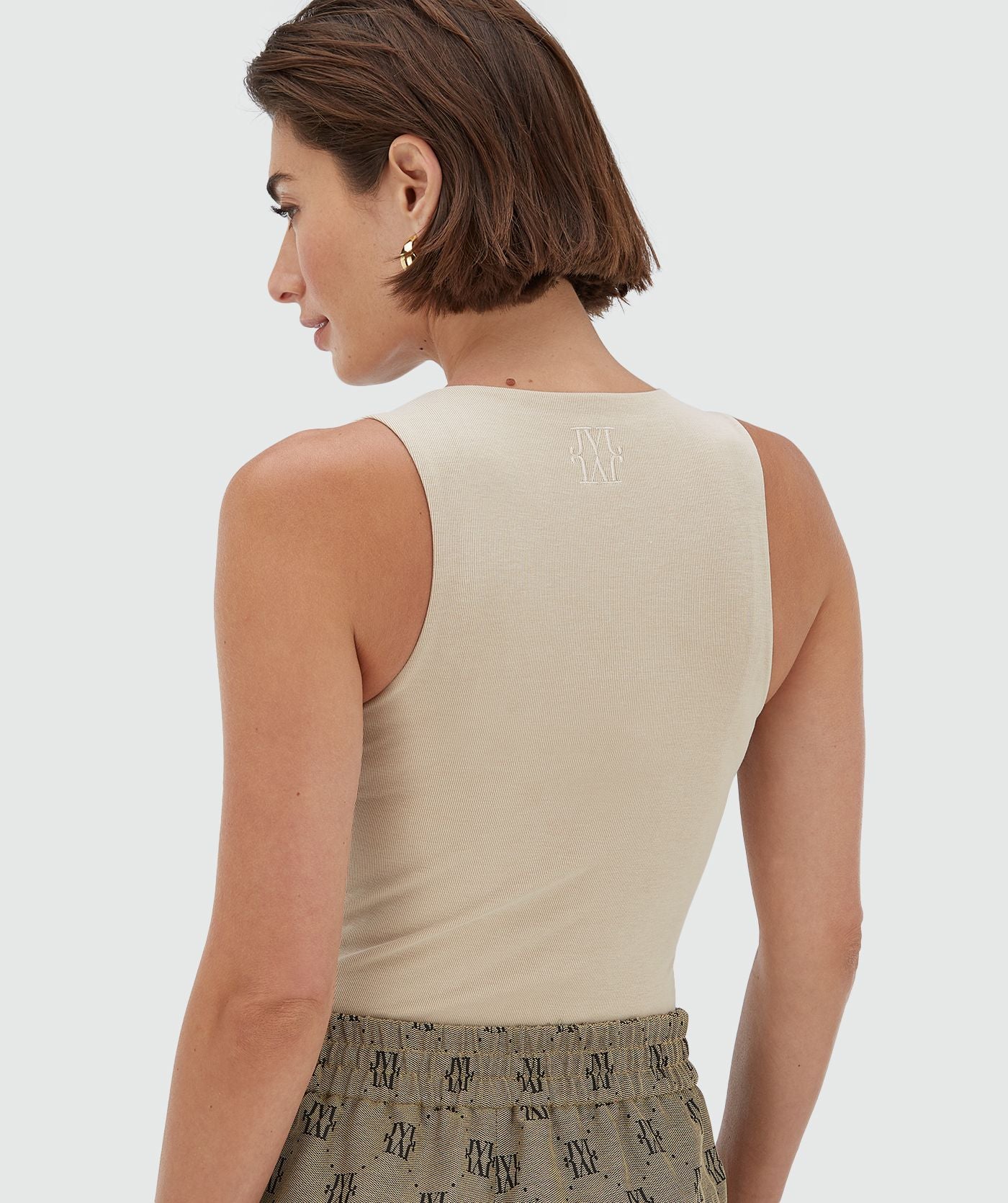 O body feminino Lotta na cor Bege Claro é super justo, confeccionado em jersey macio com elastano. O body fio dental fecha com botões de pressão na parte inferior. Um detalhe exclusivo é o discreto logotipo JOSH V bordado nas costas. O body sem mangas é perfeito para usar com um terno feminino ou jeans.