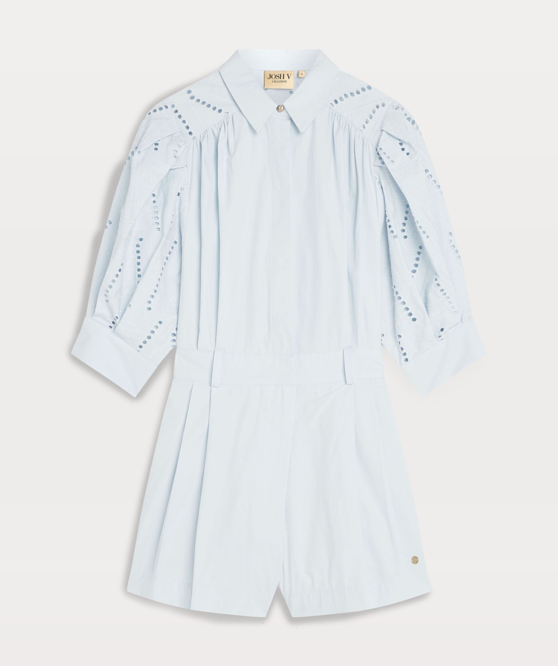 O macacão JOSH V Wynne em Fresh Blue tem um ajuste regular. Único no traje de brincar é a bela manga de sopro de bordado. O macacão azul claro é feito de algodão de alta qualidade e terminado com botões da marca JOSH V. Combine o macacão com sandálias para a praia ou bombas para um jantar. Nota: o macacão é entregue sem cinto.