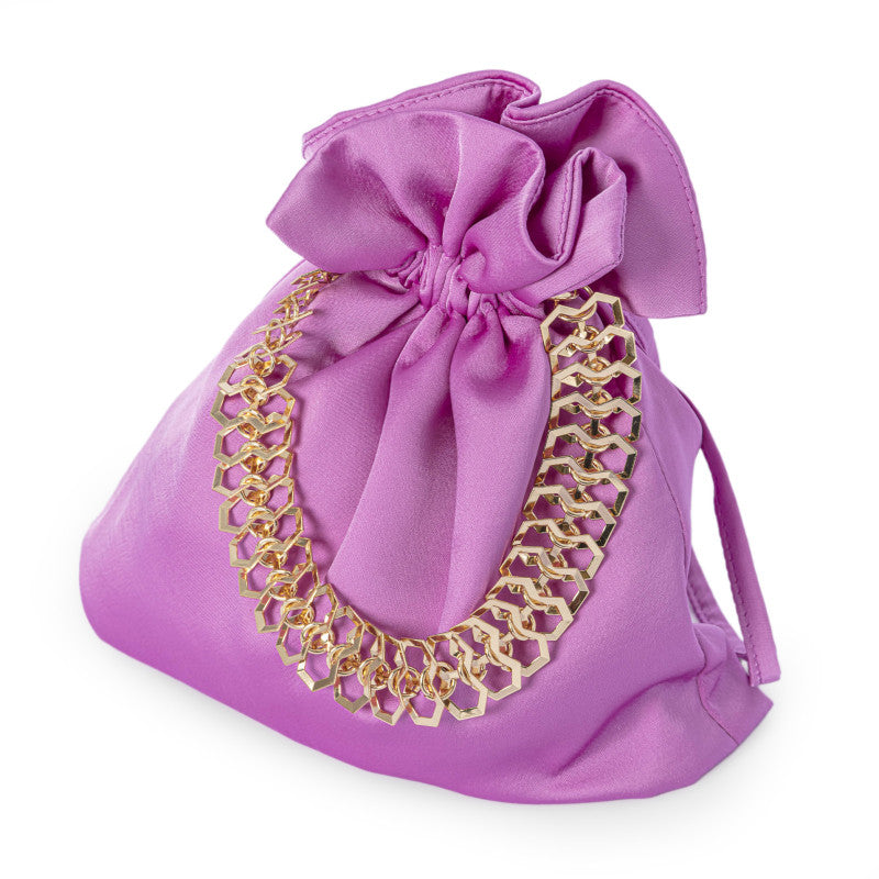 Mala de mão de cetim na cor violeta com alça em correnre dourada.