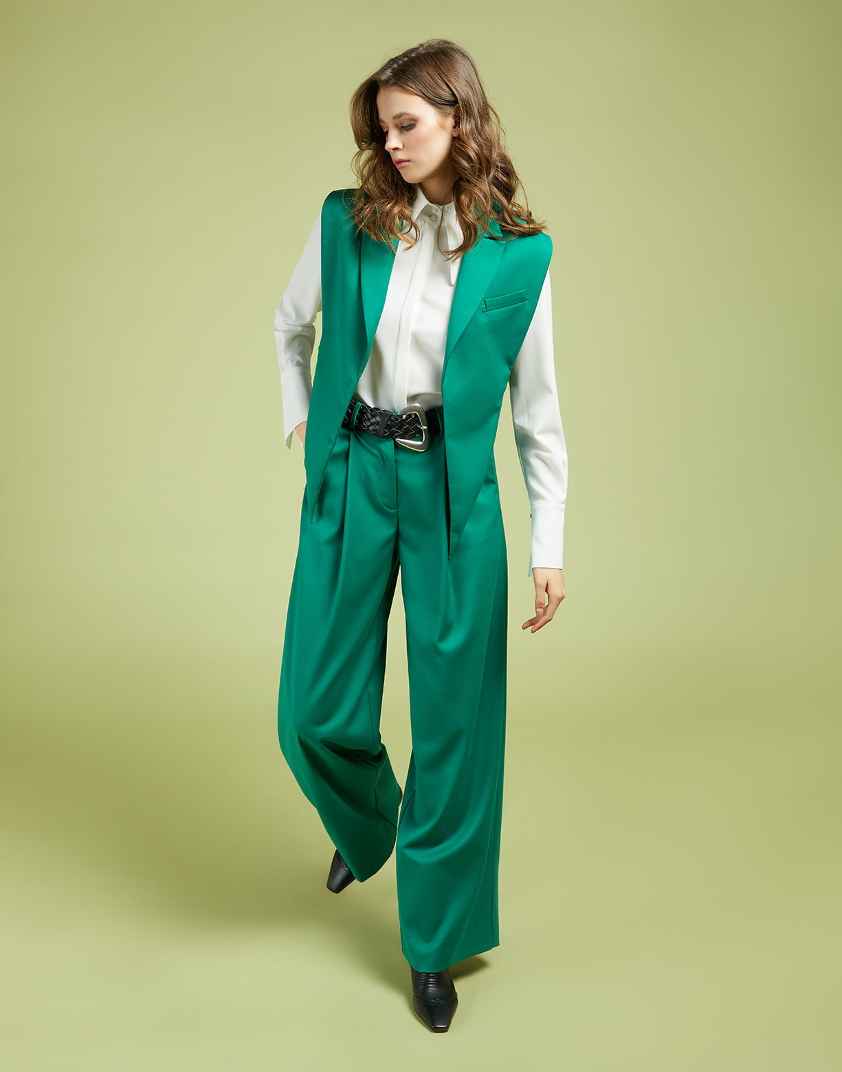 Pantalon en tissu semi-satiné. Se porte avec un gilet à pointes.