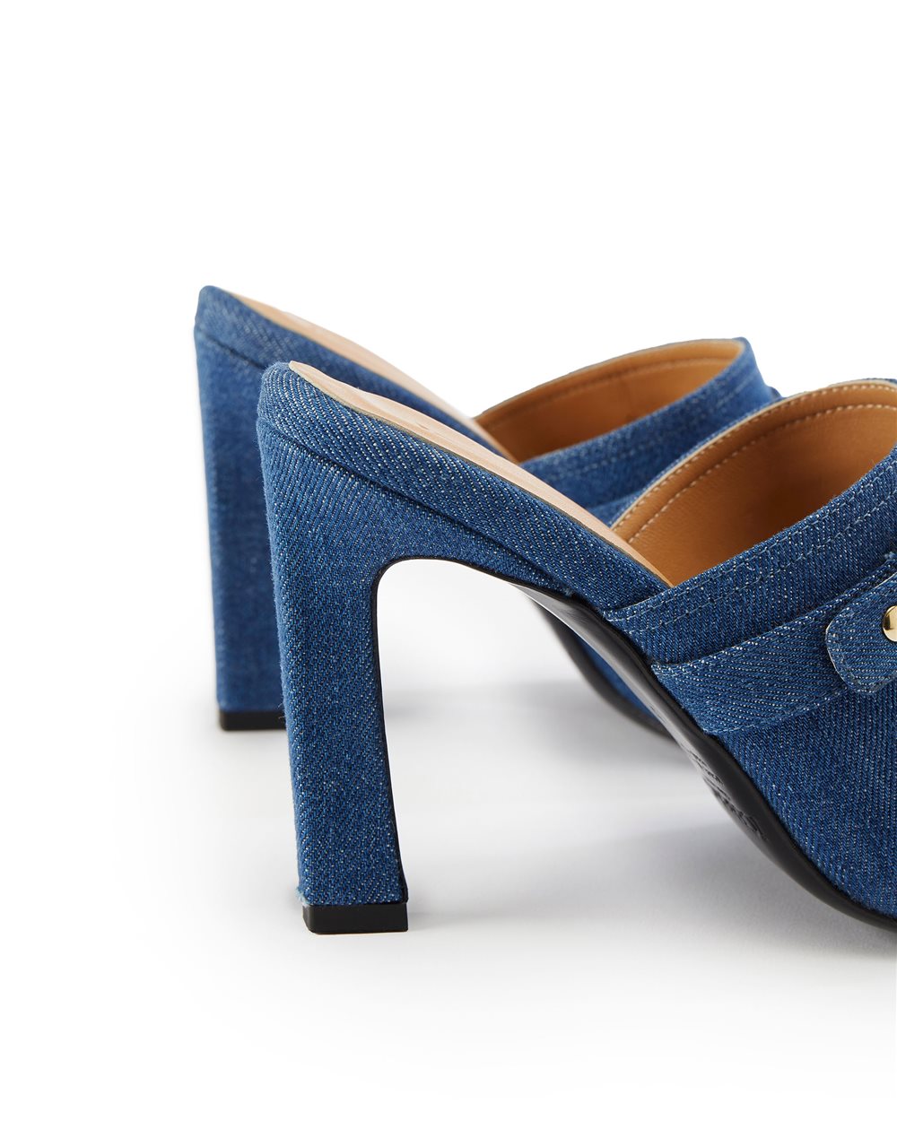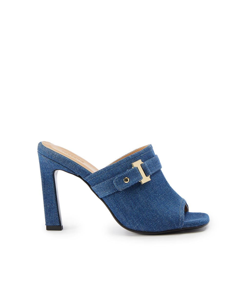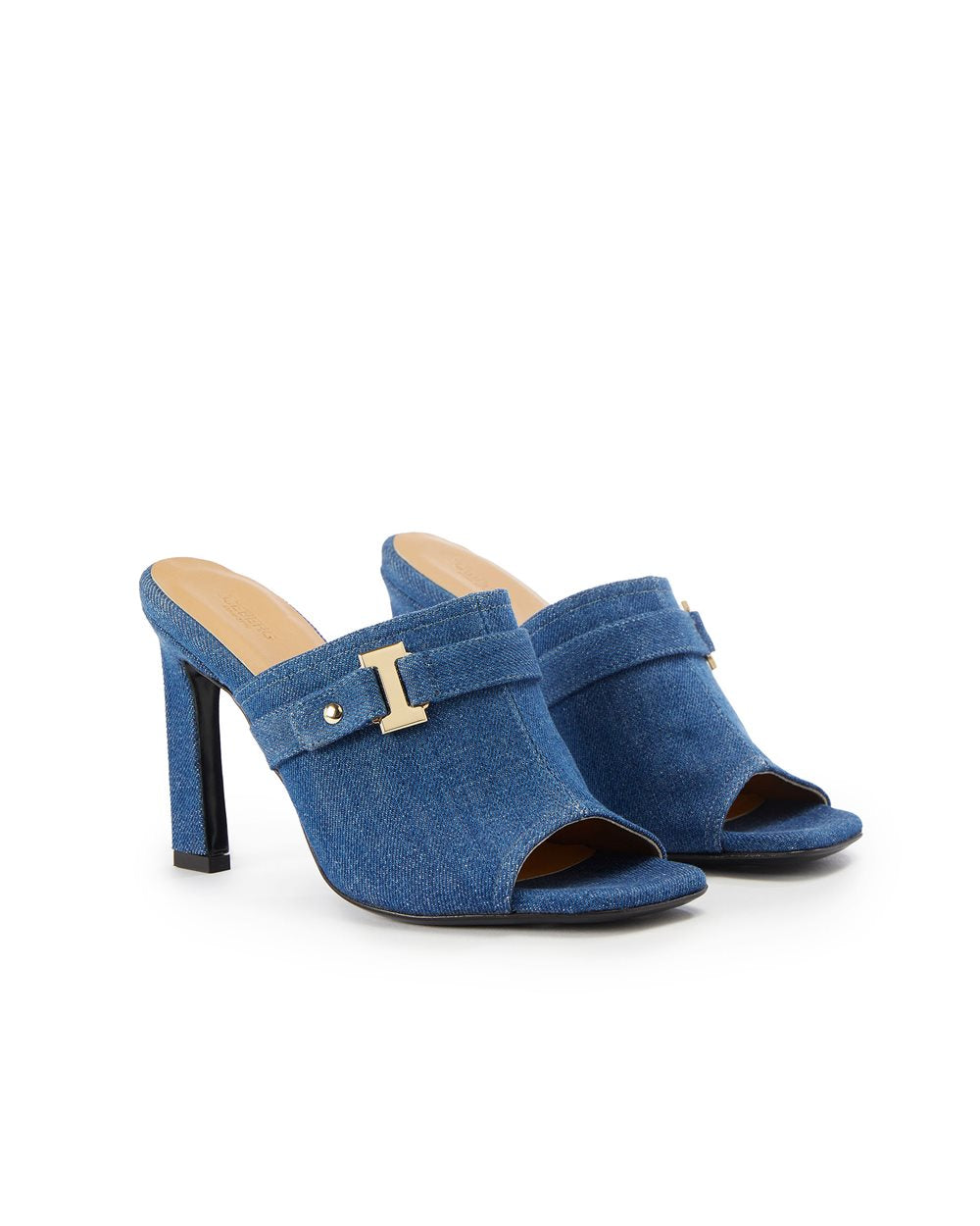 Sabot de dedo do pé aberto com salto, completamente coberto de jeans e alça com fivela de metal dourado na forma do monograma do logotipo Iceberg. Perfeito para um visual casual e chique com um toque de originalidade.